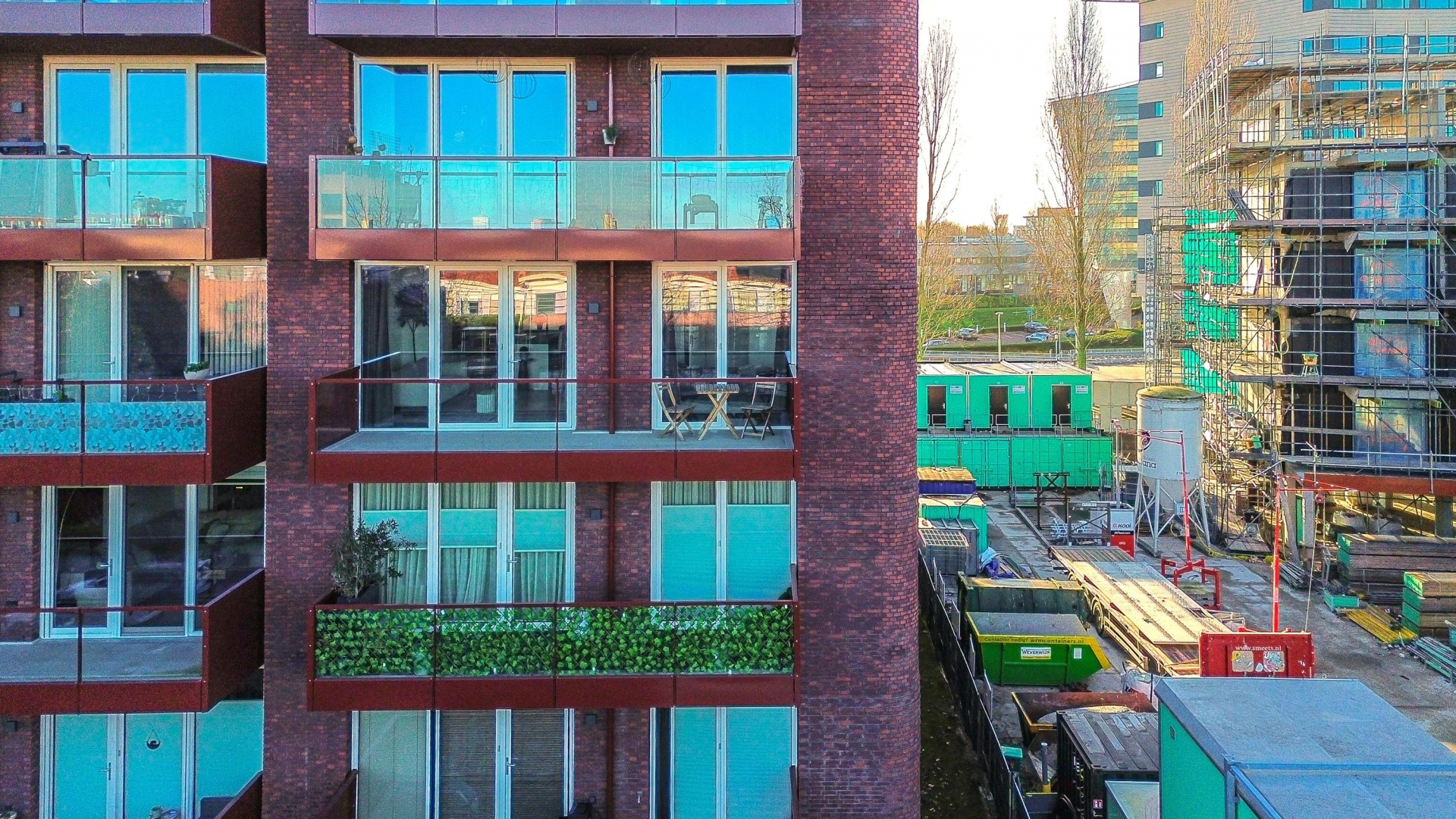 Voor de entree van het appartement is ruimte voor een zitje met uitzicht op het binnenterrein van het complex, een fijne plek om even buiten te zitten.