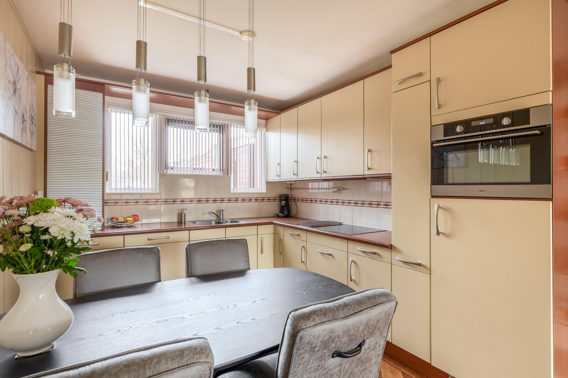 Aan de voorzijde van het huis vind je een gezellige keuken. Deze is praktisch opgezet en biedt voldoende plek voor een grote eettafel. Ideaal voor een druk gezinsleven, huiswerkmomenten of lange diners met vrienden. De keuken zelf is netjes afgewerkt en voorzien van veel werk- en kastruimte, en natuurlijk de nodige inbouwapparatuur. De sfeer is warm en verzorgd; een plek waar je met gemak je dagelijkse ritme vindt.