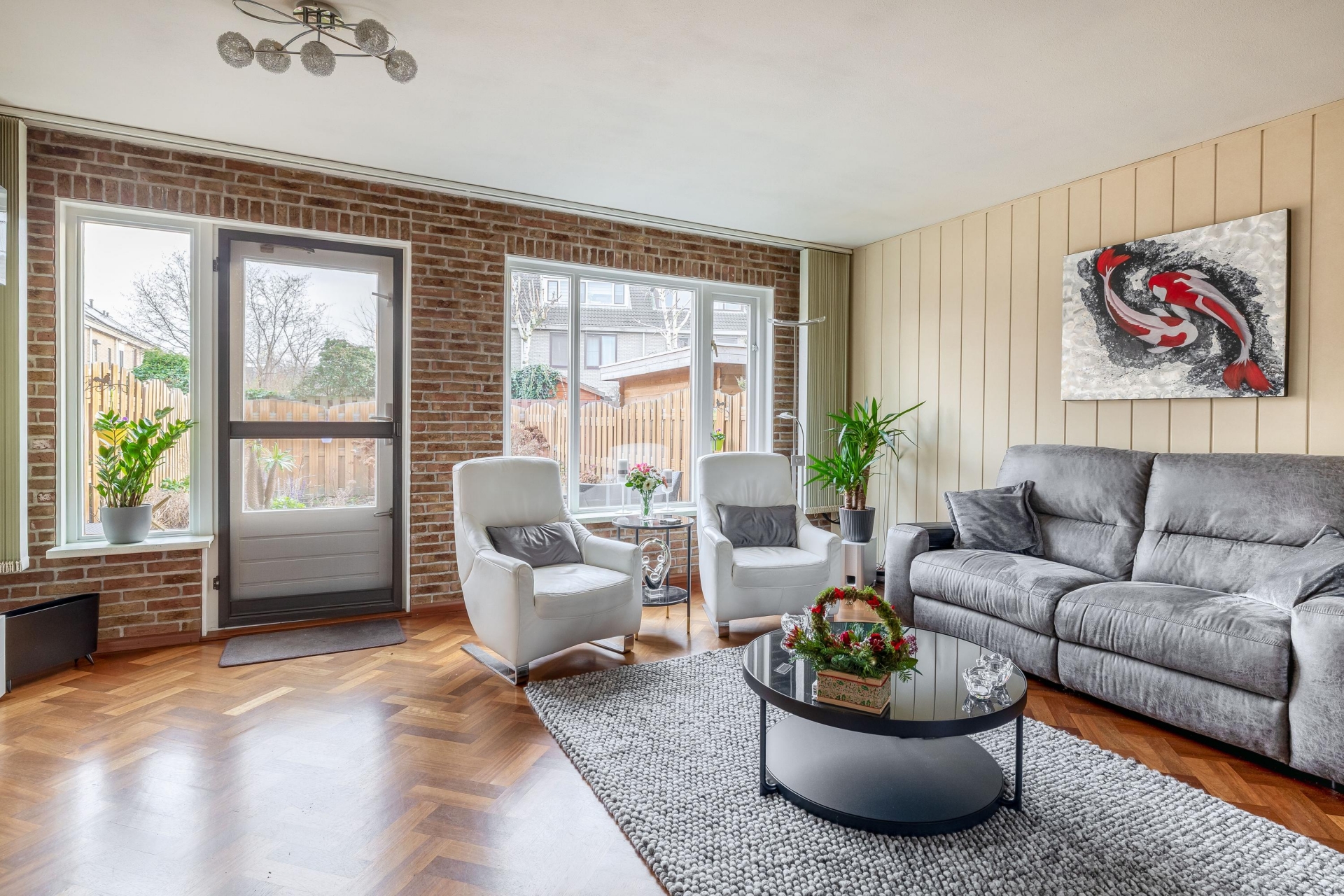 De woonkamer is een prettige, lichte ruimte dankzij de grote ramen en het directe contact met de tuin. De warme houten vloer, het neutrale kleurgebruik en de open indeling zorgen voor een rustige sfeer. Hier geniet je van een kop koffie in het ochtendzonnetje of een borrel met vrienden aan het einde van de dag. De openslaande deur naar buiten maakt het plaatje compleet: in de zomer loopt het binnen- en buitenleven moeiteloos in elkaar over.