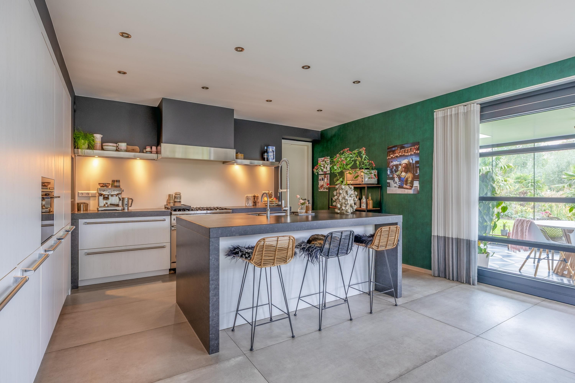 De woonkeuken is een droom voor kookliefhebbers: modern, ruim, voorzien van een royaal eiland en hoogwaardige inbouwapparatuur, zoals het 6 pits Viking fornuis met oven. Aansluitend vind je een praktische bijkeuken, toegang tot de inpandige garage én een extra kantoorruimte – ideaal voor werken aan huis. De serre aan de achterzijde maakt het plaatje compleet. Deze ruimte met glazen schuifwanden en daklichten verbindt binnen moeiteloos met buiten en zorgt voor een plek waar je ieder seizoen kunt genieten.
