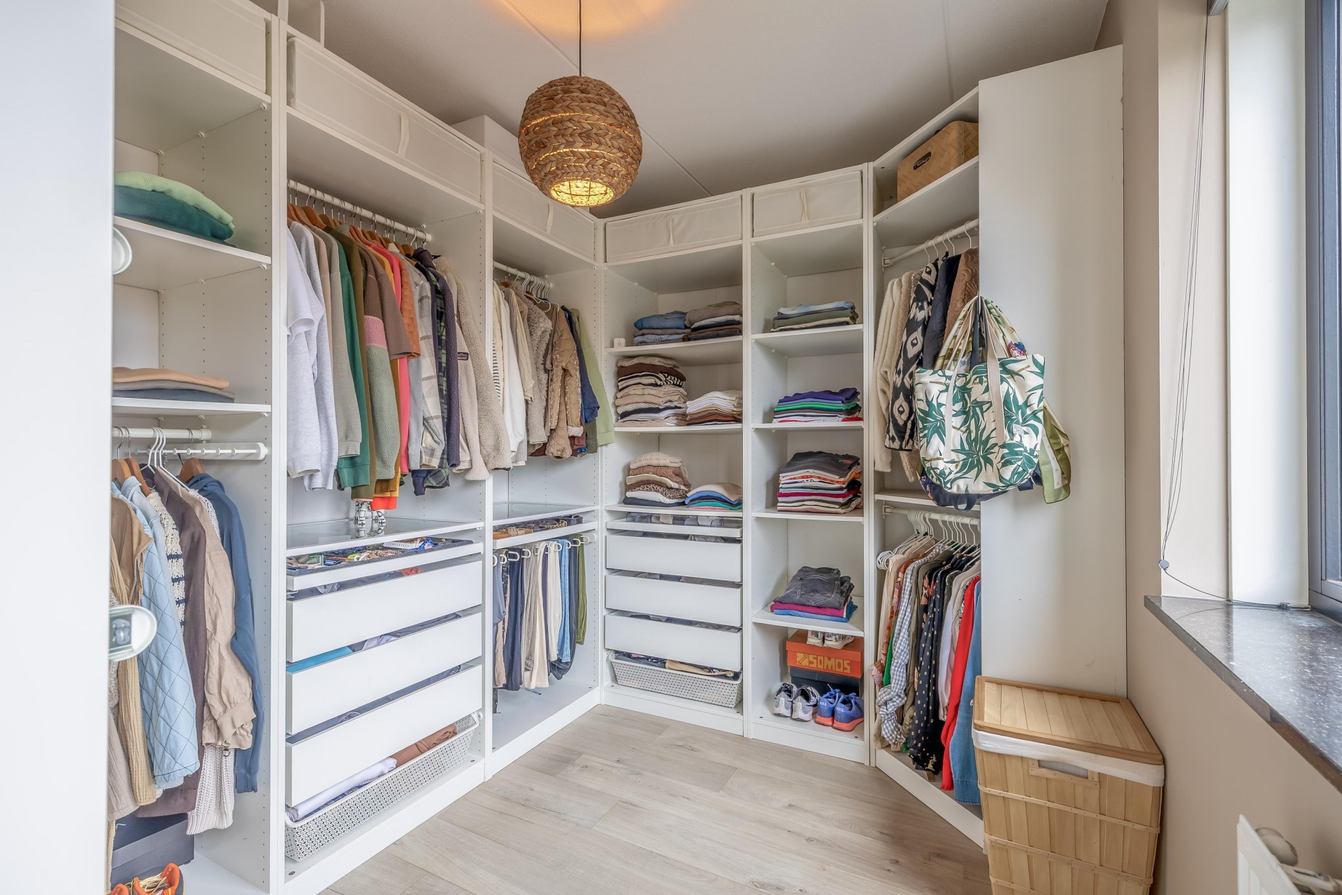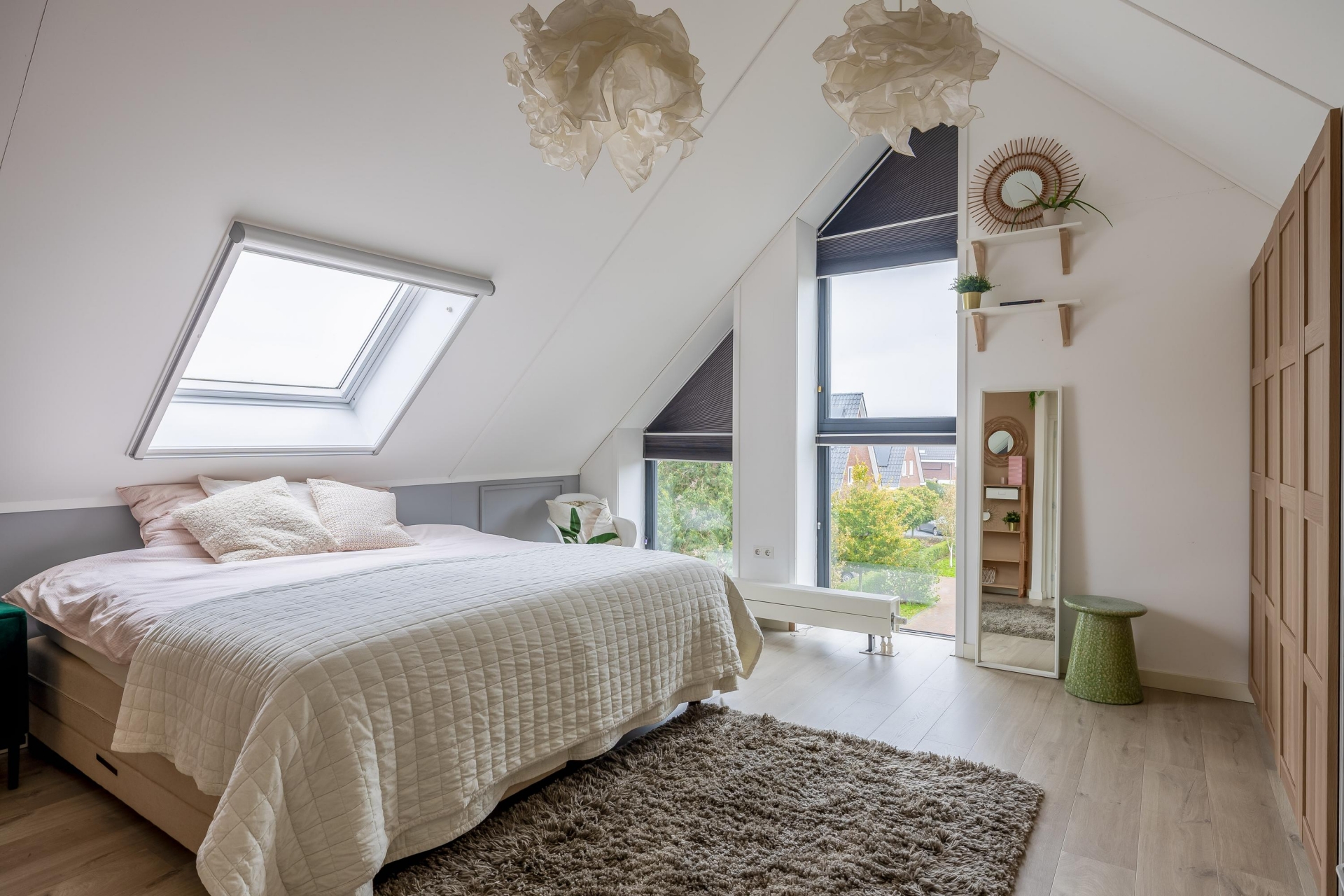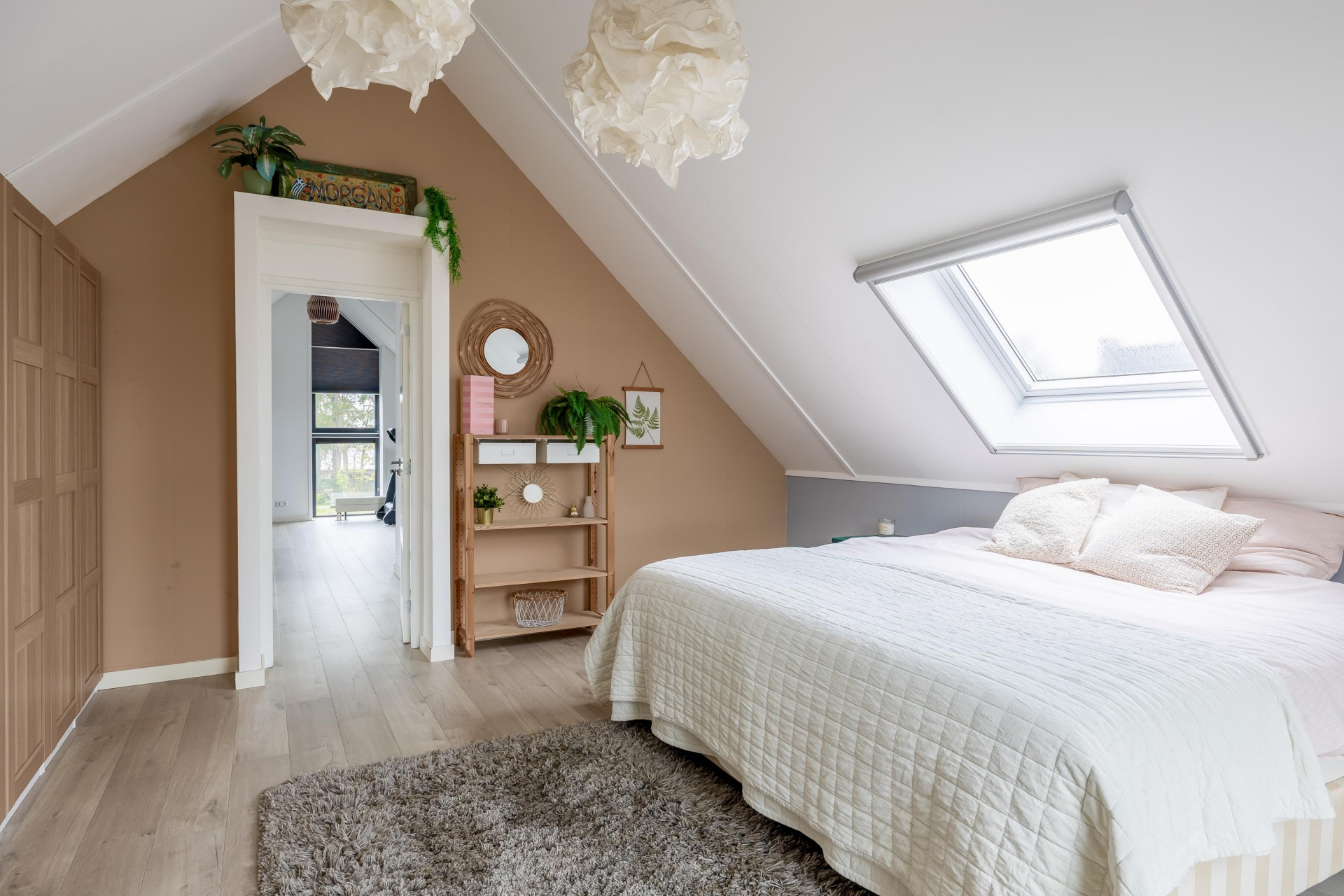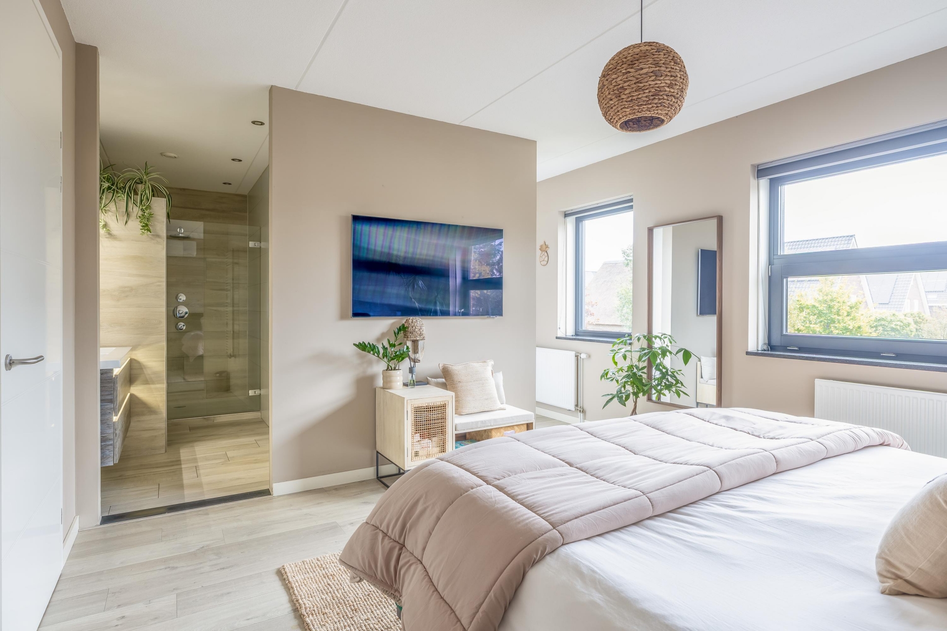 Op de eerste verdieping bevinden zich drie ruime slaapkamers, waaronder een luxe master bedroom met inloopkast én en-suite badkamer. Deze kamer ligt aan de voorzijde van de woning. De tweede slaapkamer heeft ook een ruime inloopkast en geeft toegang tot een extra kamer. Heel eenvoudig is hiervan een derde slaapkamer te maken, door de berging erbij te betrekken en de opening met de andere slaapkamer dicht te maken.