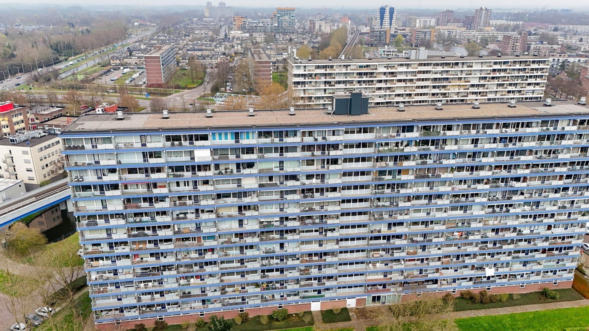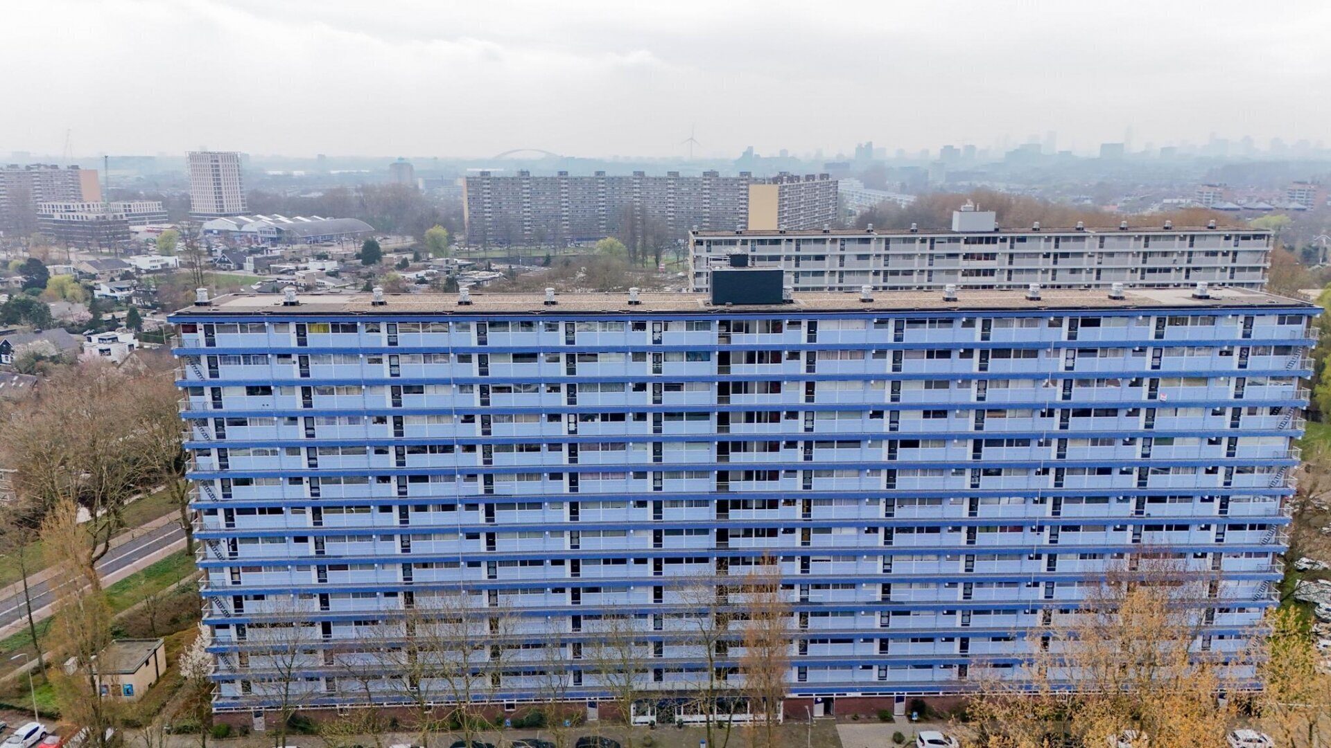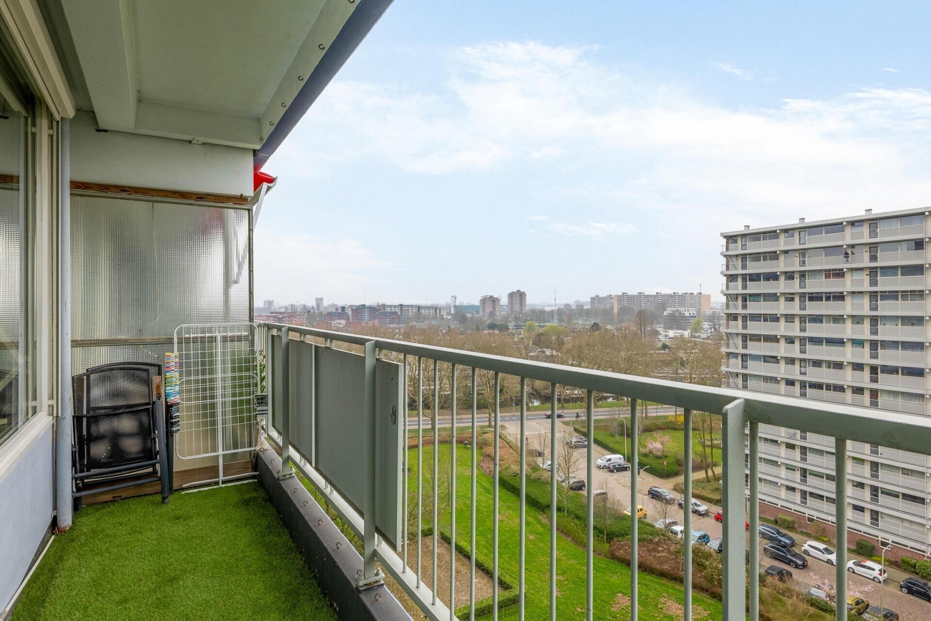 Centrale ingang van het complex met de bergingen, brievenbussen en de lift welke je naar de 10e verdieping brengt. Aan de voorzijde van het complex is de entree, waardoor je meteen in de keuken staat. Vanuit de hal zijn de vertrekken toegankelijk, zoals de slaapkamers, de badkamer, het toilet en een vaste kast. De 2 slaapkamers hebben een oppervlakte van 6 en 11 m² en zijn gelegen aan de voorzijde van het complex. Centraal is de volledig betegelde badkamer te vinden, welke voorzien is van een ligbad met douchefunctie en een wastafel. Aan de achterzijde is de woning brede woonkamer te vinden, welke ongeveer 40 m² is. Doordat de achtergevel bestaat uit raampartijen heb je veel daglicht toetreding en vanuit de woonkamer een geweldig uitzicht over de wijk. Ook het balkon is toegankelijk vanuit de woonkamer. Deze is zonnig gesitueerd op het zuidwesten, wat het mogelijk maakt om lang van de zon te kunnen genieten. Ook hier kan je de hele dag genieten van het uitzicht.