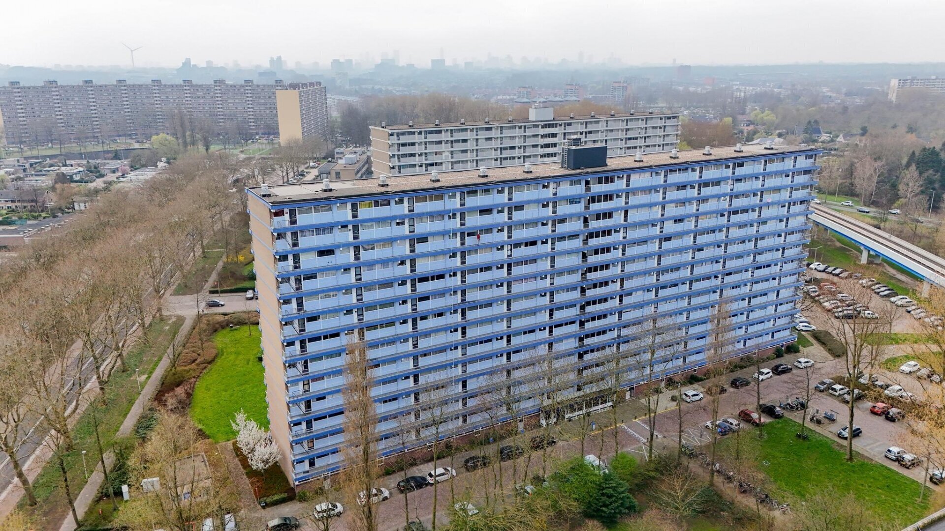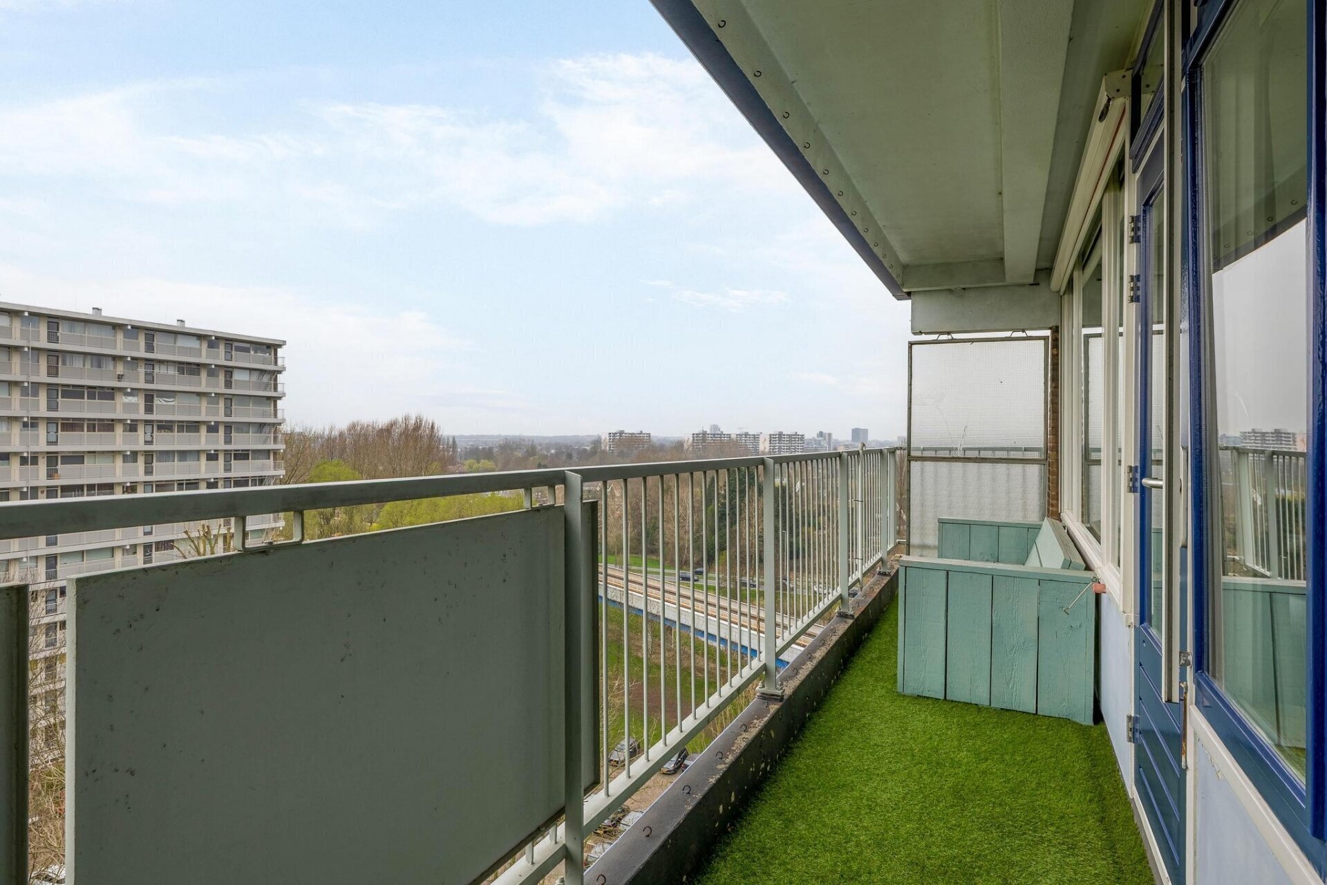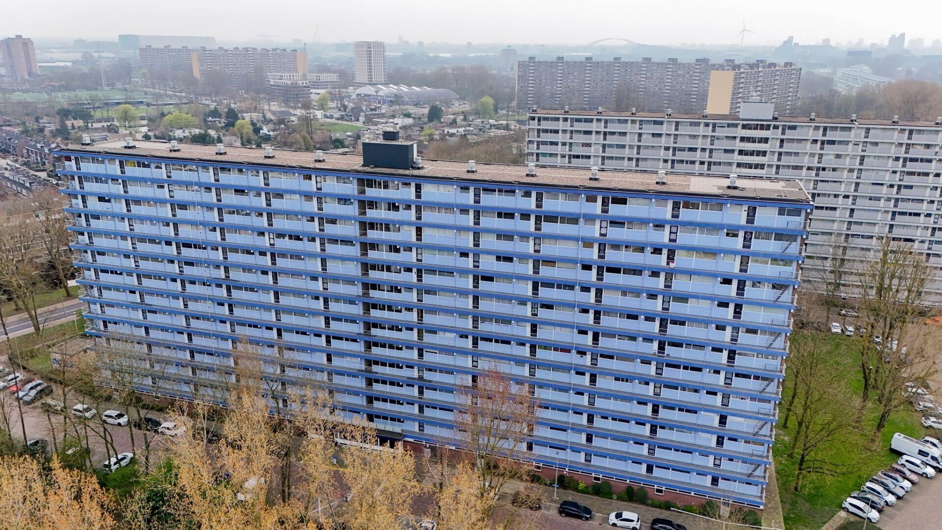 Centrale ingang van het complex met de bergingen, brievenbussen en de lift welke je naar de 10e verdieping brengt. Aan de voorzijde van het complex is de entree, waardoor je meteen in de keuken staat. Vanuit de hal zijn de vertrekken toegankelijk, zoals de slaapkamers, de badkamer, het toilet en een vaste kast. De 2 slaapkamers hebben een oppervlakte van 6 en 11 m² en zijn gelegen aan de voorzijde van het complex. Centraal is de volledig betegelde badkamer te vinden, welke voorzien is van een ligbad met douchefunctie en een wastafel. Aan de achterzijde is de woning brede woonkamer te vinden, welke ongeveer 40 m² is. Doordat de achtergevel bestaat uit raampartijen heb je veel daglicht toetreding en vanuit de woonkamer een geweldig uitzicht over de wijk. Ook het balkon is toegankelijk vanuit de woonkamer. Deze is zonnig gesitueerd op het zuidwesten, wat het mogelijk maakt om lang van de zon te kunnen genieten. Ook hier kan je de hele dag genieten van het uitzicht.