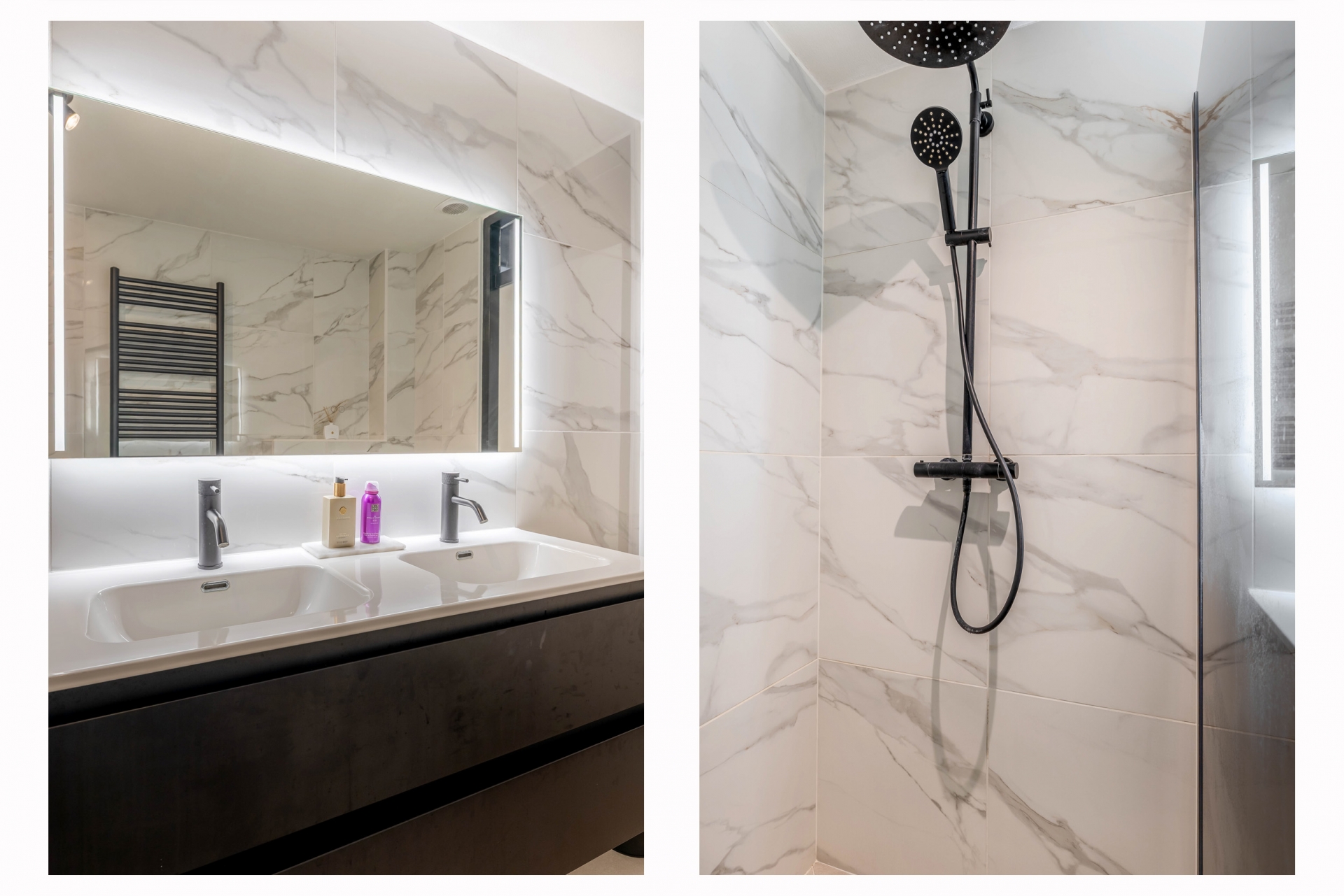 Op de eerste verdieping vind je vier volwaardige slaapkamers. De grootste slaapkamer ligt aan de achterzijde en biedt uitzicht op de tuin. De recent vernieuwde badkamer is stijlvol betegeld in een moderne marmerlook en voorzien van een dubbele wastafel, inloopdouche met regendouche en designradiator. Alles voelt hier fris en luxe aan.
