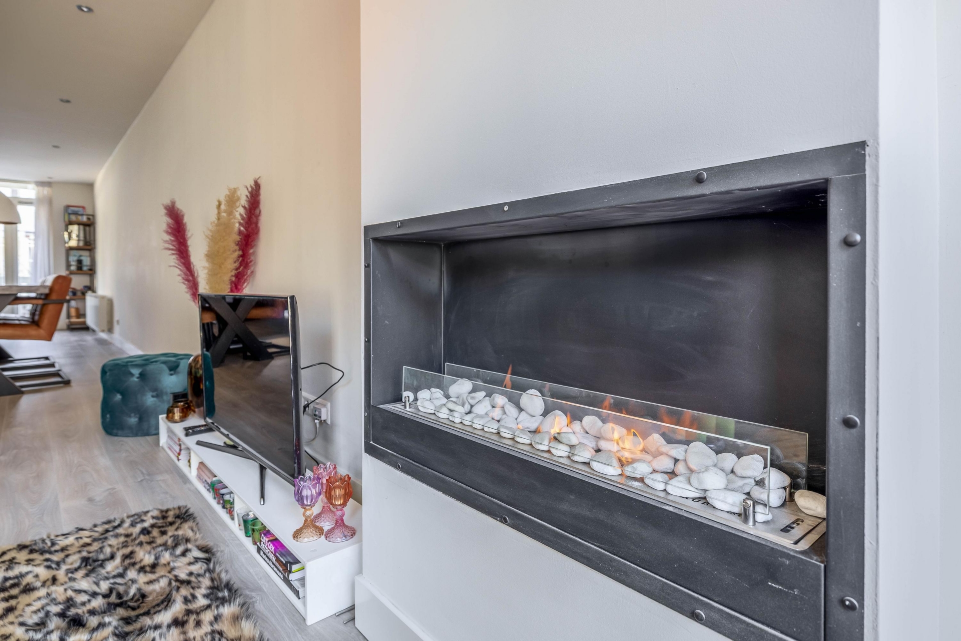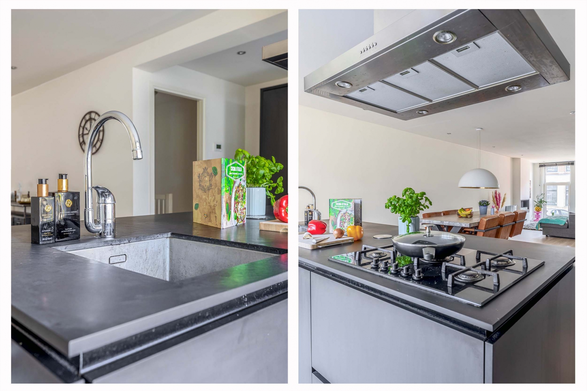 De indrukwekkende woonkamer op de bel-etage strekt zich uit over de volledige diepte van de woning (ruim 12 meter) en biedt een prachtige lichtinval dankzij de grote raampartijen aan de voorzijde. Aan de achterzijde bevindt zich de moderne open keuken, uitgevoerd met een stijlvol kookeiland en een hoogwaardige apparatenwand met Smeg apparatuur. Hier kook je op niveau, met alle benodigde inbouwapparatuur binnen handbereik.