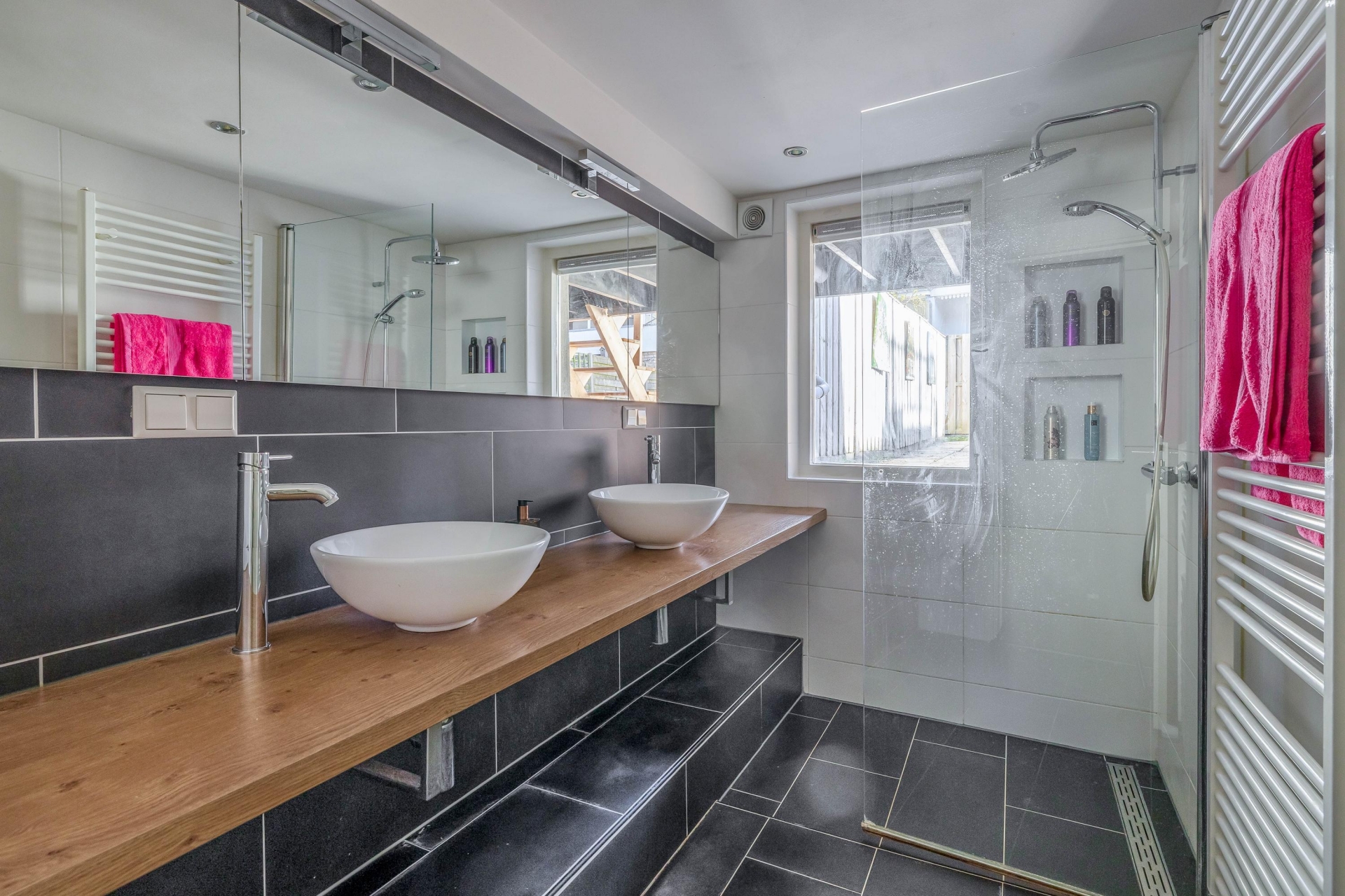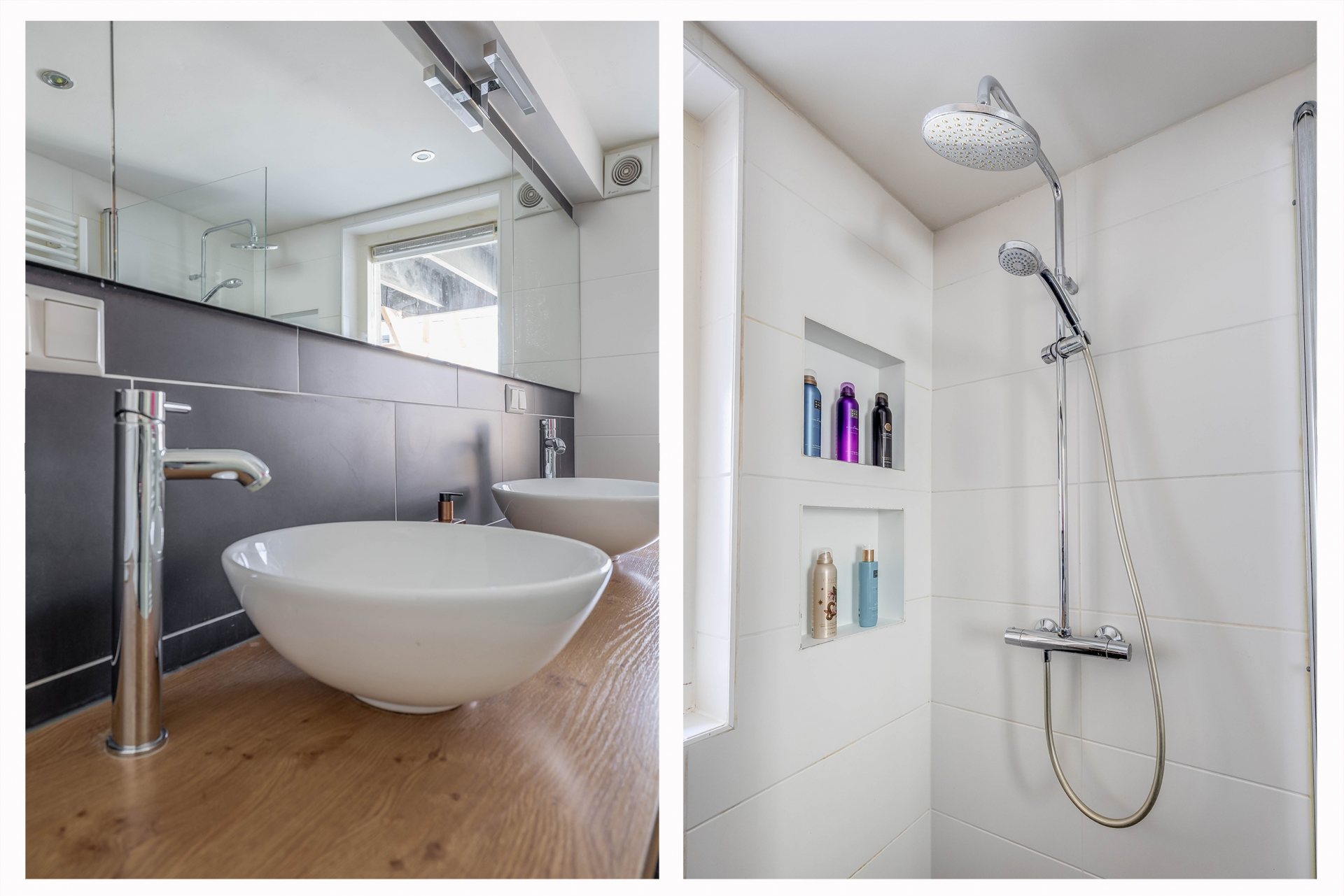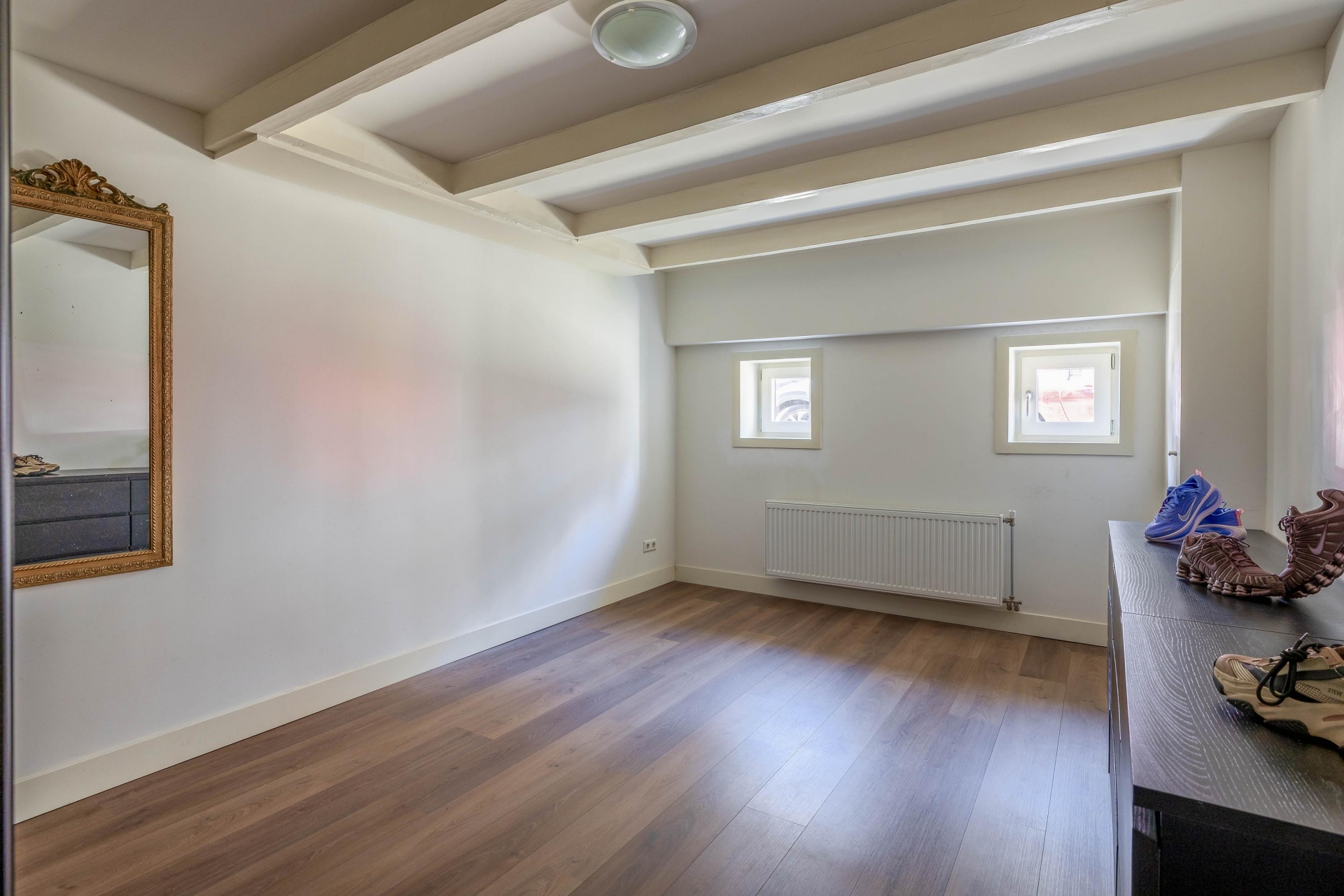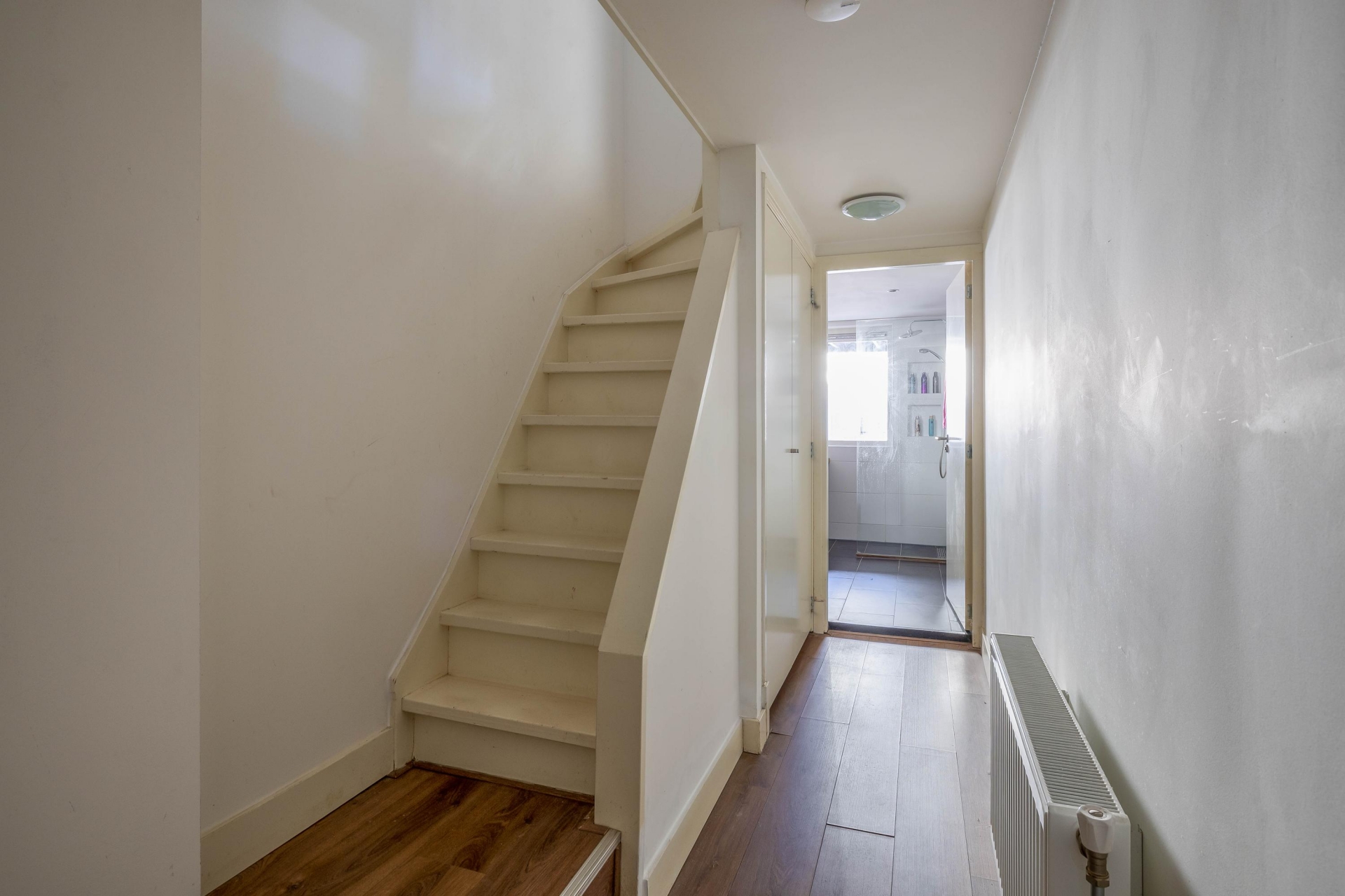 Dankzij de vloerverhoging tijdens de renovatie beschikt het souterrain over een comfortabele stahoogte en is dit een volwaardige woonlaag geworden. Hier bevinden zich twee ruime slaapkamers, en een separate berging, wat onder andere gebruikt kan worden als praktische walk-in-closet. De moderne badkamer is strak afgewerkt en voorzien van een inloopdouche en dubbele wastafel. Daarnaast is er een aparte bergruimte, onder de trap, met opstelplaats voor de wasmachine.