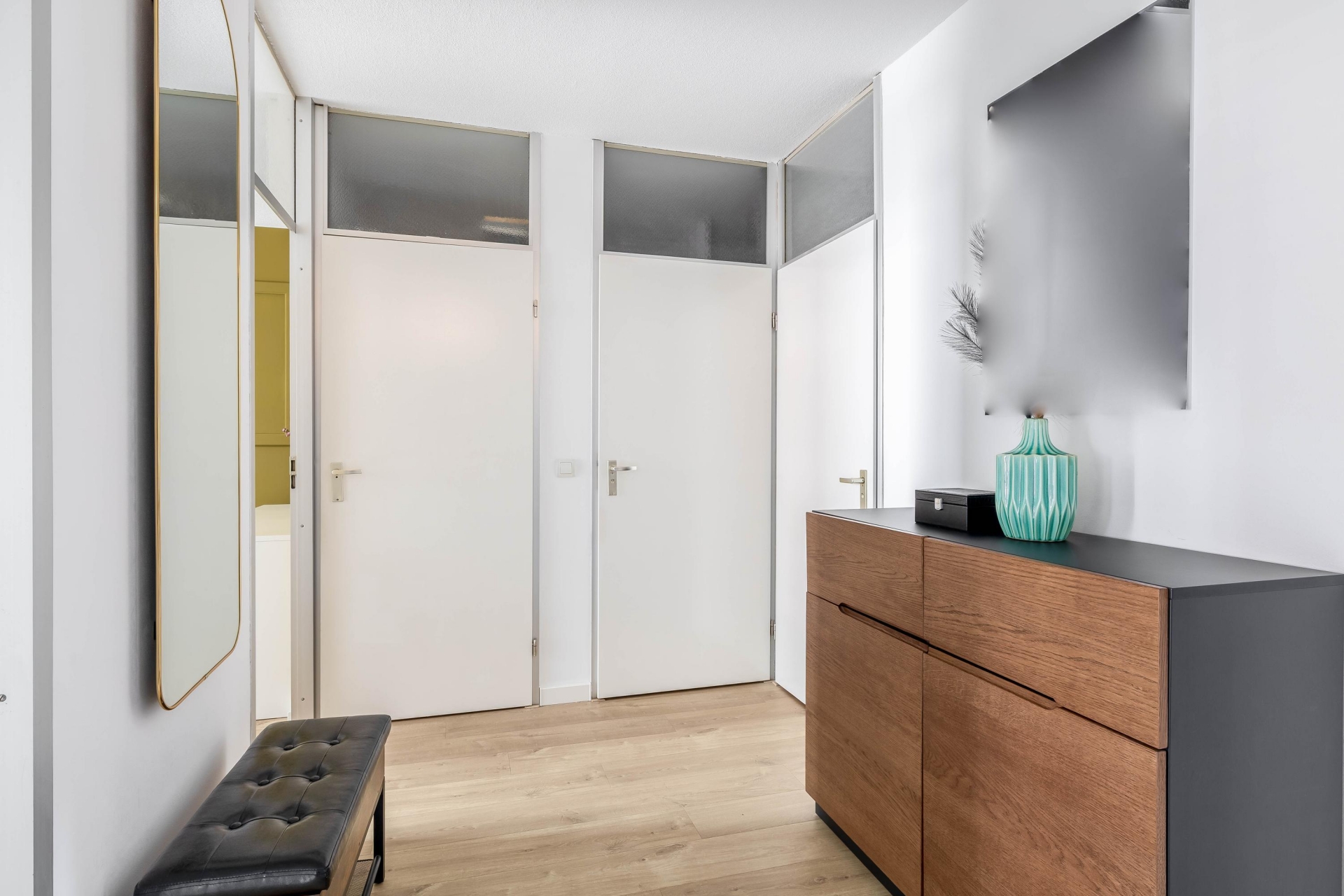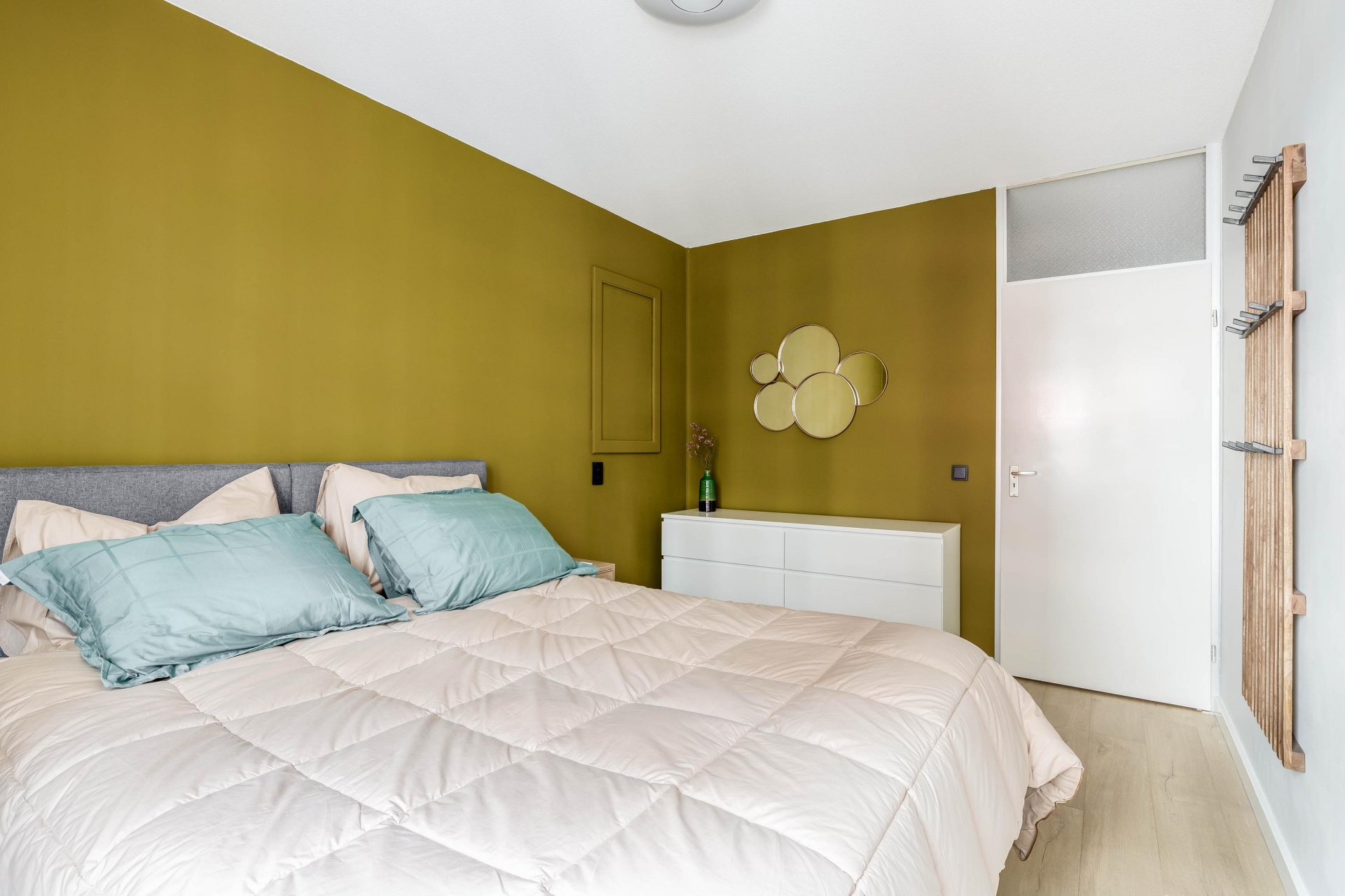 Het appartement beschikt over twee slaapkamers, waarbij de grootste kamer ruim genoeg is voor een tweepersoonsbed en een kledingkast. Deze kamer heeft een rustige uitstraling en is prettig licht, wat het een fijne plek maakt om tot rust te komen.