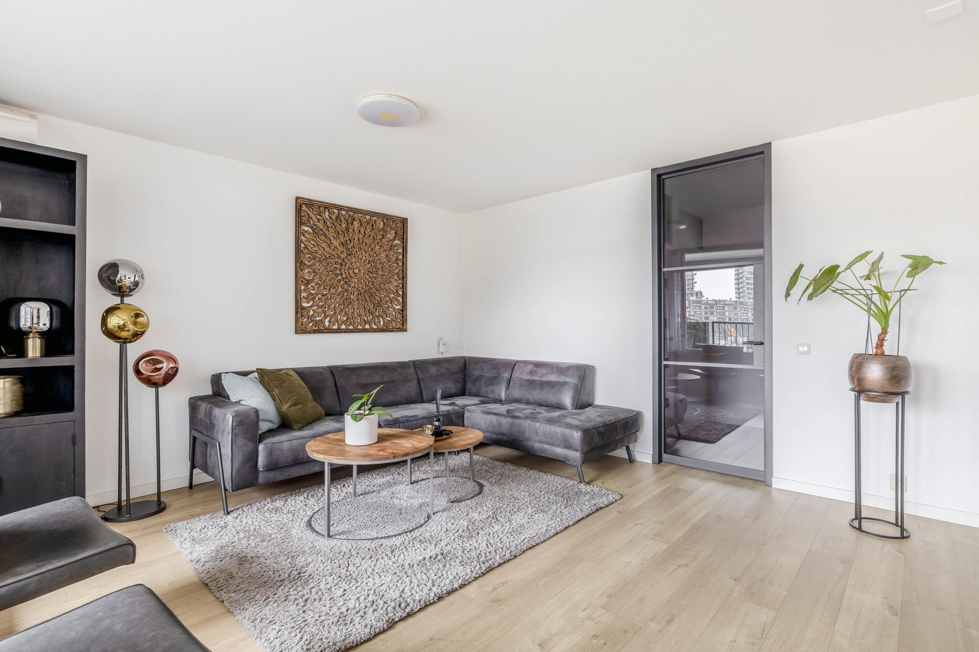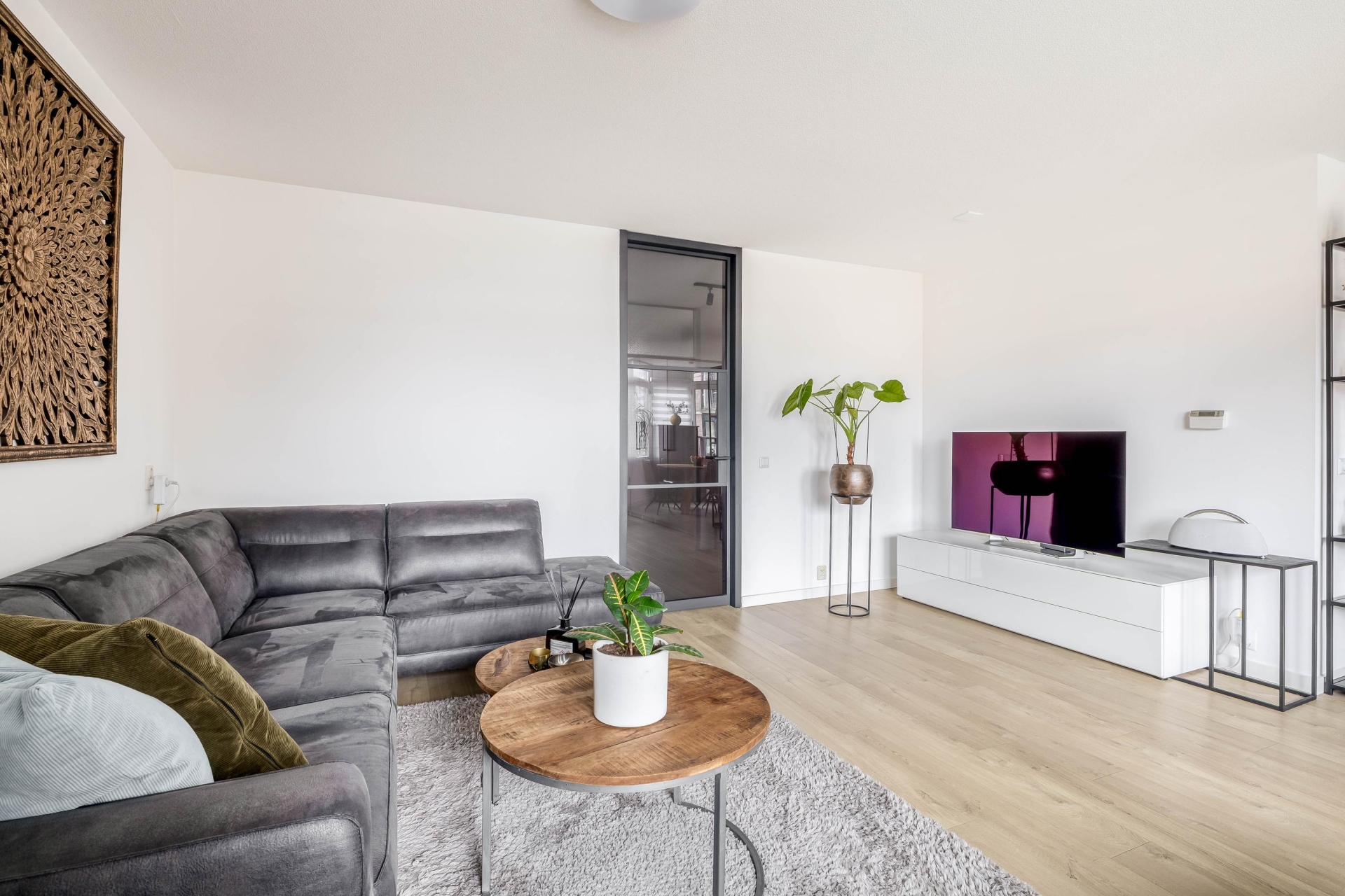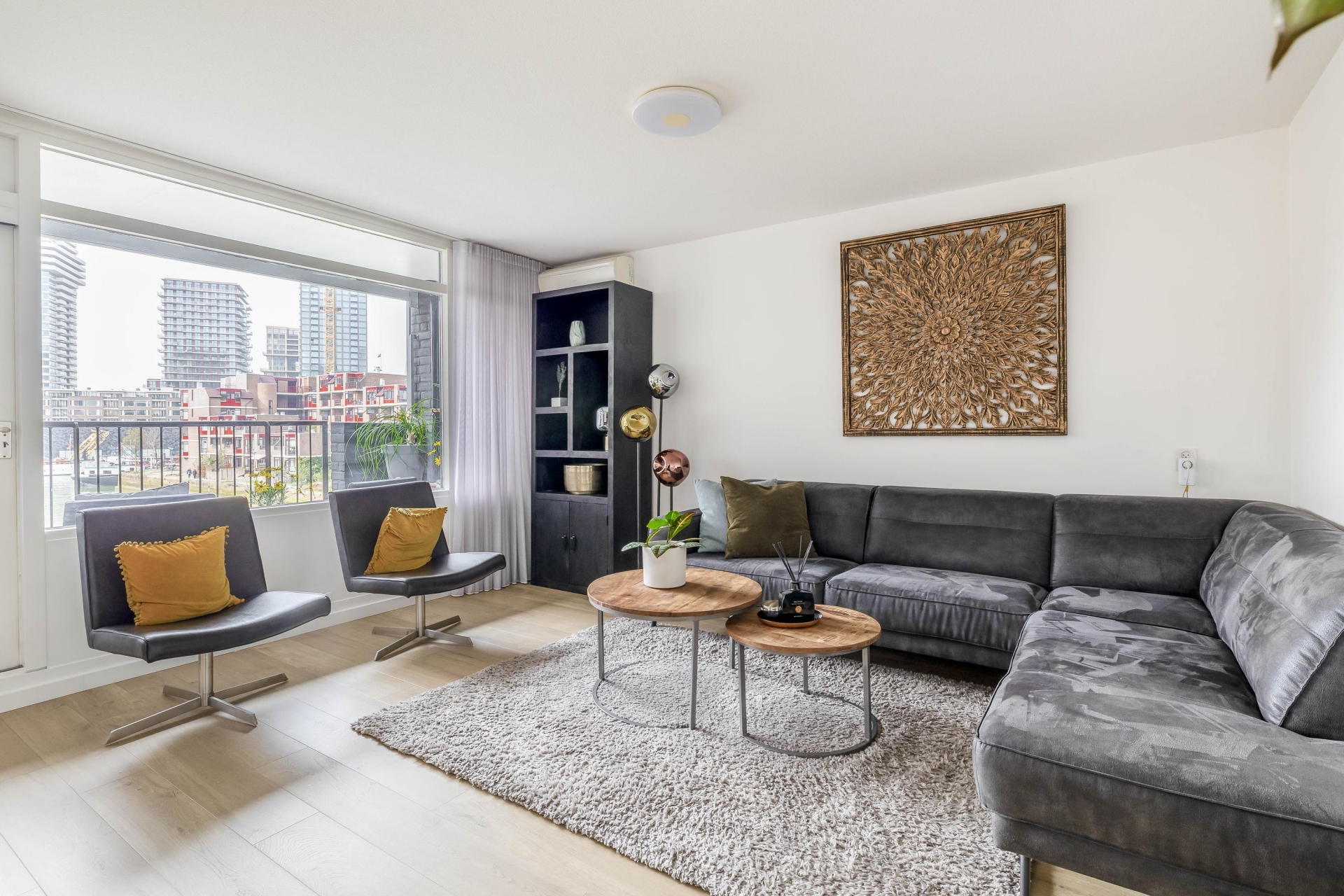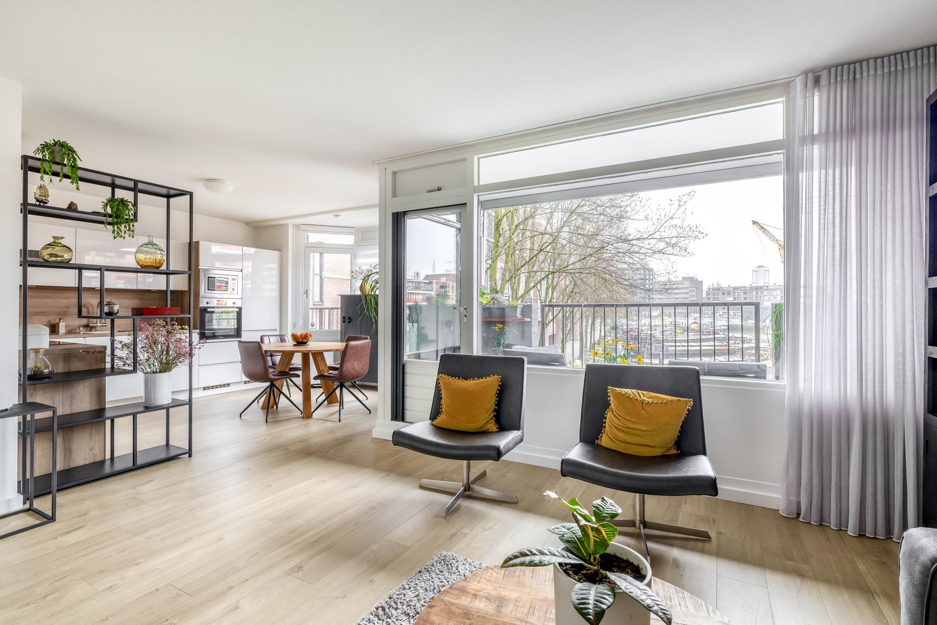 De woonkamer is ruim opgezet en voelt direct comfortabel aan. Grote raampartijen zorgen voor veel daglicht en versterken het gevoel van ruimte. Vanuit de zithoek kijk je uit over het water en de omliggende bebouwing, wat elk moment van de dag weer anders aanvoelt.