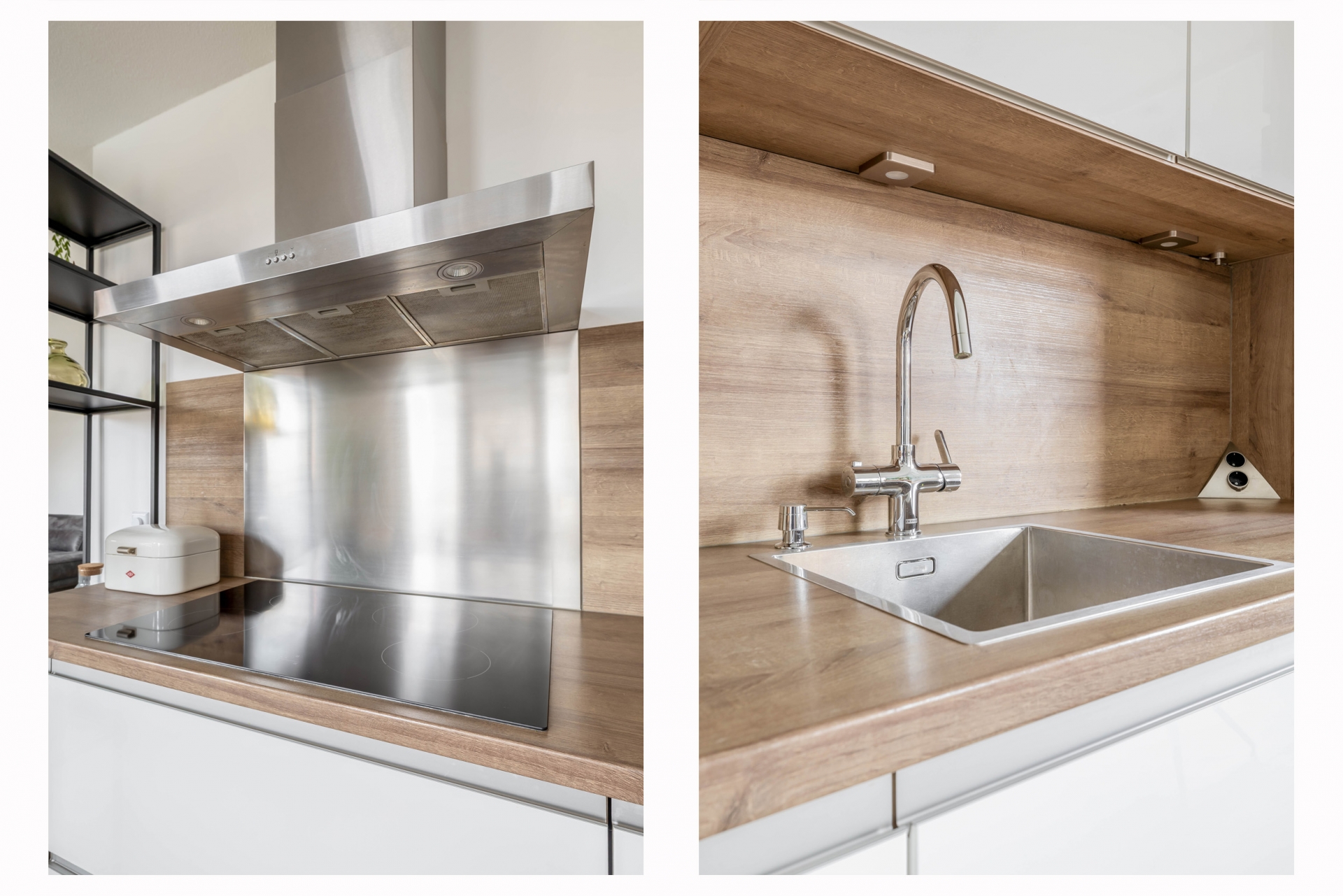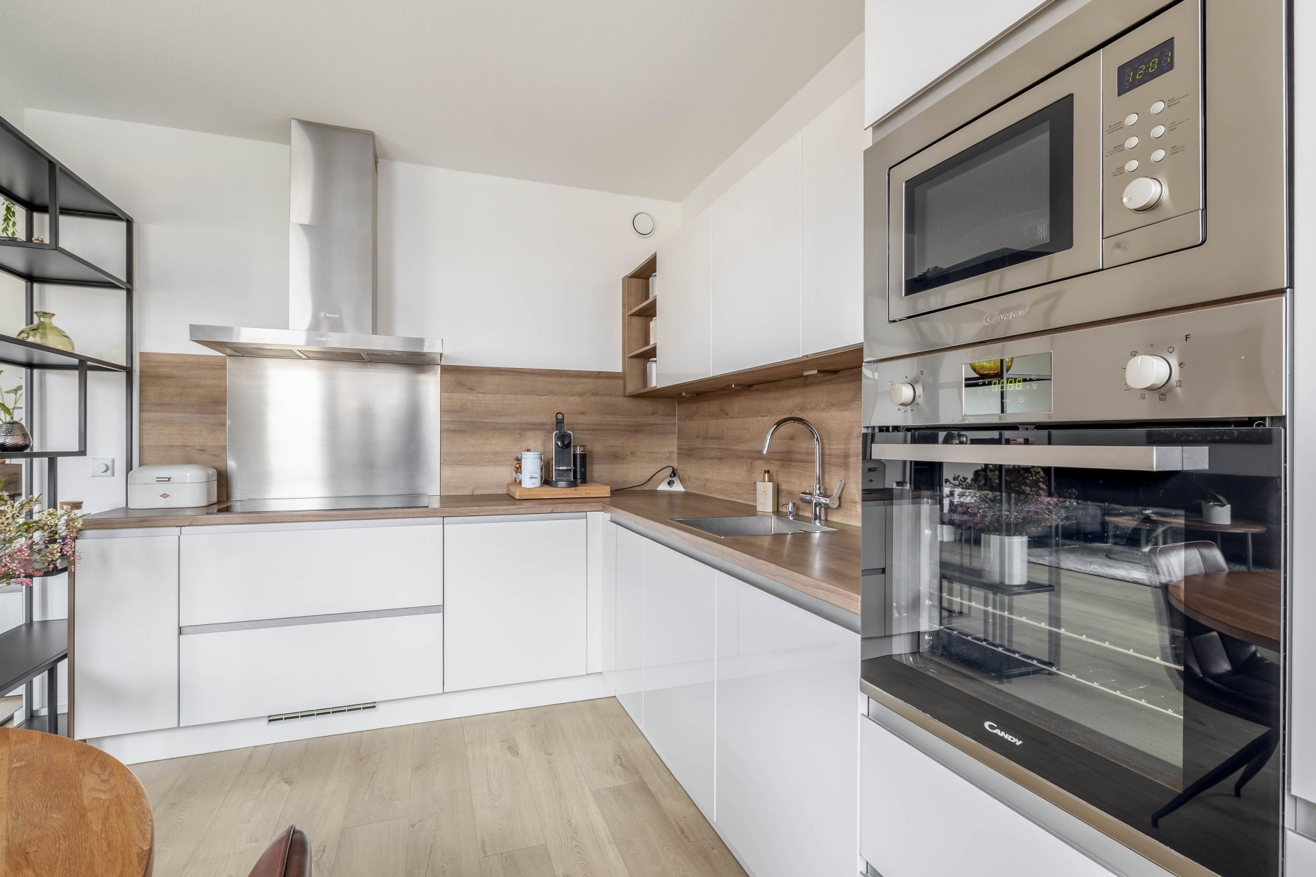 De open keuken sluit hier naadloos op aan en vormt echt één geheel met de woonkamer. Deze is modern uitgevoerd en praktisch ingericht, waardoor je hier met gemak een snelle maaltijd bereidt of uitgebreid kunt koken voor vrienden. De opstelling biedt voldoende werk- en opbergruimte en de afwerking is strak en tijdloos, passend bij de rest van het appartement.