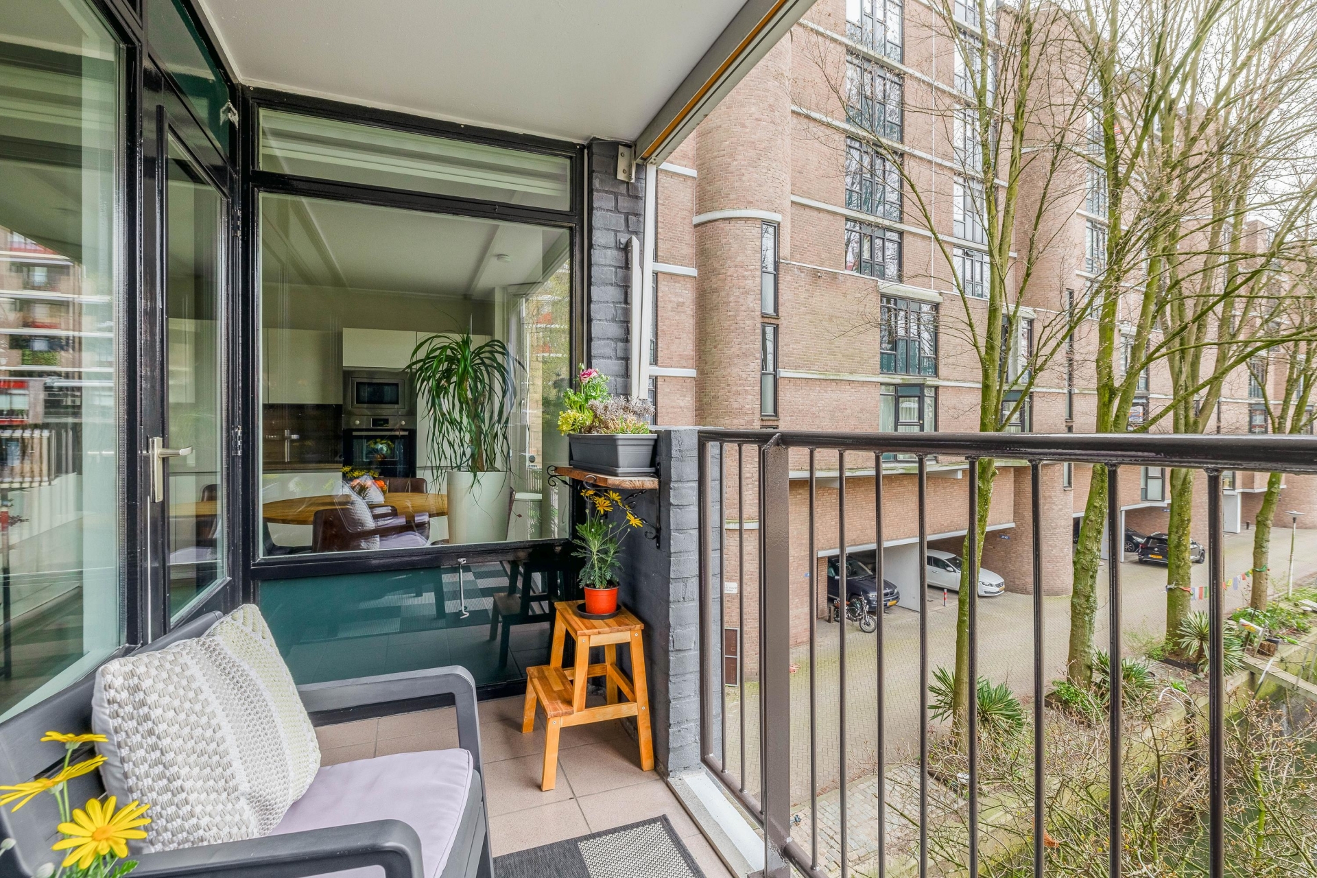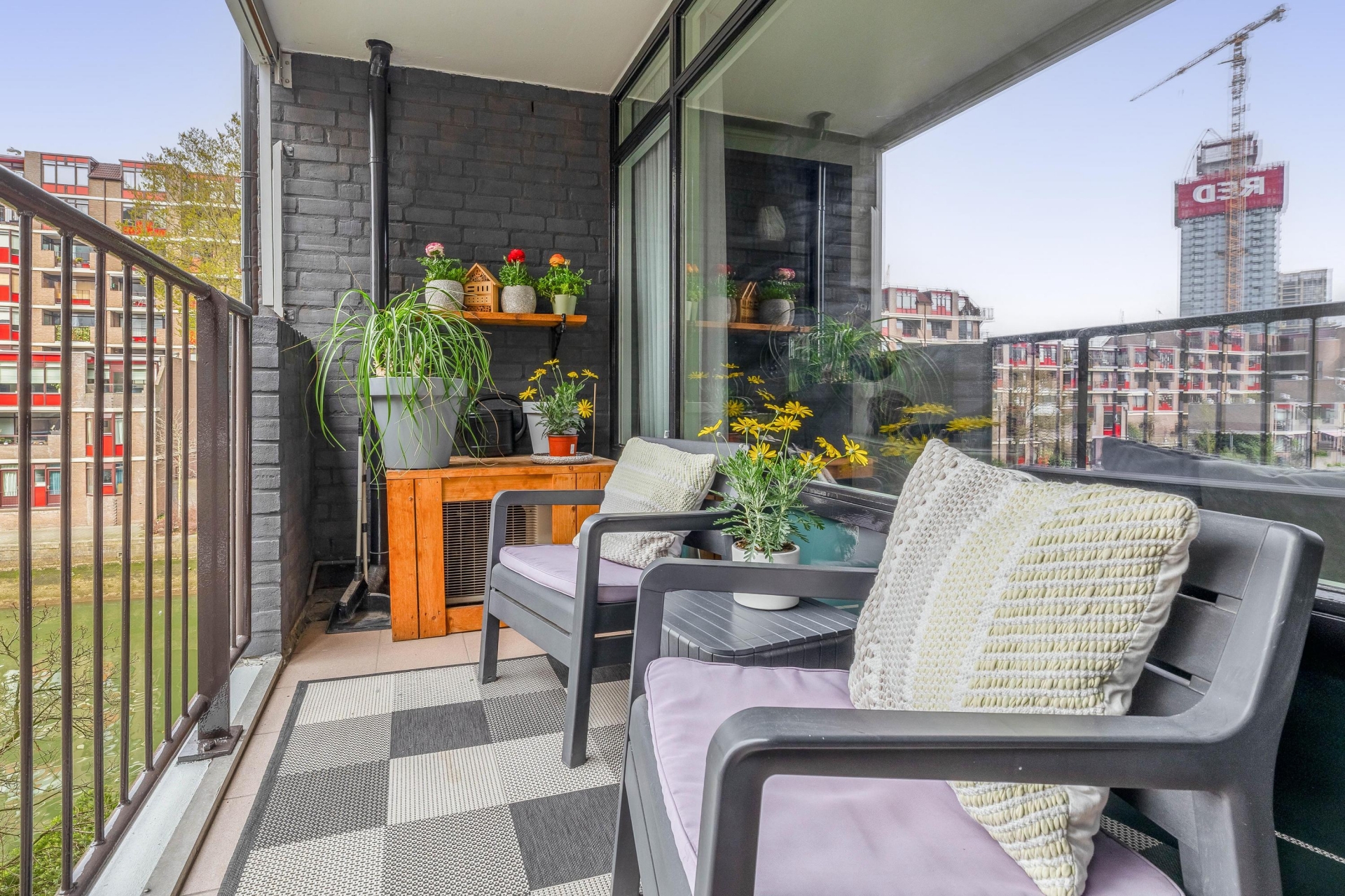 Grenzend aan de woonkamer bevindt zich het balkon, gelegen op het westen. Dit is zo’n plek waar je na een werkdag graag neerstrijkt. In de middag en avond pak je hier de zon mee, terwijl je uitkijkt over de Bierhaven en de stad.
