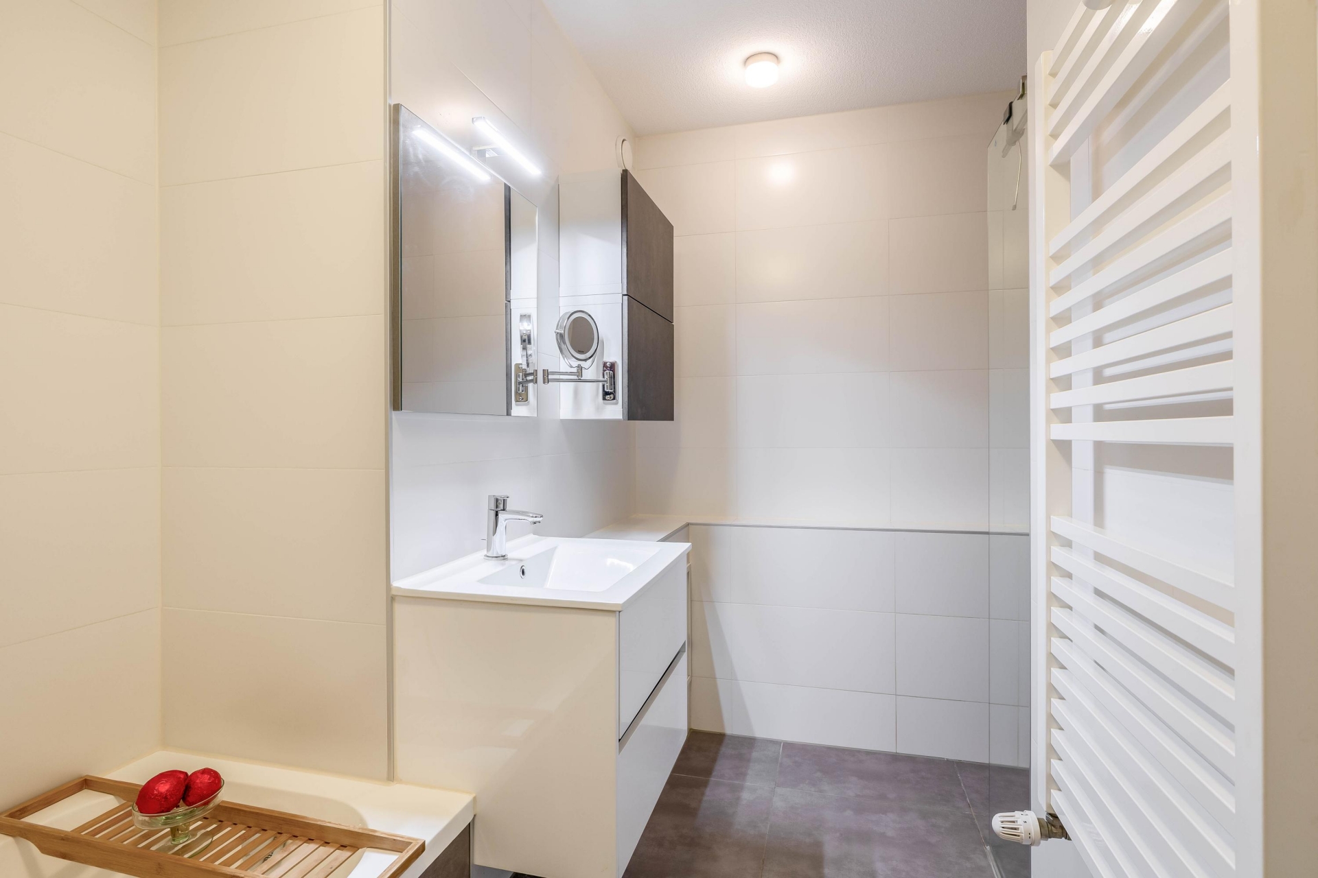 De badkamer is tijdens de renovatie in 2016 slim vergroot en praktisch ingedeeld. Hierdoor is er een comfortabele ruimte ontstaan met een moderne uitstraling. Je hebt hier de beschikking over een douche, ligbad en wastafelmeubel. Ook het toilet is destijds verplaatst, wat heeft bijgedragen aan de logische en efficiënte indeling van het appartement.