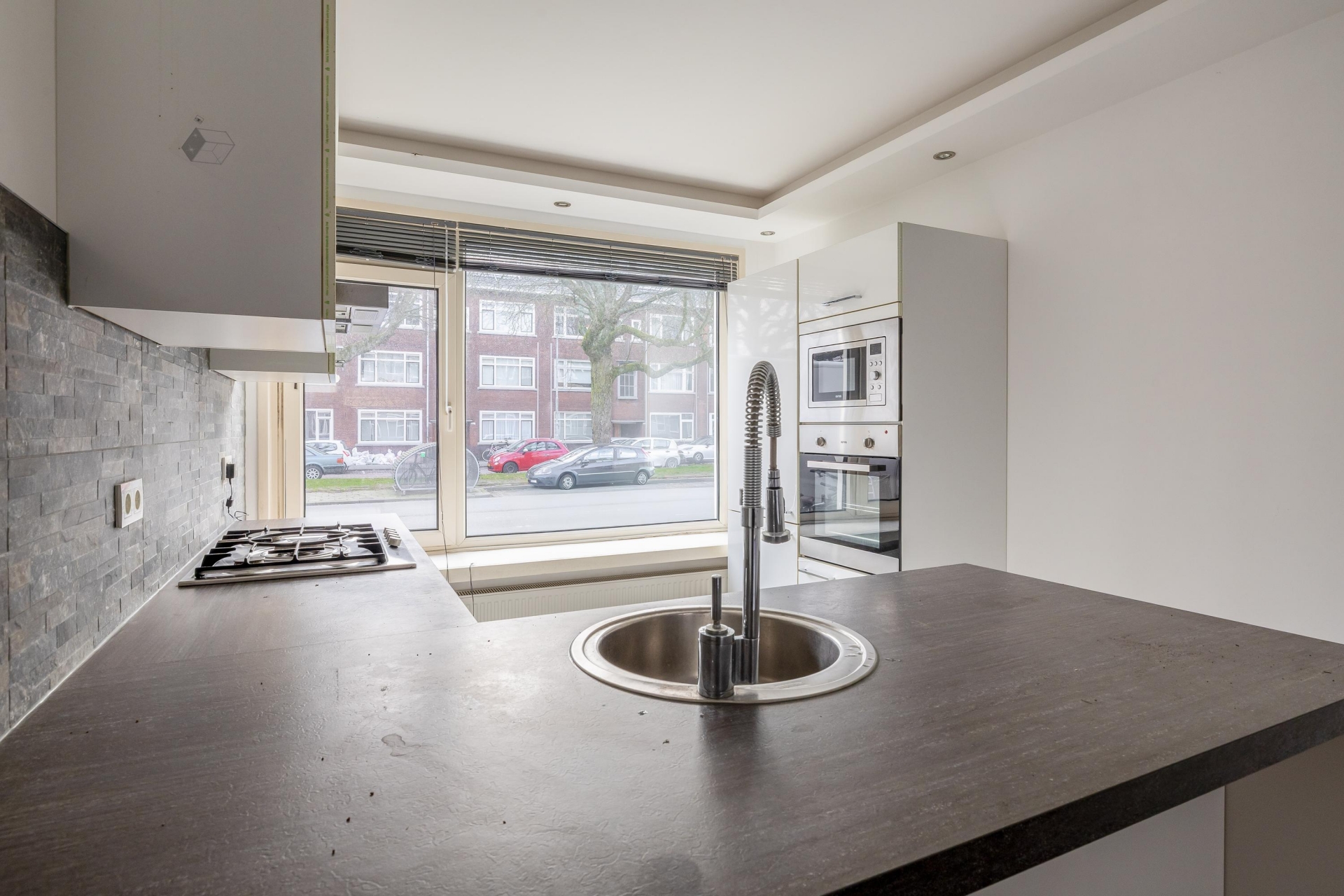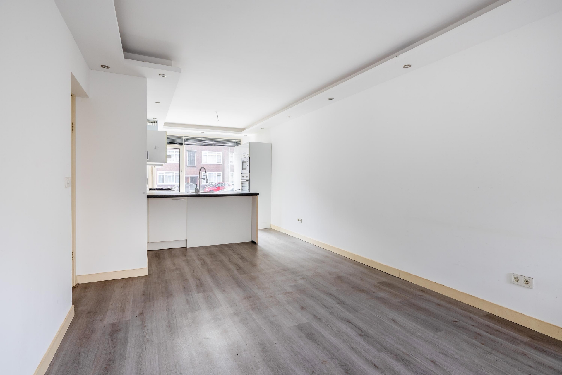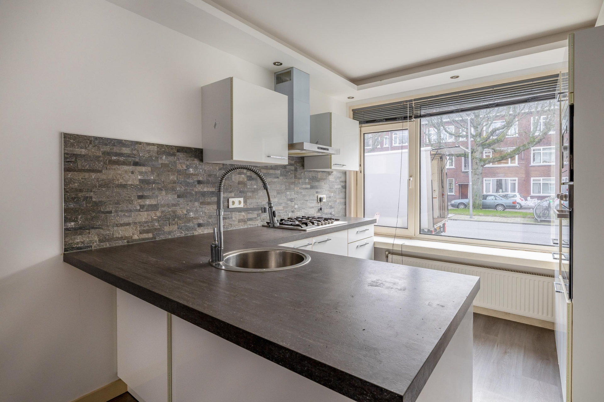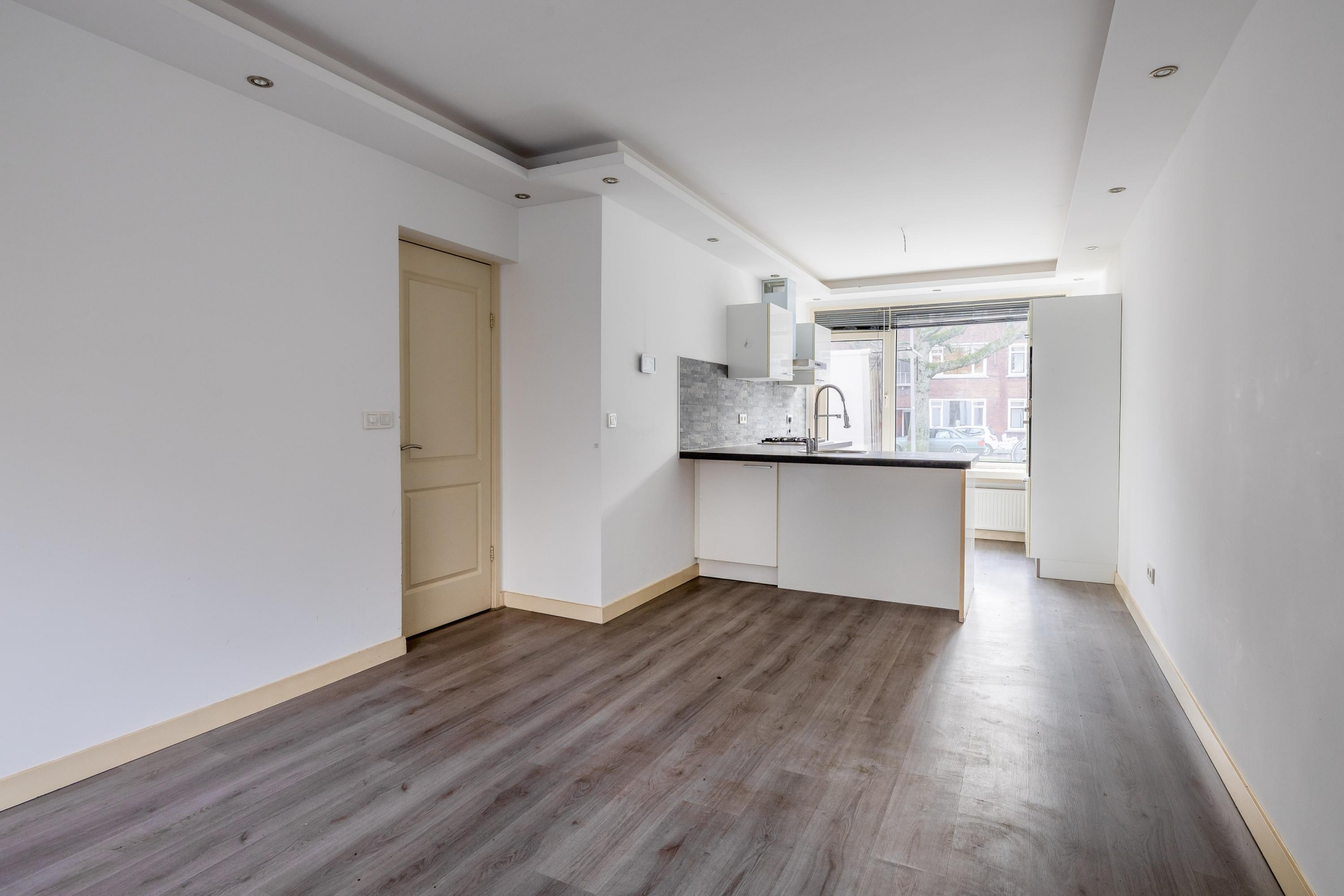 Je komt binnen op de begane grond, waar de woonkamer meteen opvalt door de prettige lichtinval en de open verbinding met de keuken. Dankzij de grote raampartijen aan de tuinzijde voelt deze leefruimte licht en open aan. Er is voldoende plek voor een comfortabele zithoek én een eettafel, waardoor dit echt een fijne plek is om thuis te komen na een lange dag. De open keuken sluit hier naadloos op aan en is praktisch ingericht, met voldoende werkruimte en kastruimte. Ideaal voor wie graag kookt en ondertussen contact houdt met gasten of huisgenoten.
