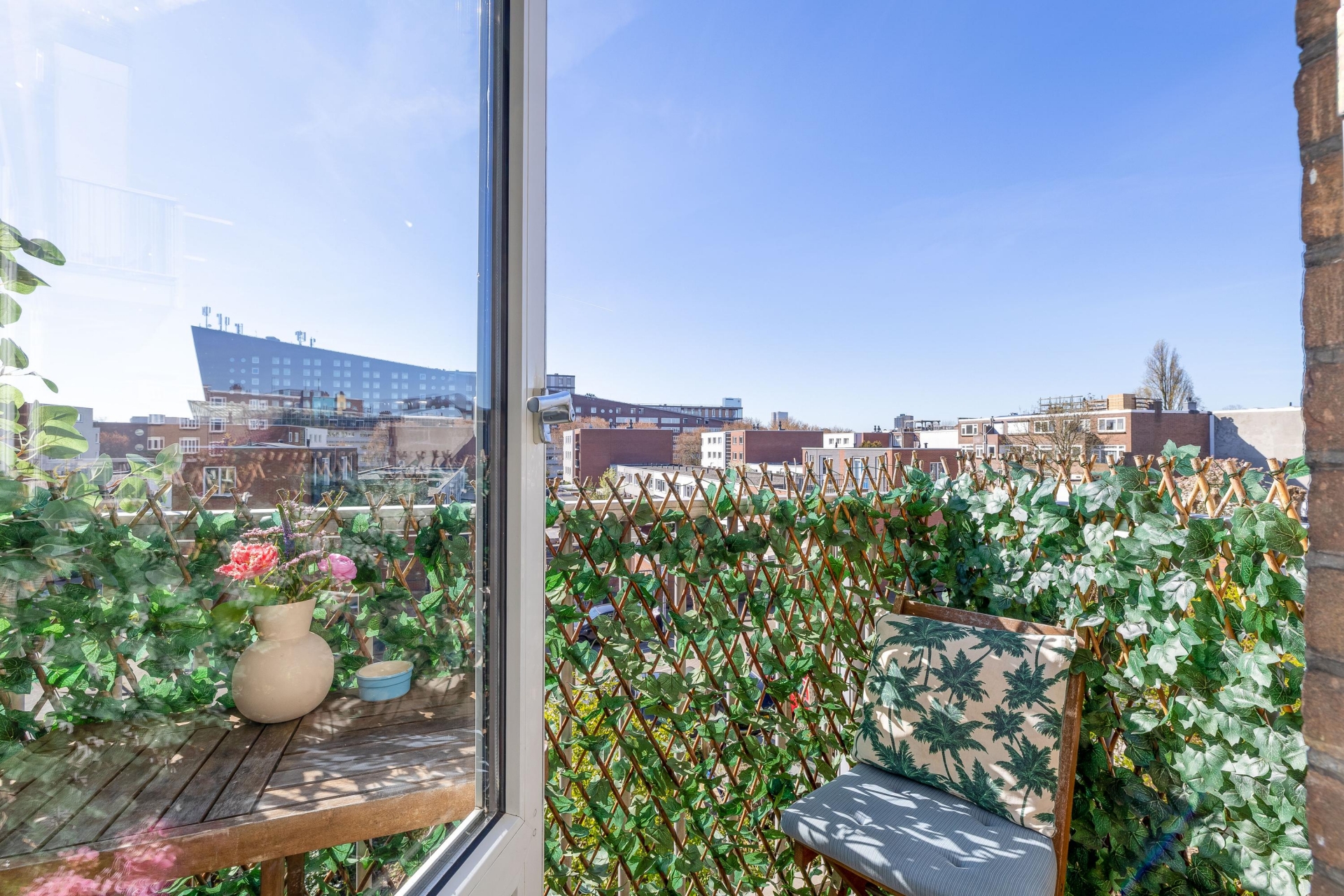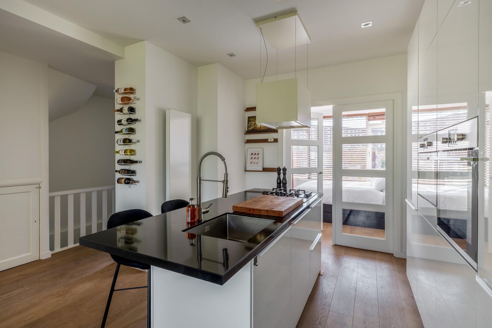 Zodra je binnenkomt, valt direct de fijne lichtinval op. De woonkamer is strak afgewerkt en heeft een warme uitstraling door de combinatie van lichte wanden en een nette vloer. De zithoek ligt aan de voorzijde en biedt een prettig uitzicht naar buiten, terwijl er voldoende ruimte overblijft voor een eettafel. De open keuken sluit hier naadloos op aan en vormt echt één geheel met de woonkamer. De keuken is modern uitgevoerd en voorzien van een kookeiland. Ideaal voor een snel ontbijt, een borrel met vrienden of gewoon extra werkruimte tijdens het koken. De inbouwapparatuur en de strakke afwerking maken dit een plek waar je dagelijks met plezier gebruik van maakt. Via de slaapkamer heb je toegang tot het balkon op het zuiden. Hier zit je al snel lekker in de zon en heb je een fijne buitenplek midden in de stad.