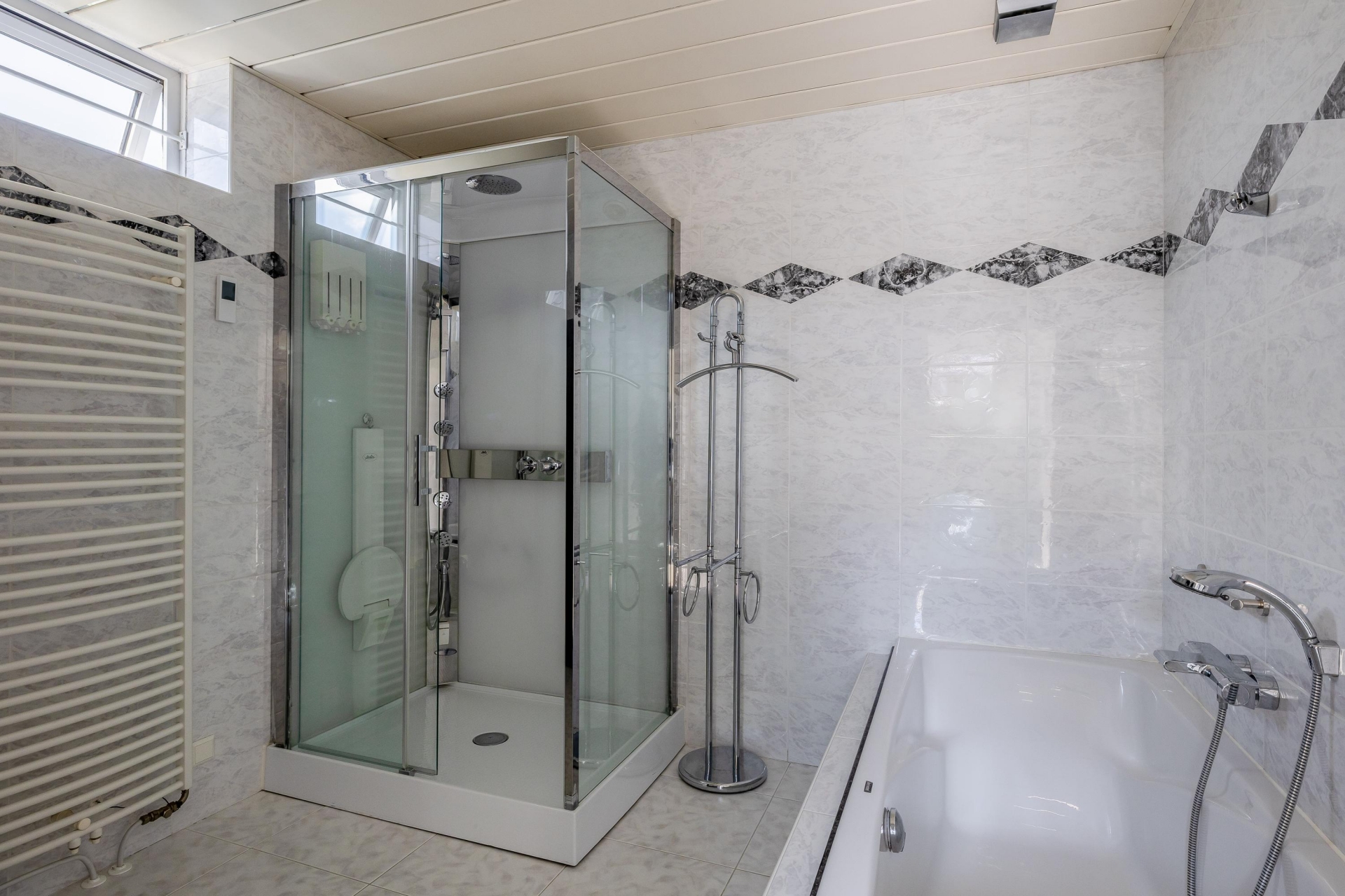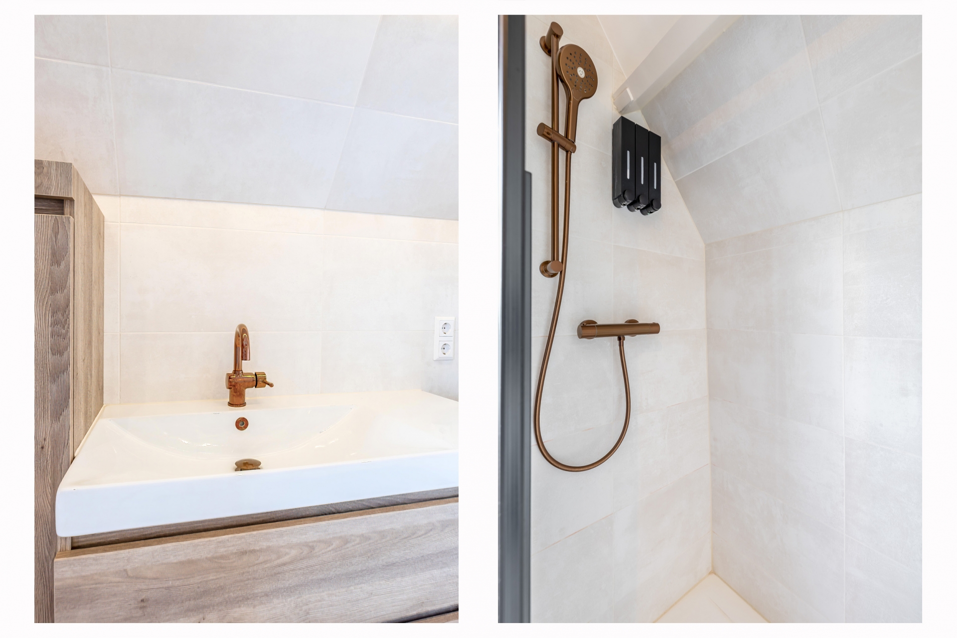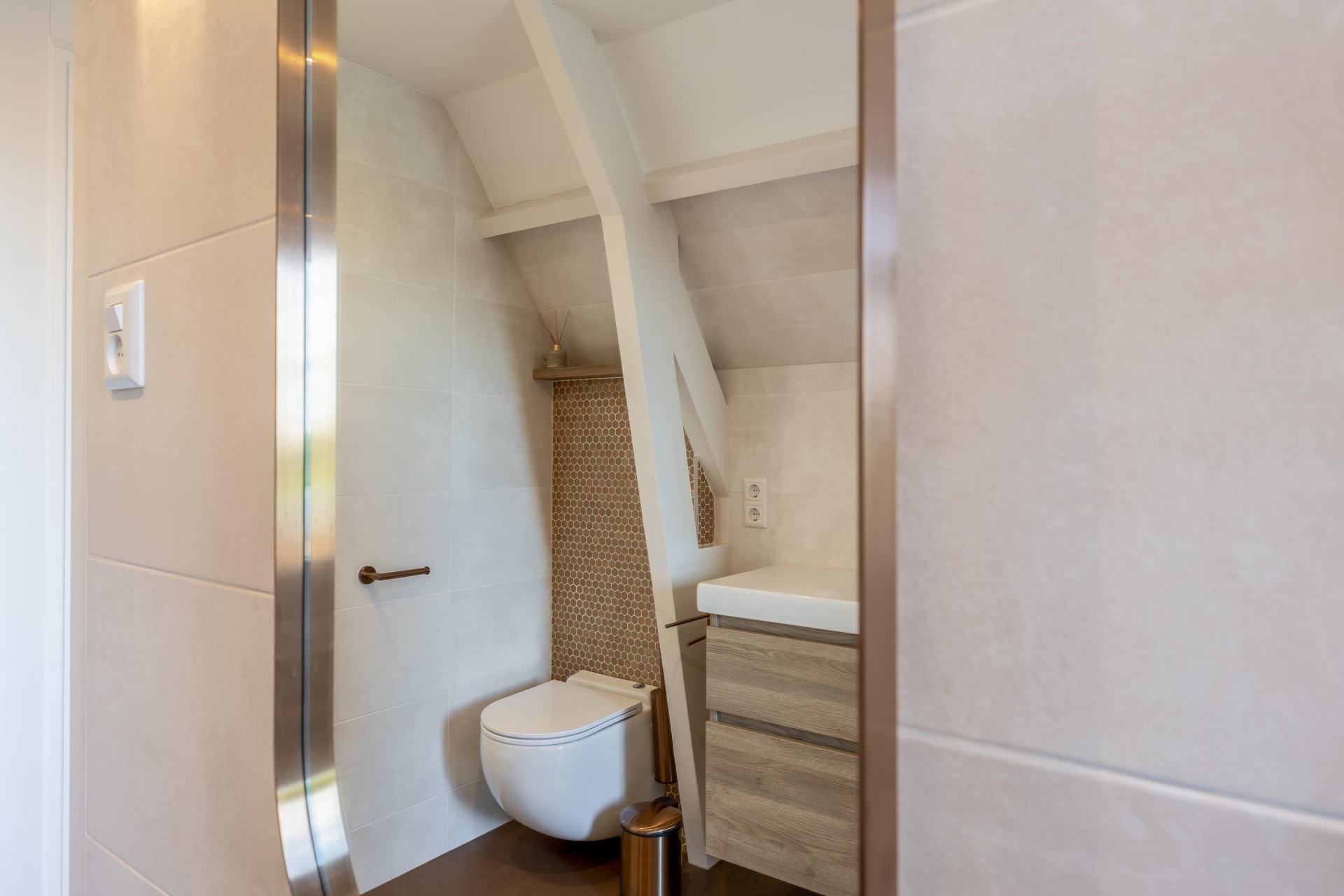 De aanwezigheid van twee badkamers is hier echt een groot pluspunt. Ideaal voor drukke ochtenden of als je gasten ontvangt. De badkamer op de eerst verdieping is modern uitgevoerd (2024), met een strakke afwerking, inloopdouche, wastafel met meubel en een toilet (Sanibroyeur). Alles is netjes verzorgd en klaar voor gebruik.