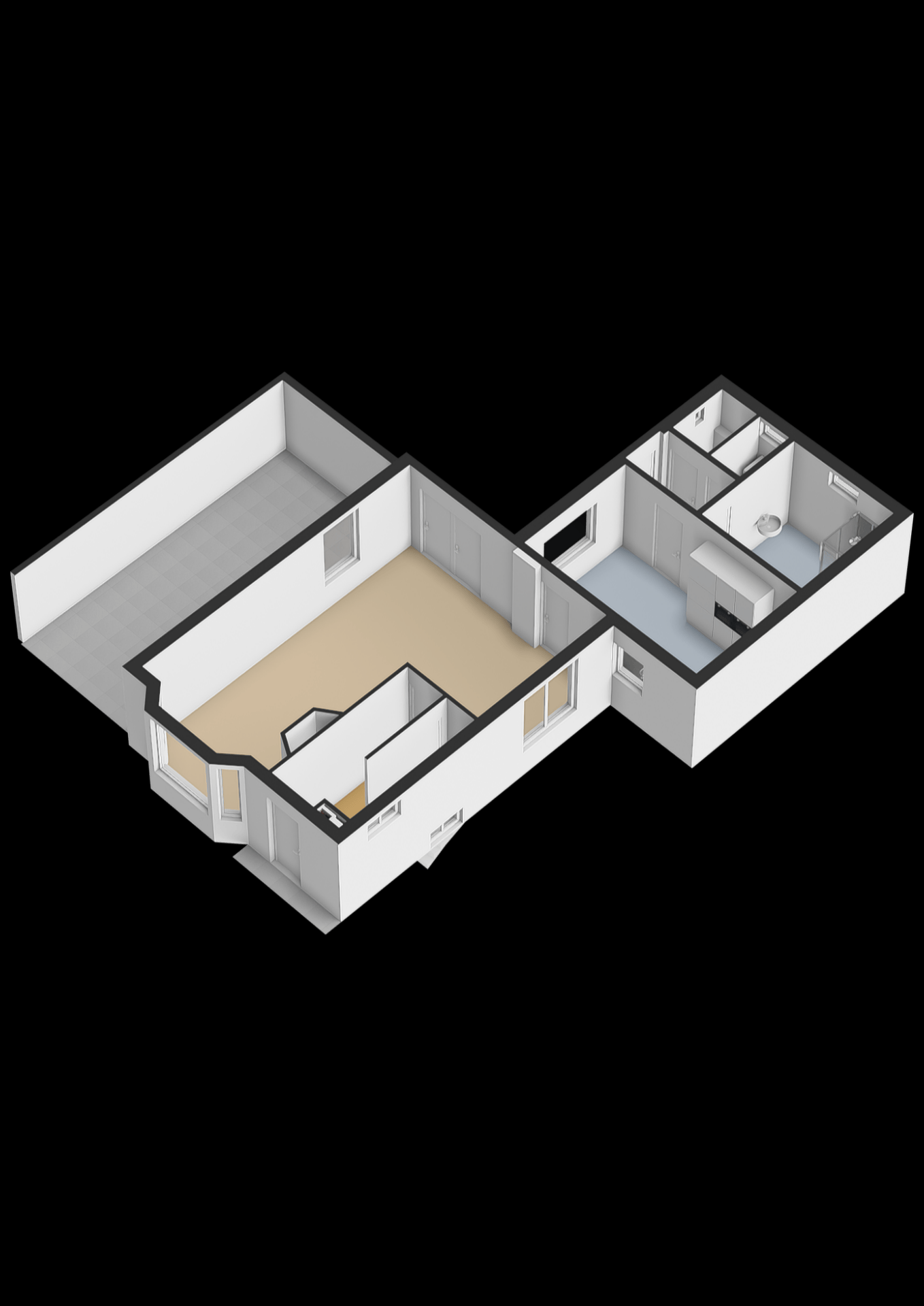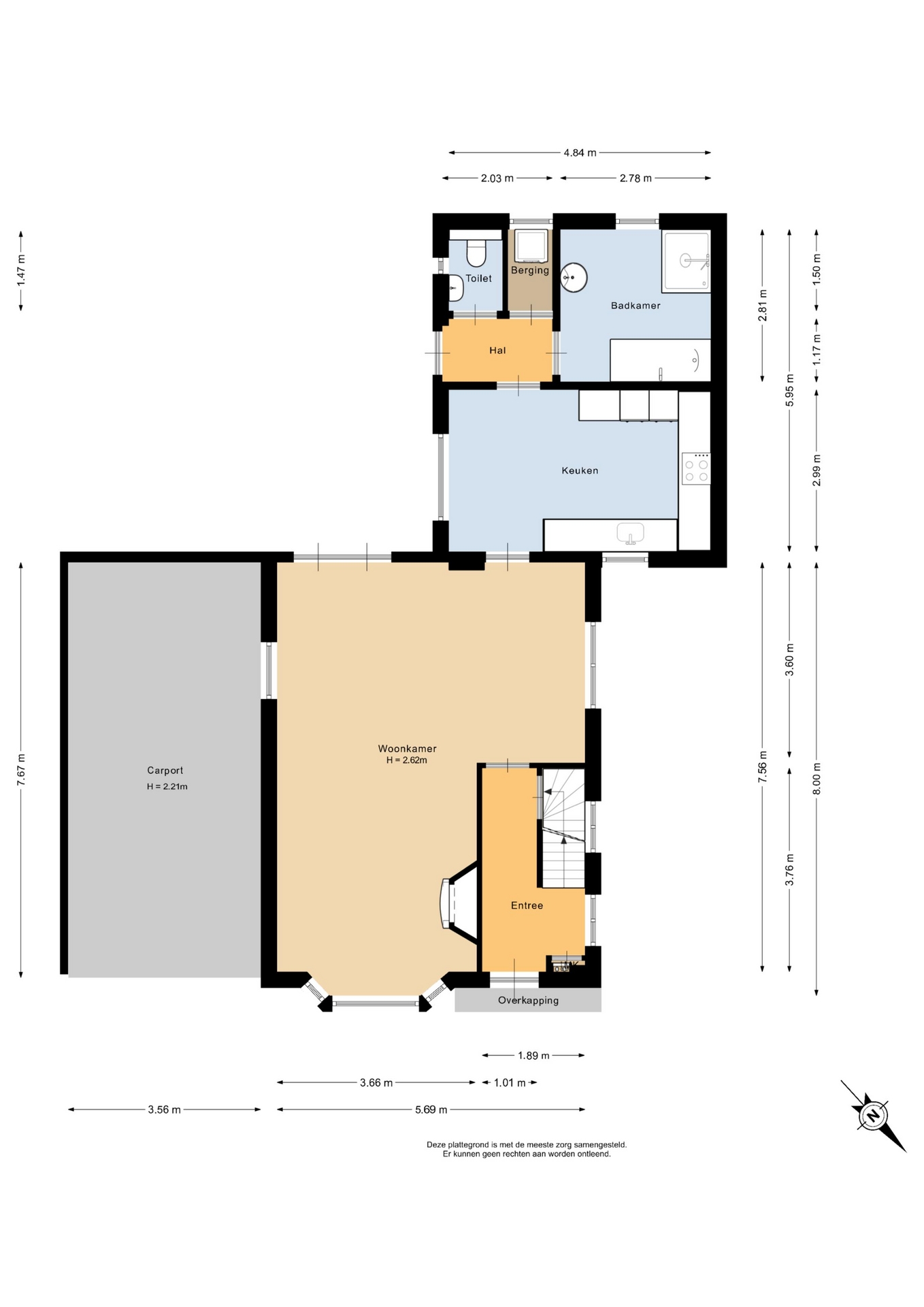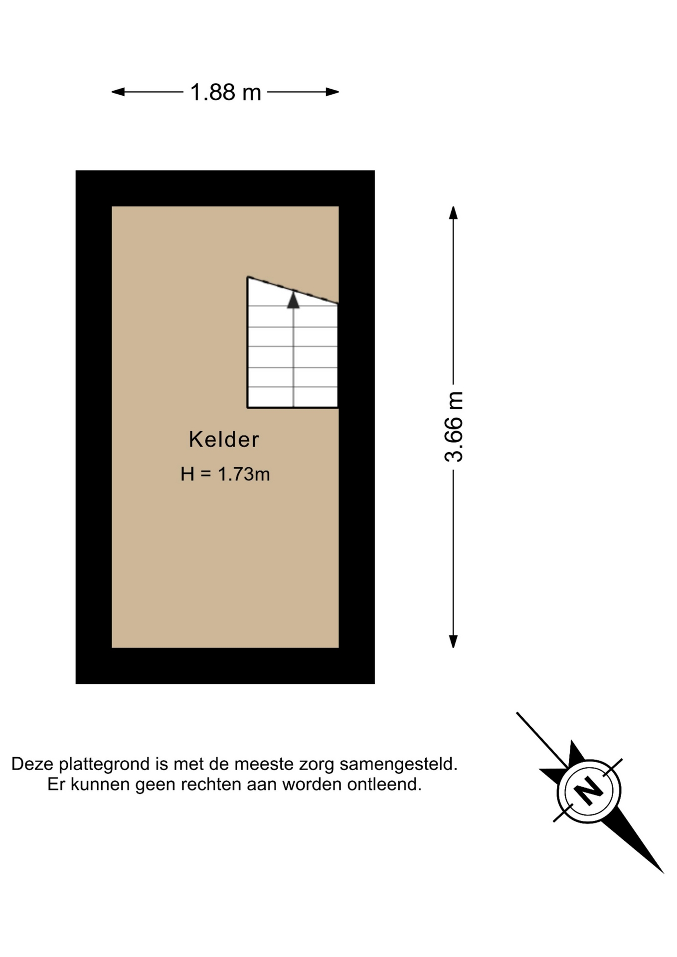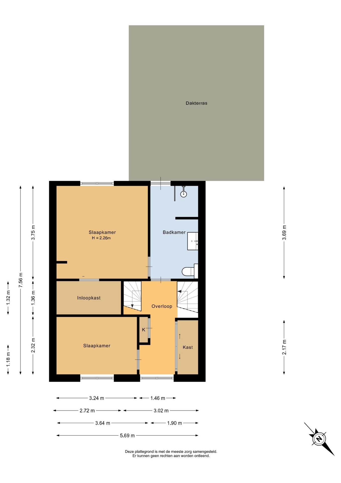 - De hoogte van de tweede verdieping is ca. 1,91 meter. Omdat de ruimte zich goed leent als woonruimte (2 slaapkamers) is de ruimte opgenomen in het genoemde woonoppervlak, ondanks het feit dat de meetinstructie een minimale hoogte van 2 meter eist;