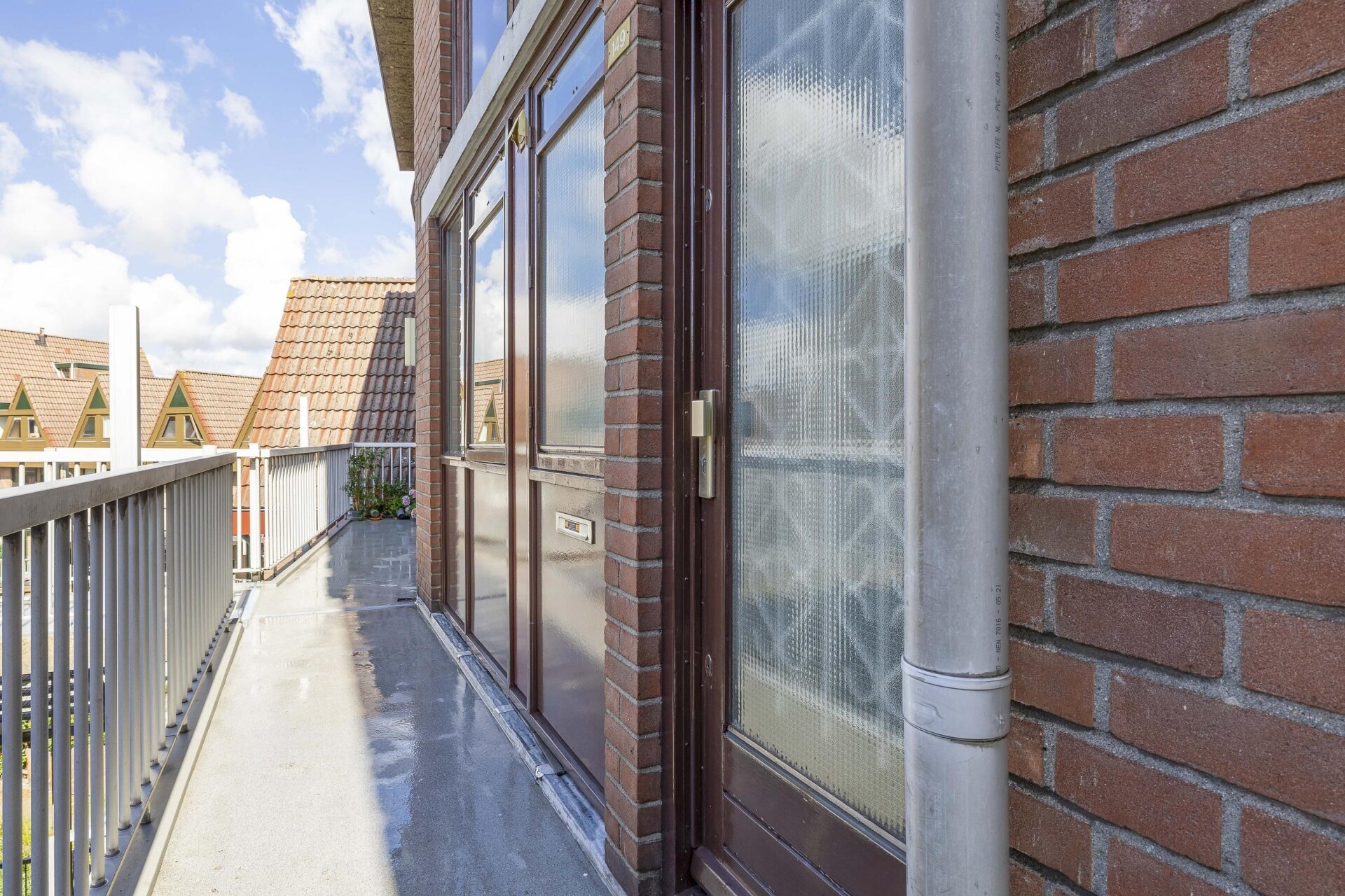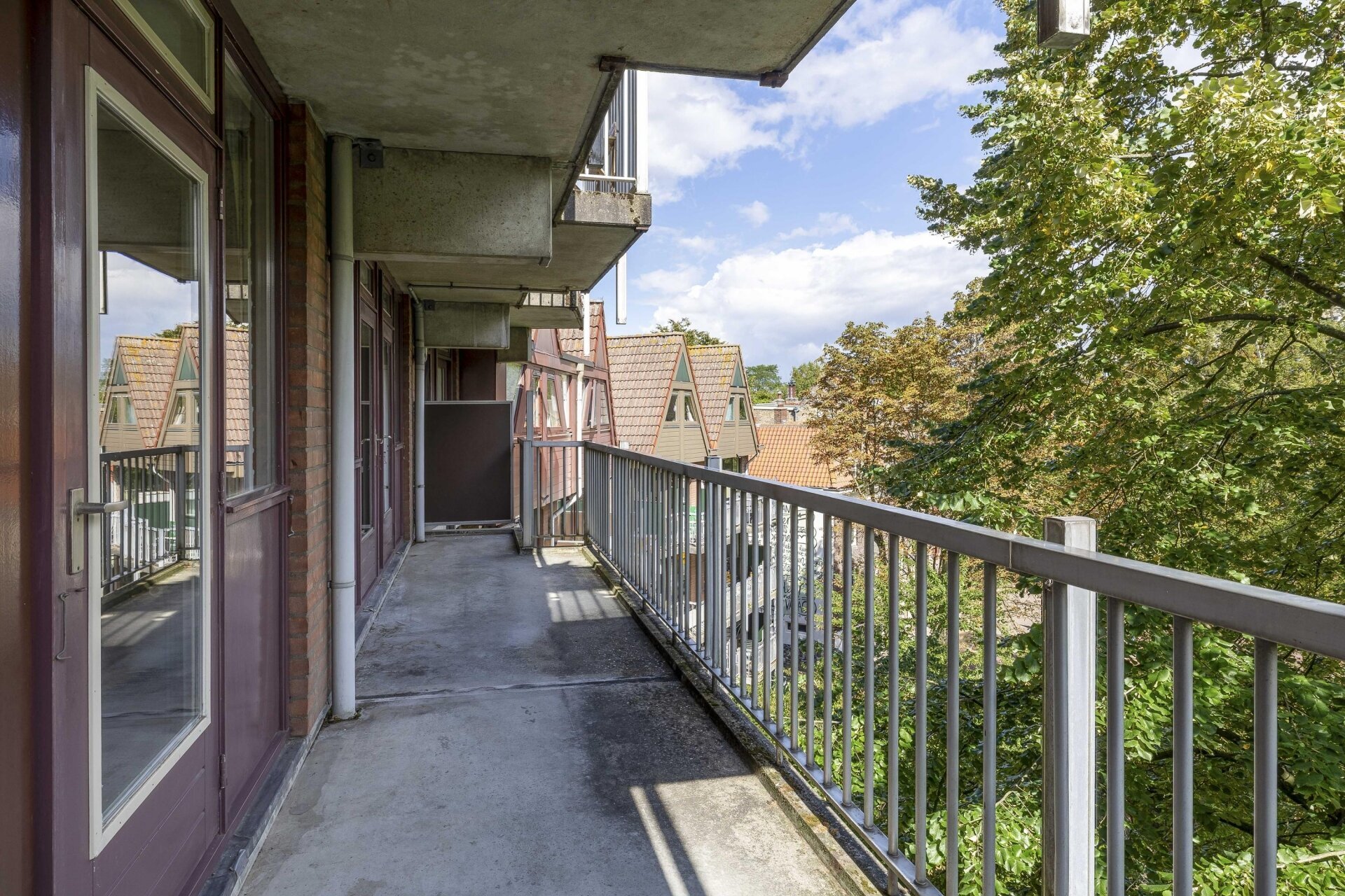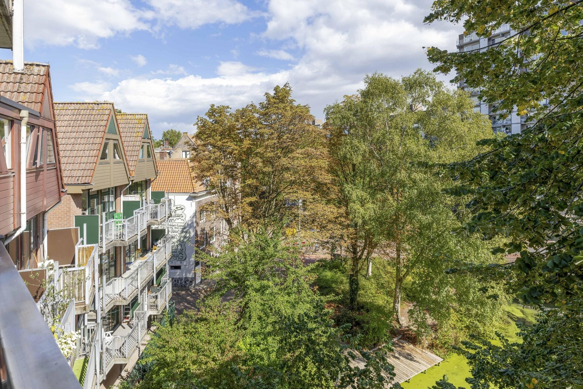 Het appartement ligt op de tweede verdieping en heeft een praktische indeling. De woonkamer biedt veel licht dankzij de grote ramen en een openslaande deur naar het balkon aan de oostkant. Hier zit je heerlijk tussen het groen met uitzicht over de speelse architectuur van het Heliport-complex. Het balkon is over de volledige breedte van het appartement en biedt in de ochtend tot vroege middag een fijn plekje in de zon.