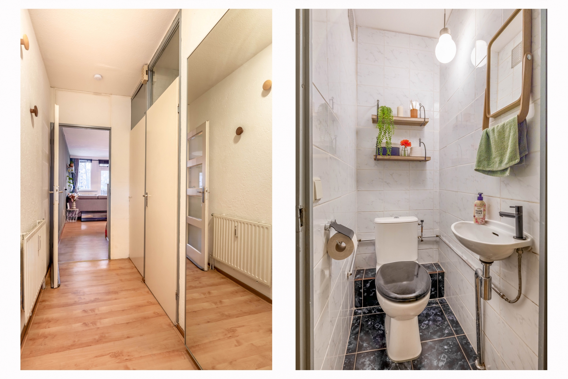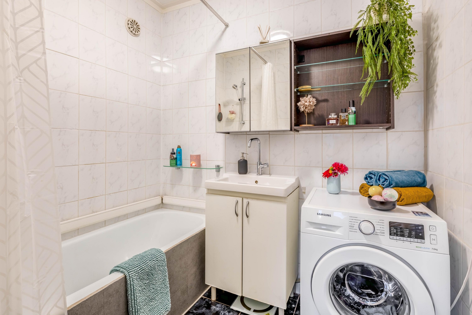 De slaapkamer ligt rustig aan de achterzijde en biedt toegang tot de volledig betegelde badkamer met ligbad/douche, wastafelmeubel, designradiator en wasmachineaansluiting. In de hal bevindt zich een separaat toilet met fonteintje.