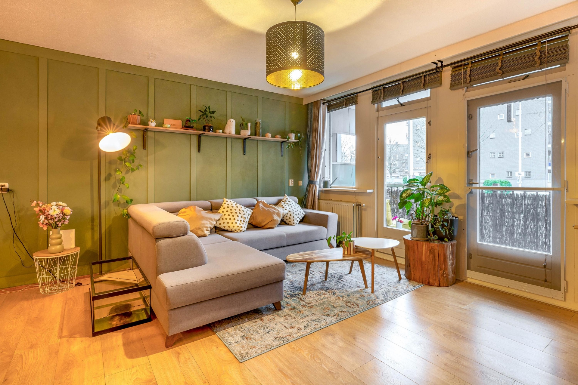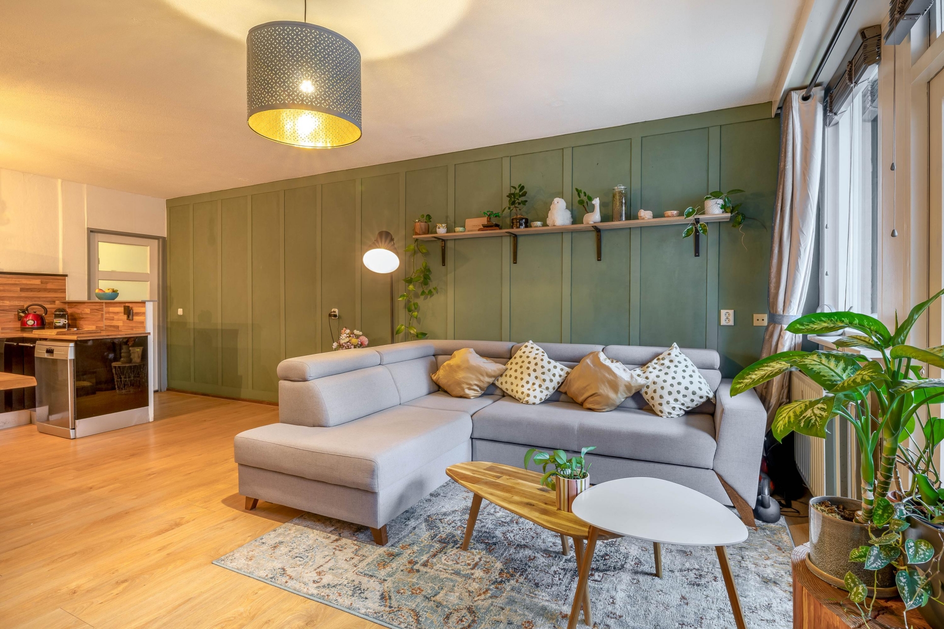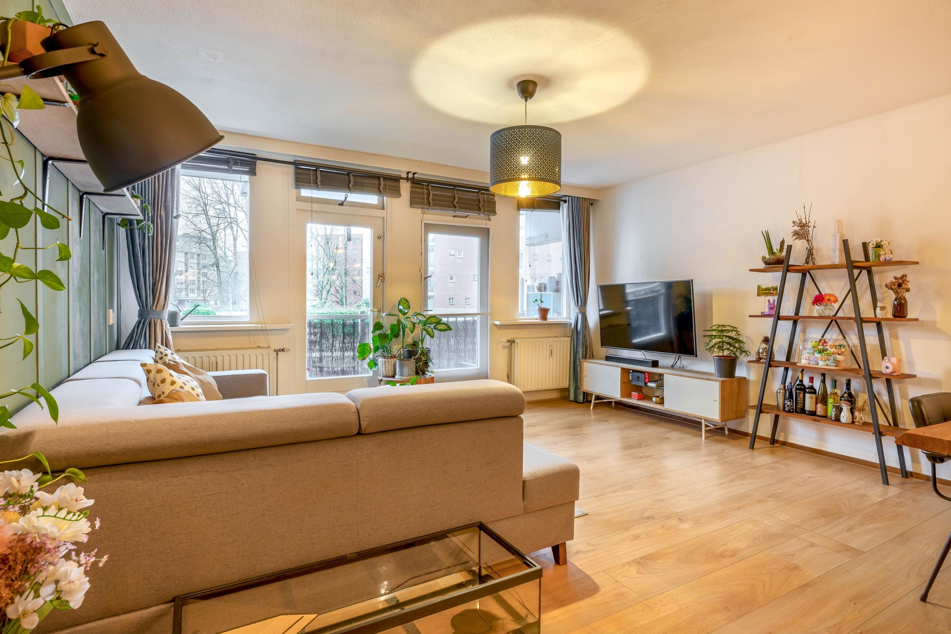 Via de ruime hal bereik je alle vertrekken. De woonkamer is royaal en profiteert van grote ramen aan de voorzijde. Openslaande deuren geven toegang tot het brede balkon op het zuiden: perfect voor een ochtendkoffie of een borrel na het werk.