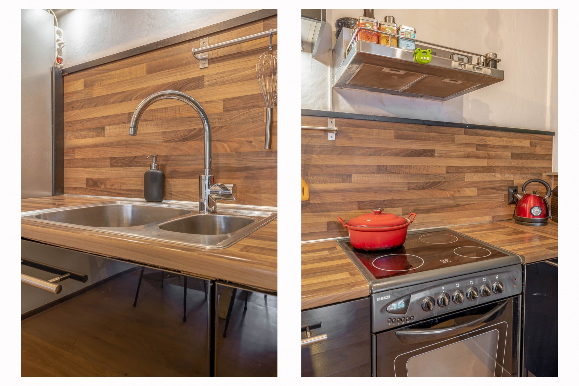 De open keuken is praktisch uitgevoerd in een L-opstelling en voorzien van een elektrische kookplaat, oven, RVS afzuigkap, 1,5 spoelbak en ruimte voor een losse koelkast en vaatwasser.