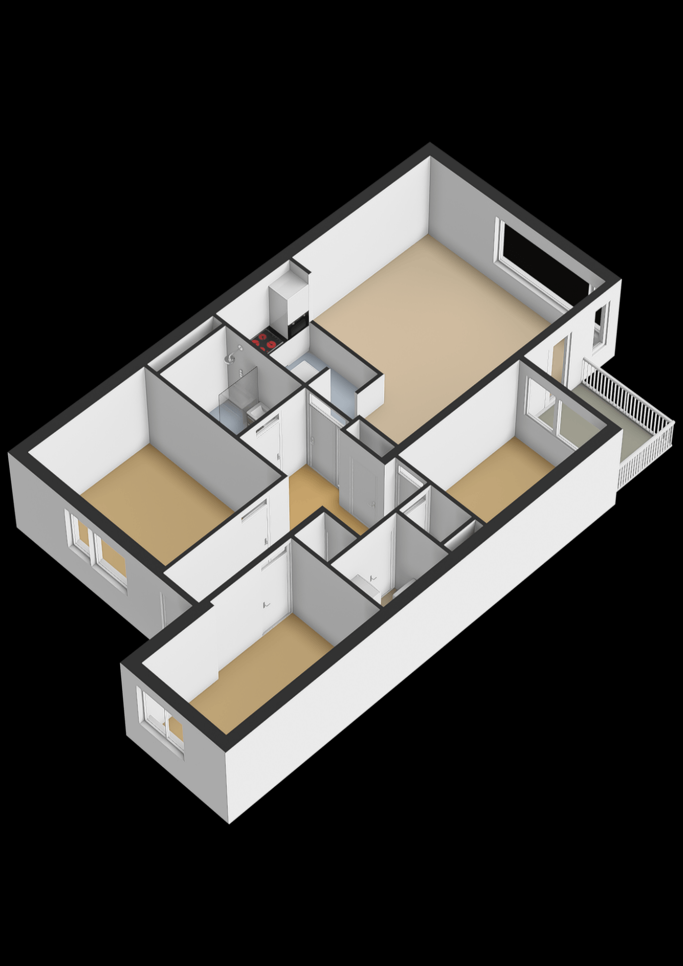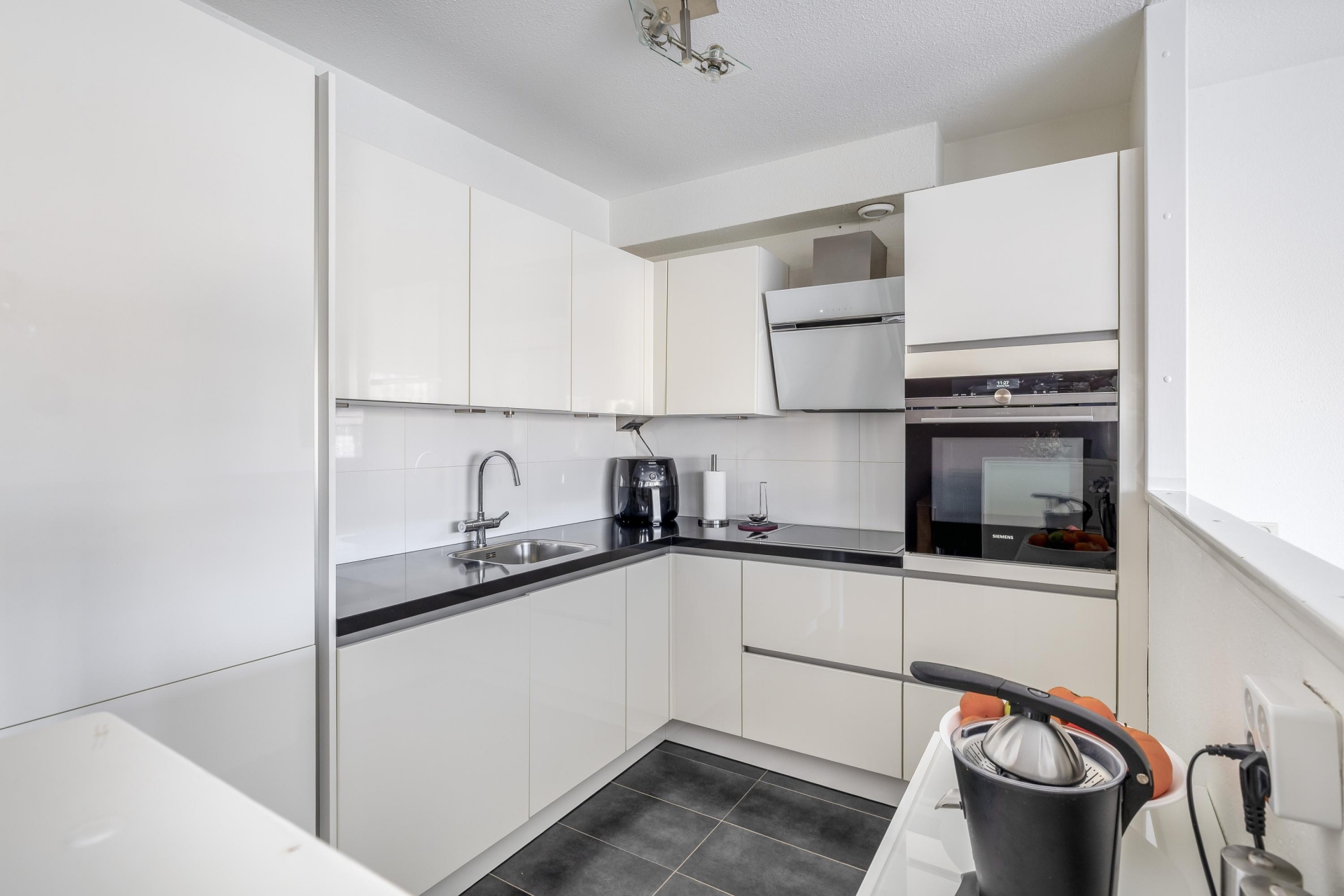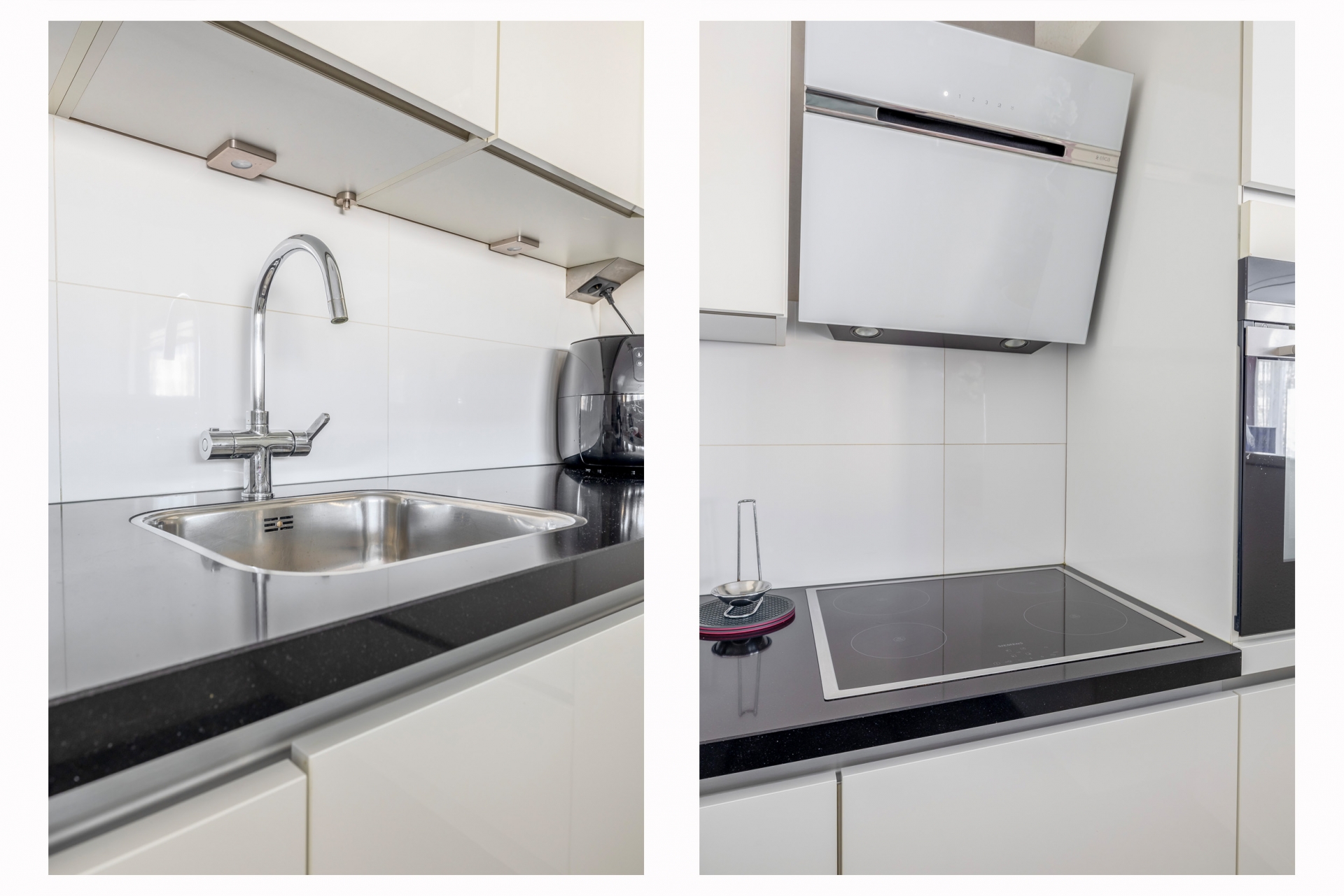 Deze living is opgedeeld in een open keuken en een woonkamer met deur naar het balkon.