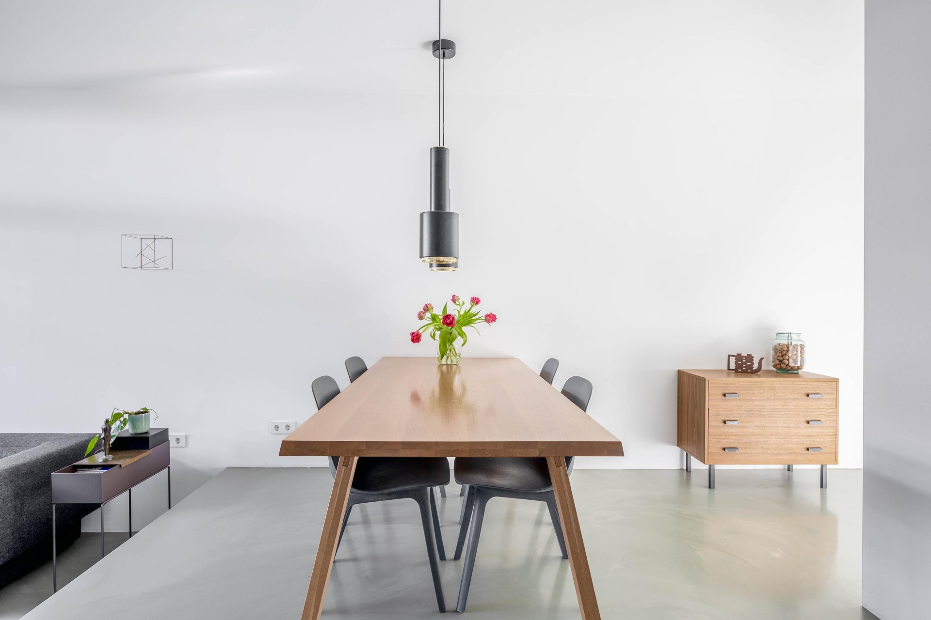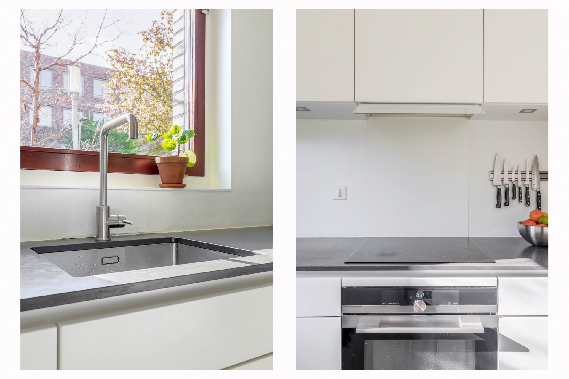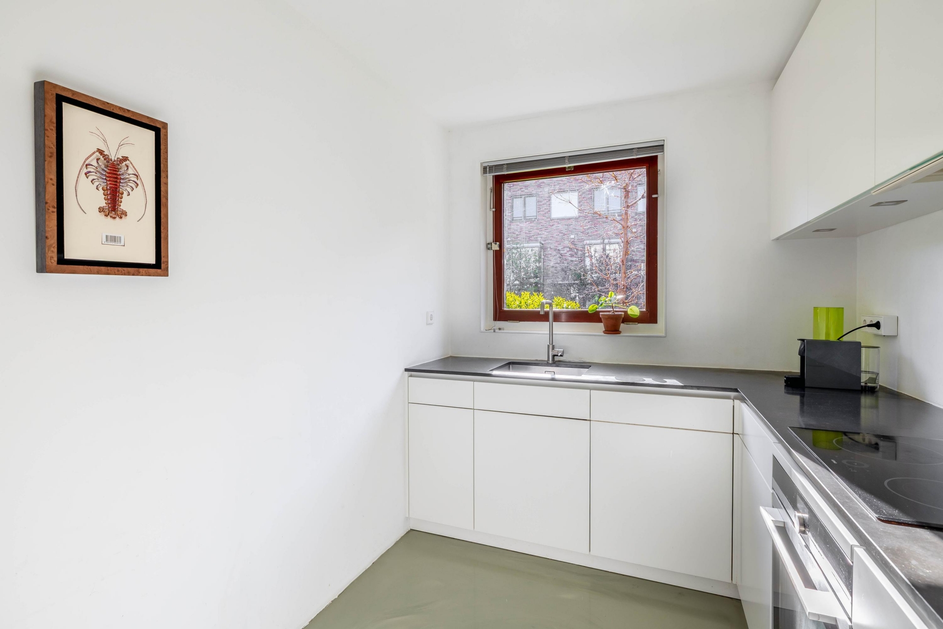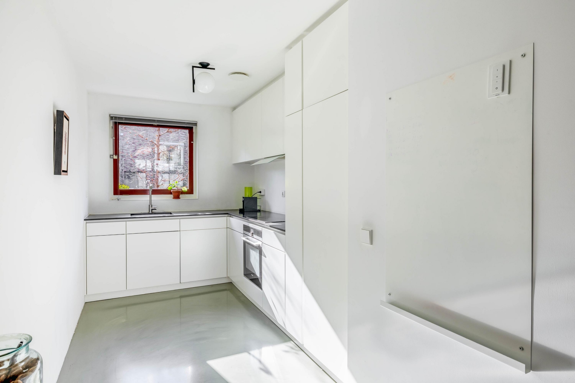Aan de voorzijde bevindt zich de moderne keuken (2016), uitgevoerd in een tijdloze stijl en in uitstekende staat. Hier kook je met plezier, met uitzicht op de straat en de ochtendzon die de ruimte binnenvalt.
