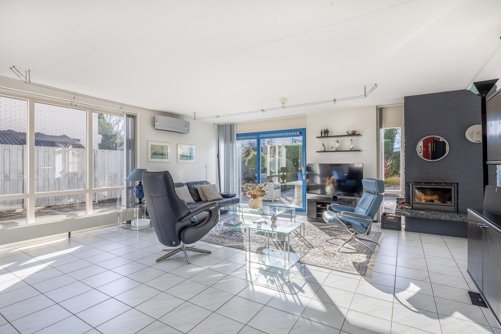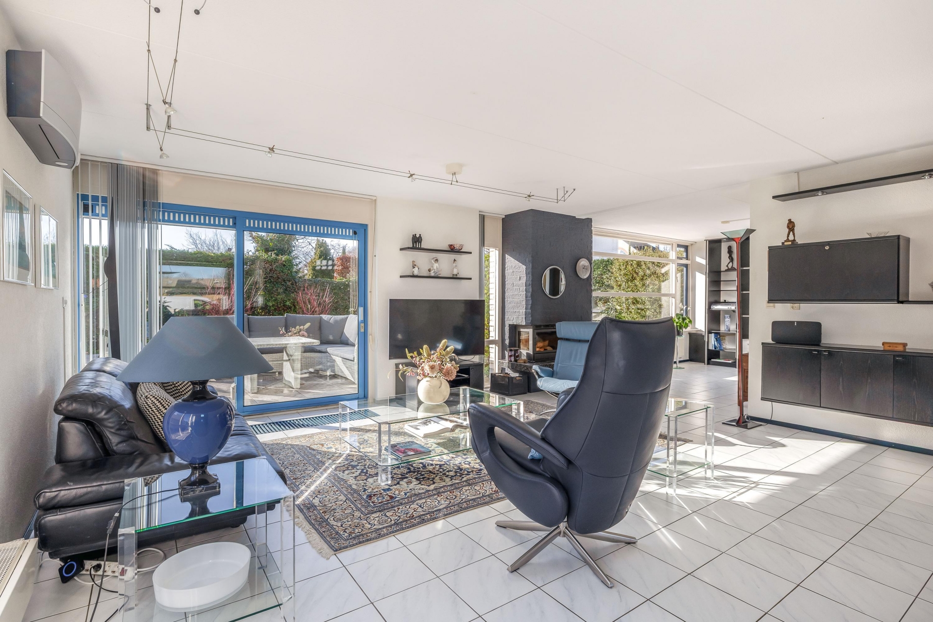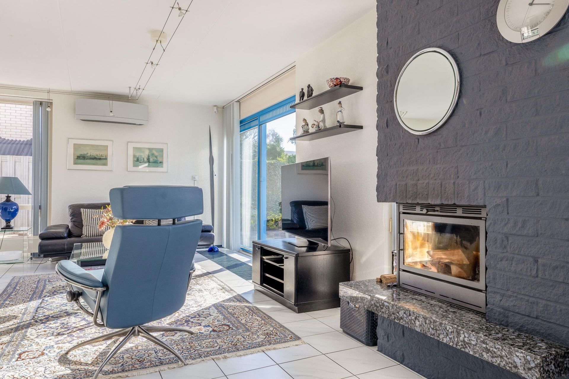 De woonkamer van circa 48 m² is een heerlijke plek om te leven. Dankzij de grote raampartijen en de schuifpui naar de tuin komt er veel daglicht naar binnen, wat zorgt voor een open en frisse sfeer. De vloer is afgewerkt met lichte tegels en de indeling is ruim, waardoor je eenvoudig een gezellige zithoek én een grote eettafel kwijt kunt. De open haard geeft extra sfeer op winterse avonden en de airco-unit is ideaal om te verwarmen, maar houdt het ook ’s zomers aangenaam koel.