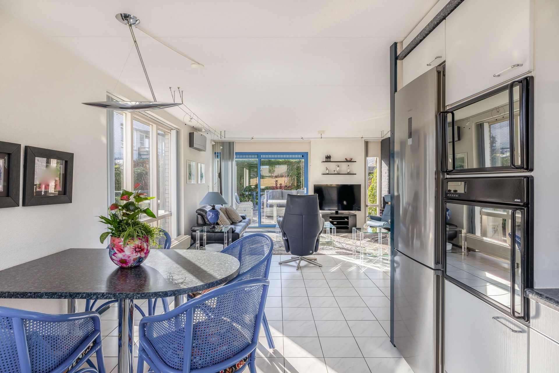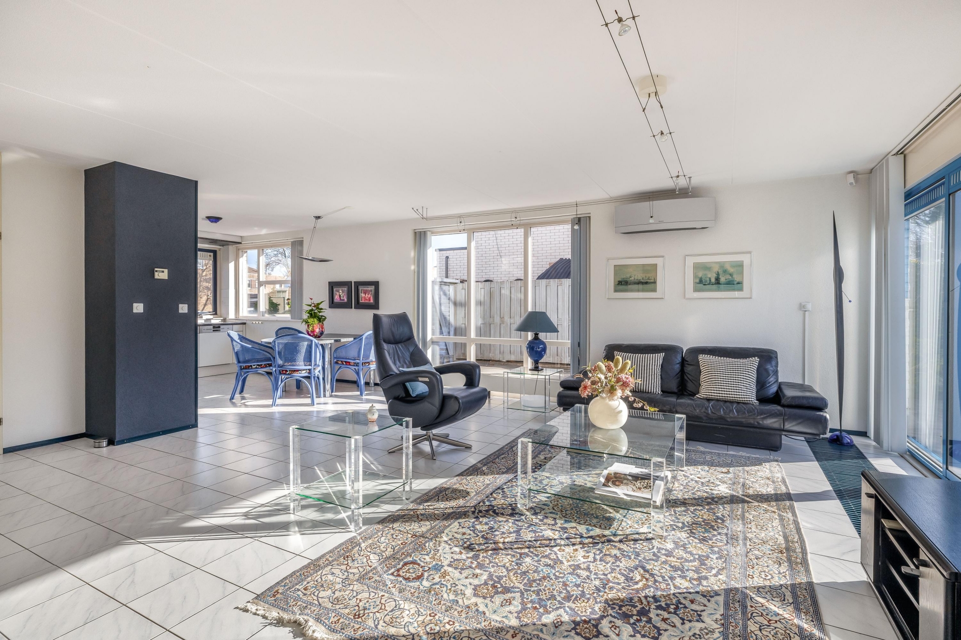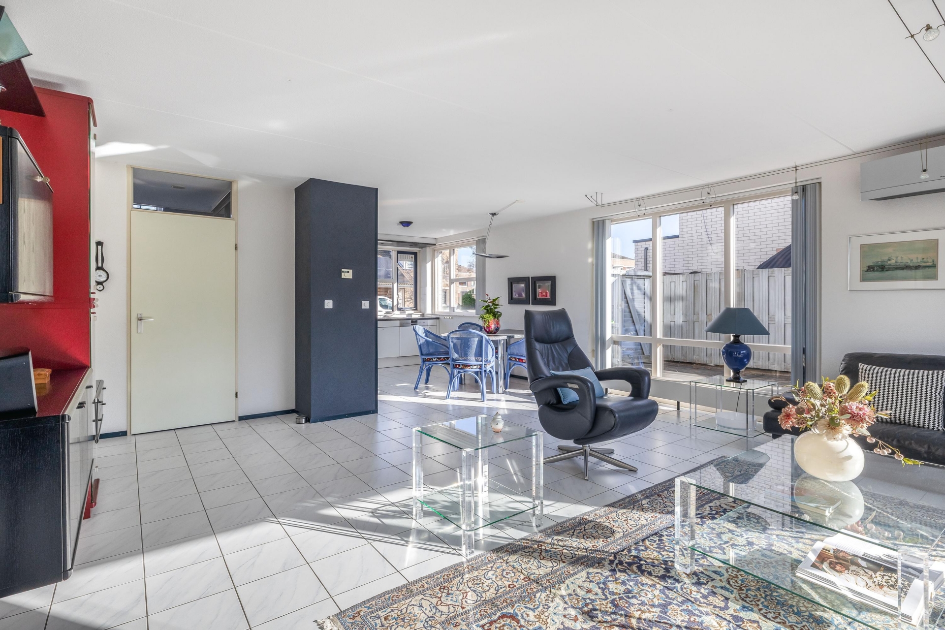 De woonkamer van circa 48 m² is een heerlijke plek om te leven. Dankzij de grote raampartijen en de schuifpui naar de tuin komt er veel daglicht naar binnen, wat zorgt voor een open en frisse sfeer. De vloer is afgewerkt met lichte tegels en de indeling is ruim, waardoor je eenvoudig een gezellige zithoek én een grote eettafel kwijt kunt. De open haard geeft extra sfeer op winterse avonden en de airco-unit is ideaal om te verwarmen, maar houdt het ook ’s zomers aangenaam koel.