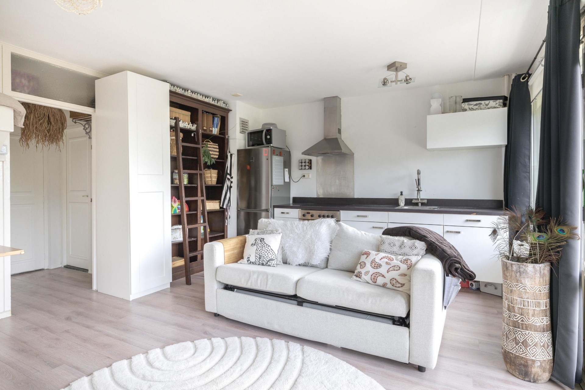 De woonkamer staat in open verbinding met de unieke slaapvide, met ruimte voor een tweepersoonsbed.
