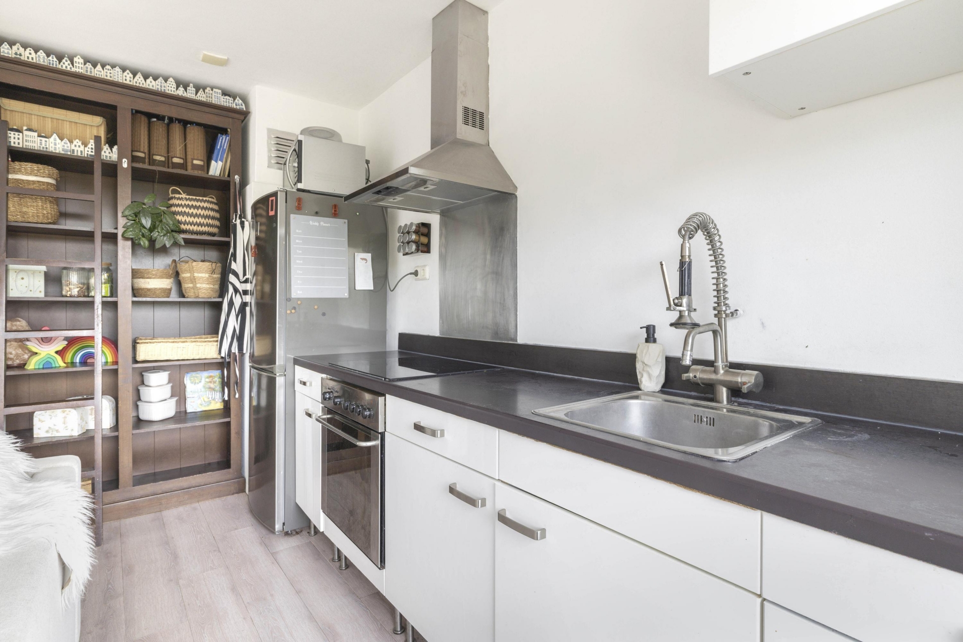 De open keuken heeft een neutrale inrichting en is voorzien van een inductiekookplaat, afzuigkap en koelkast met vriesvak (blijft achter).