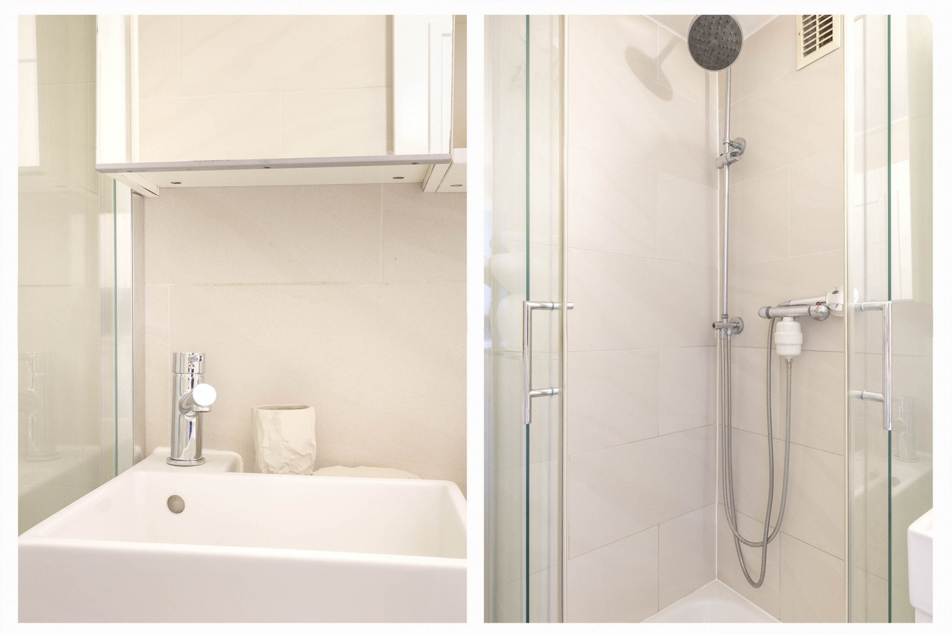 Aan de linkerkant van de hal ligt de moderne badkamer met toilet, douchehoek, wastafelmeubel met spiegelkast en opstelplaats voor de wasmachine.