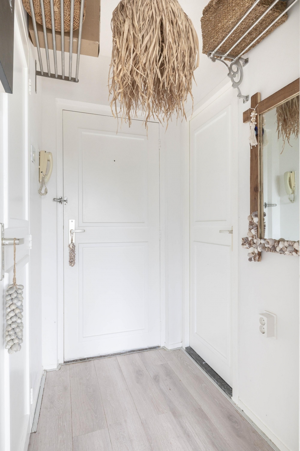 De entree van de woning bevindt zich aan een ruime gemeenschappelijke lifthal (geen galerij) en komt uit in een kleine hal met garderoberuimte.