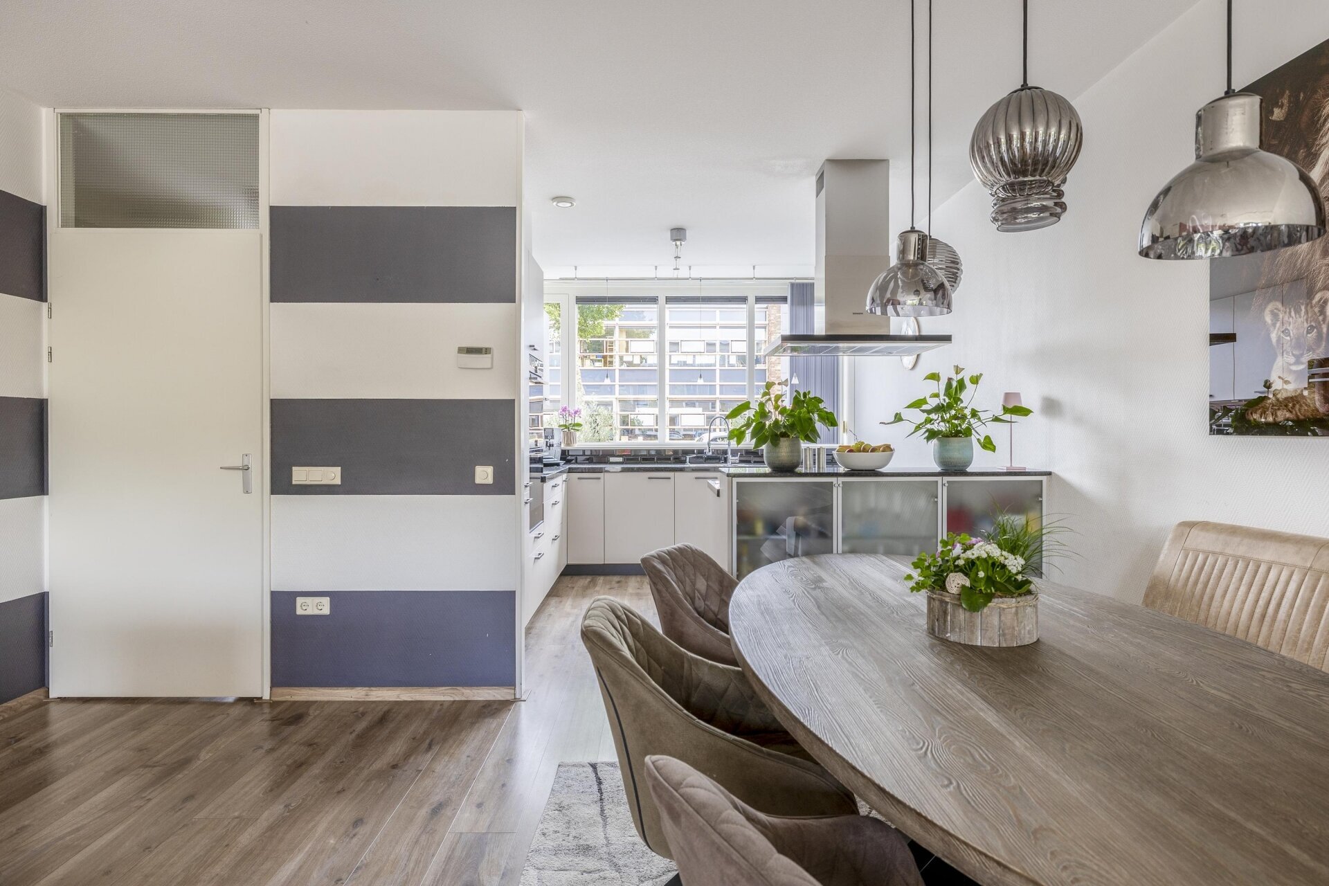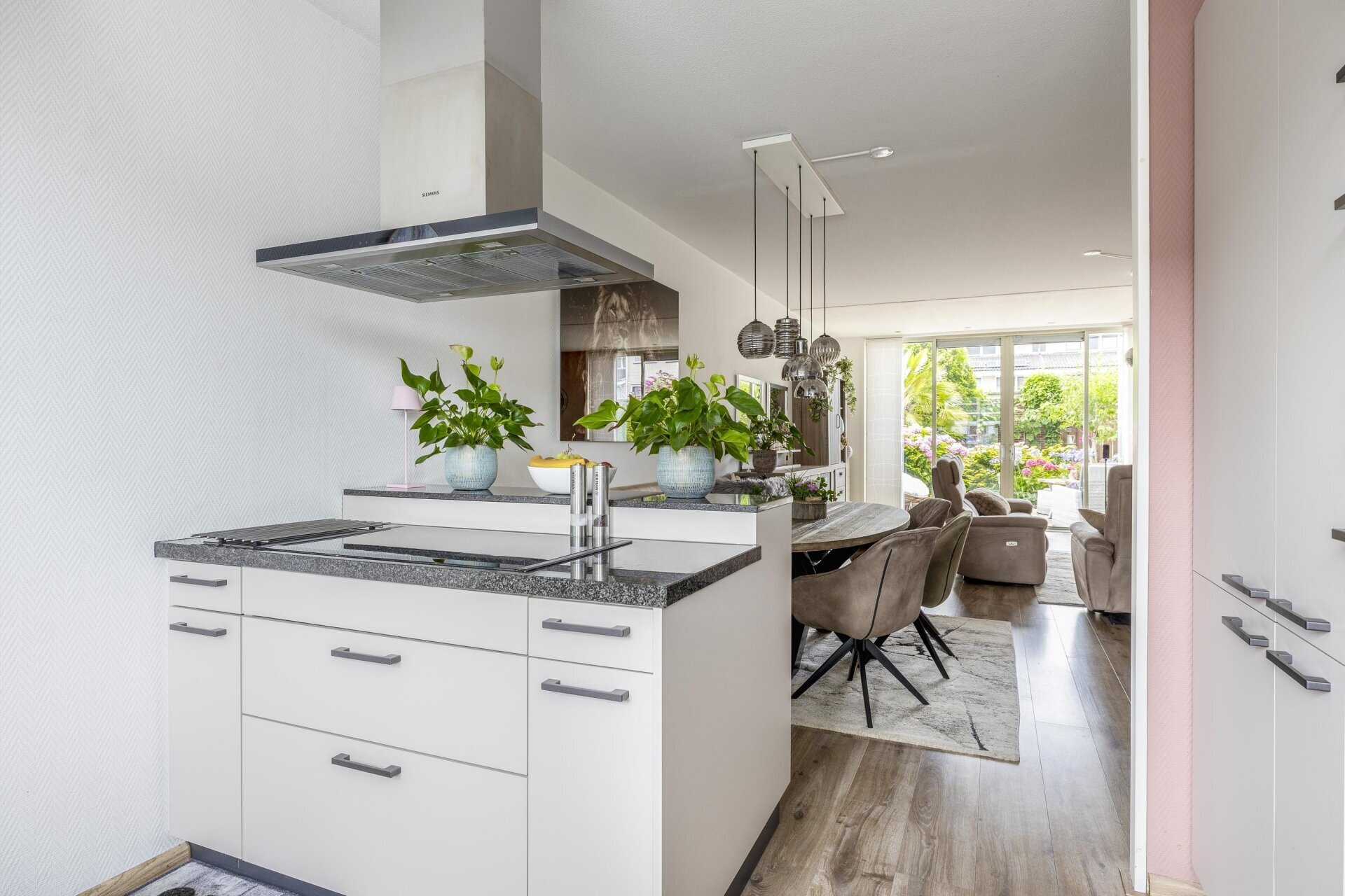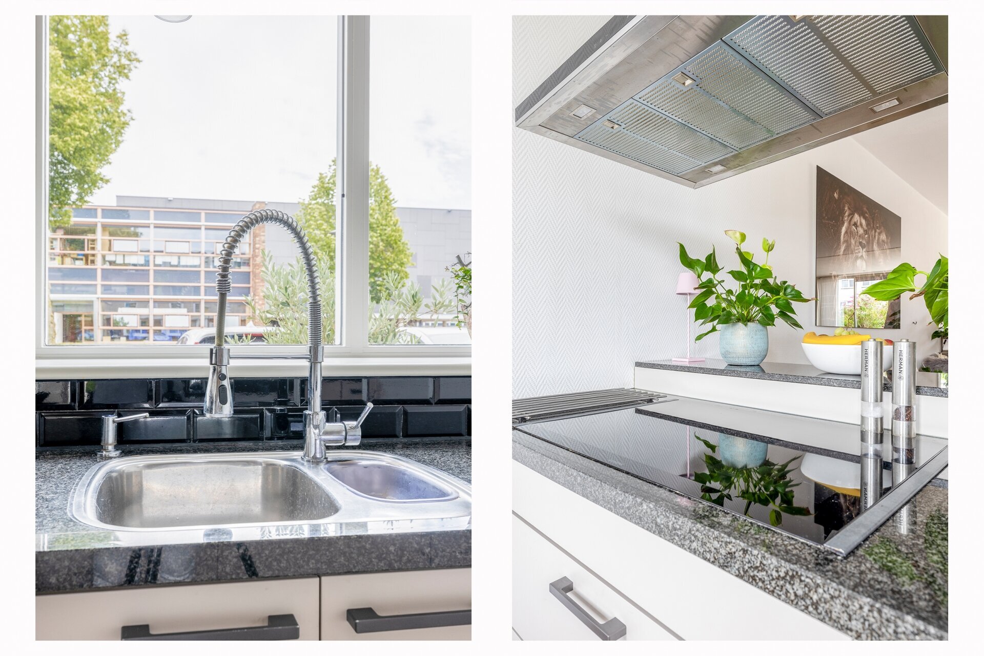 De halfopen keuken aan de voorzijde is van alle gemakken voorzien. Denk aan een strak zwart granieten werkblad, veel kastruimte en luxe Siemens inbouwapparatuur zoals een koelkast, oven, magnetron, inductiekookplaat, afzuigkap en vaatwasser. Grote ramen zorgen voor licht en een leuk zicht op de straat.