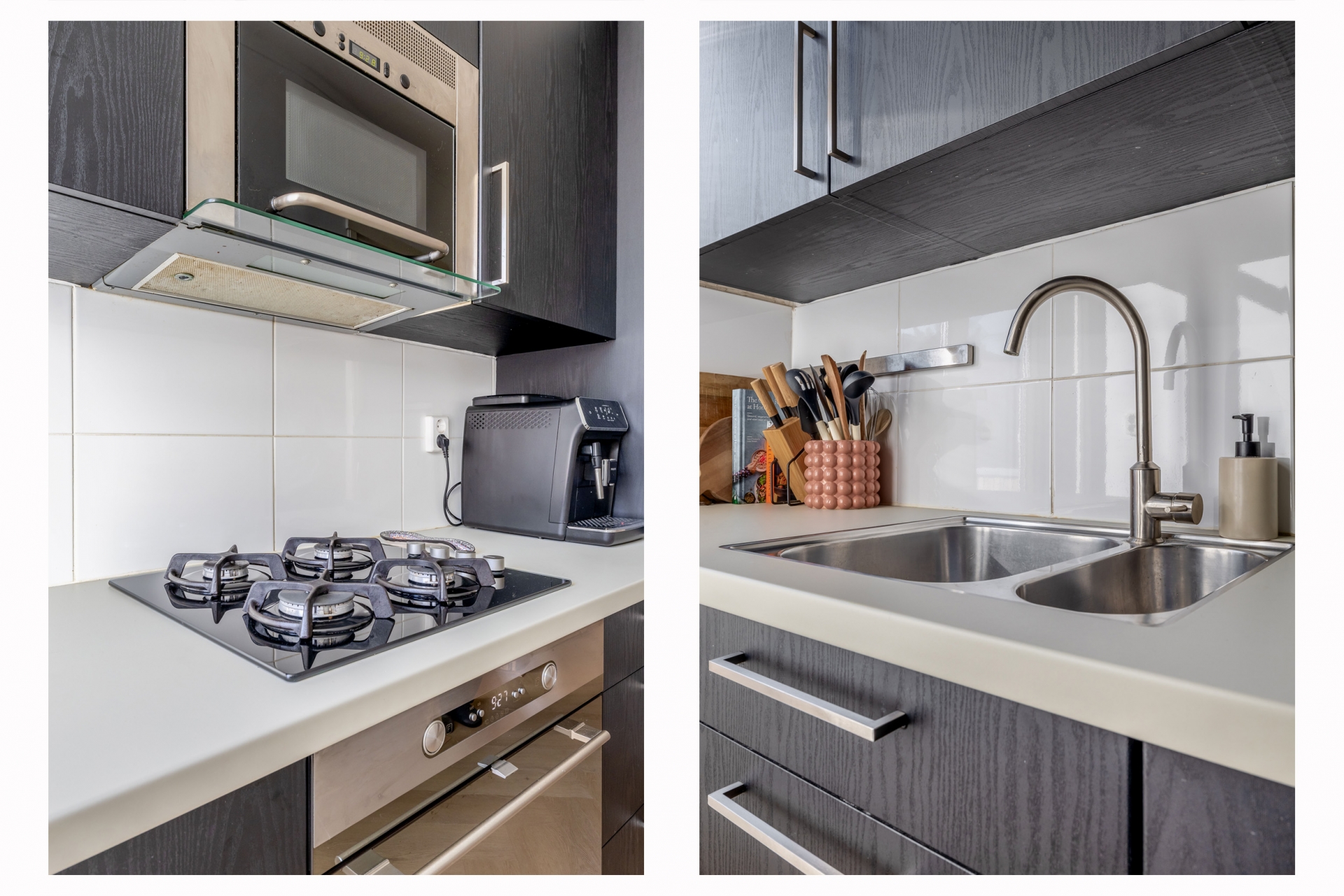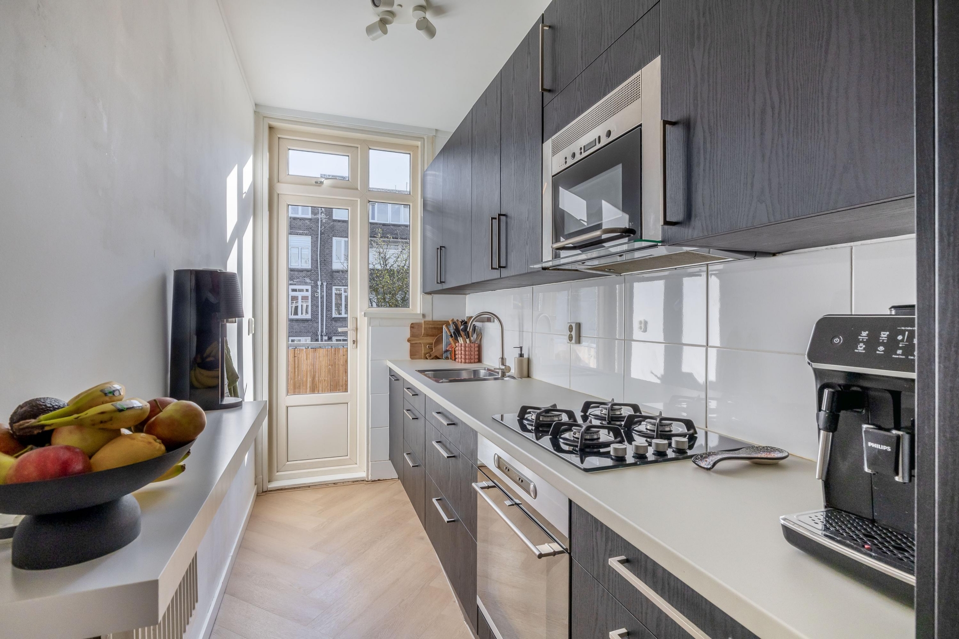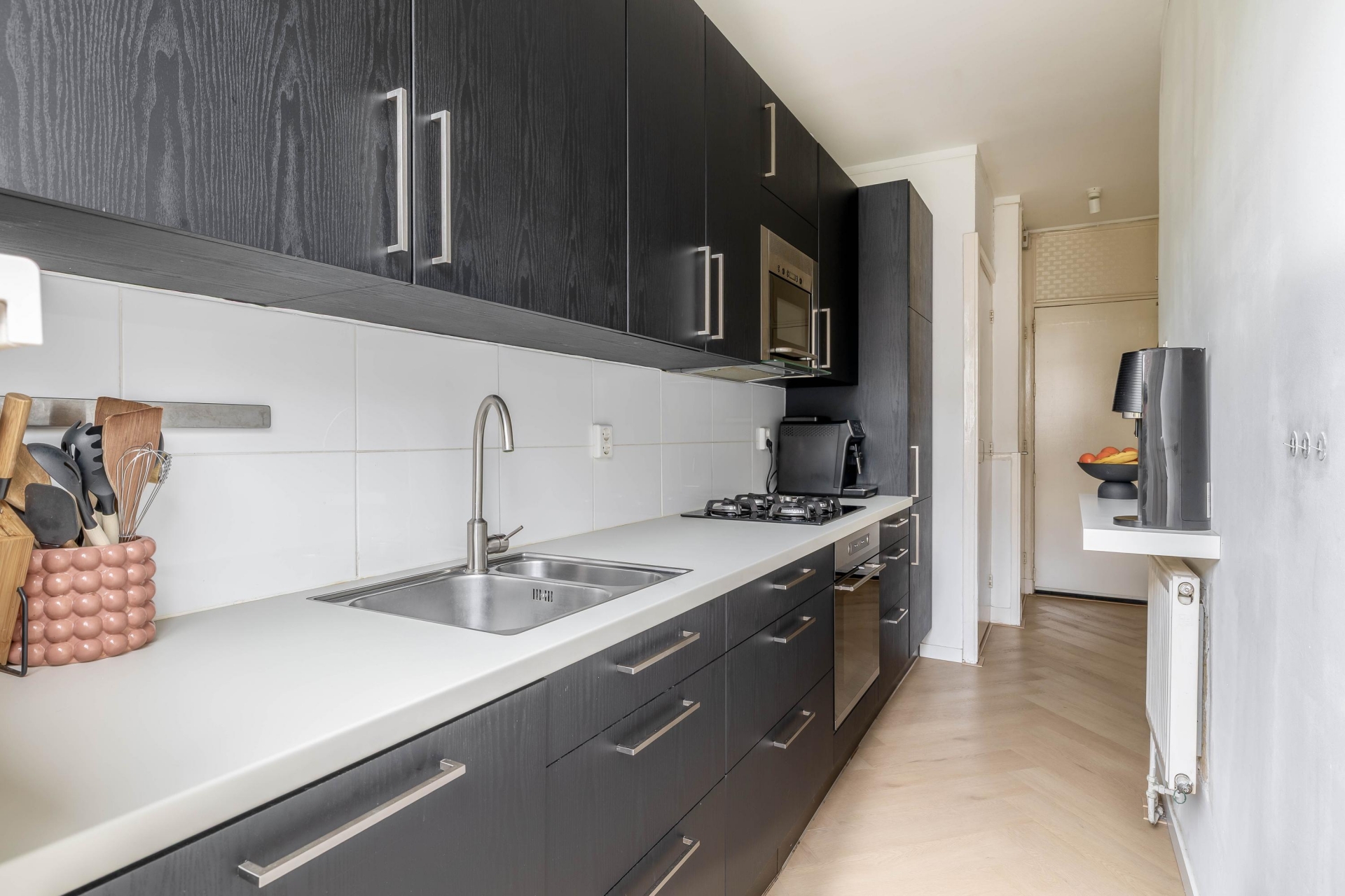 De woonkamer ligt aan de voorzijde en profiteert van grote raampartijen, waardoor er veel daglicht naar binnen valt. Hier heb je volop ruimte voor een fijne zithoek én een eettafel. Aan de achterzijde bevindt zich de keuken, uitgevoerd in een strakke, donkere opstelling met een licht werkblad. De keuken is praktisch ingericht en biedt voldoende werk- en kastruimte. Vanuit hier heb je direct toegang tot het balkon, gelegen op het noordoosten. Een fijne plek om de dag rustig te beginnen met een kop koffie.