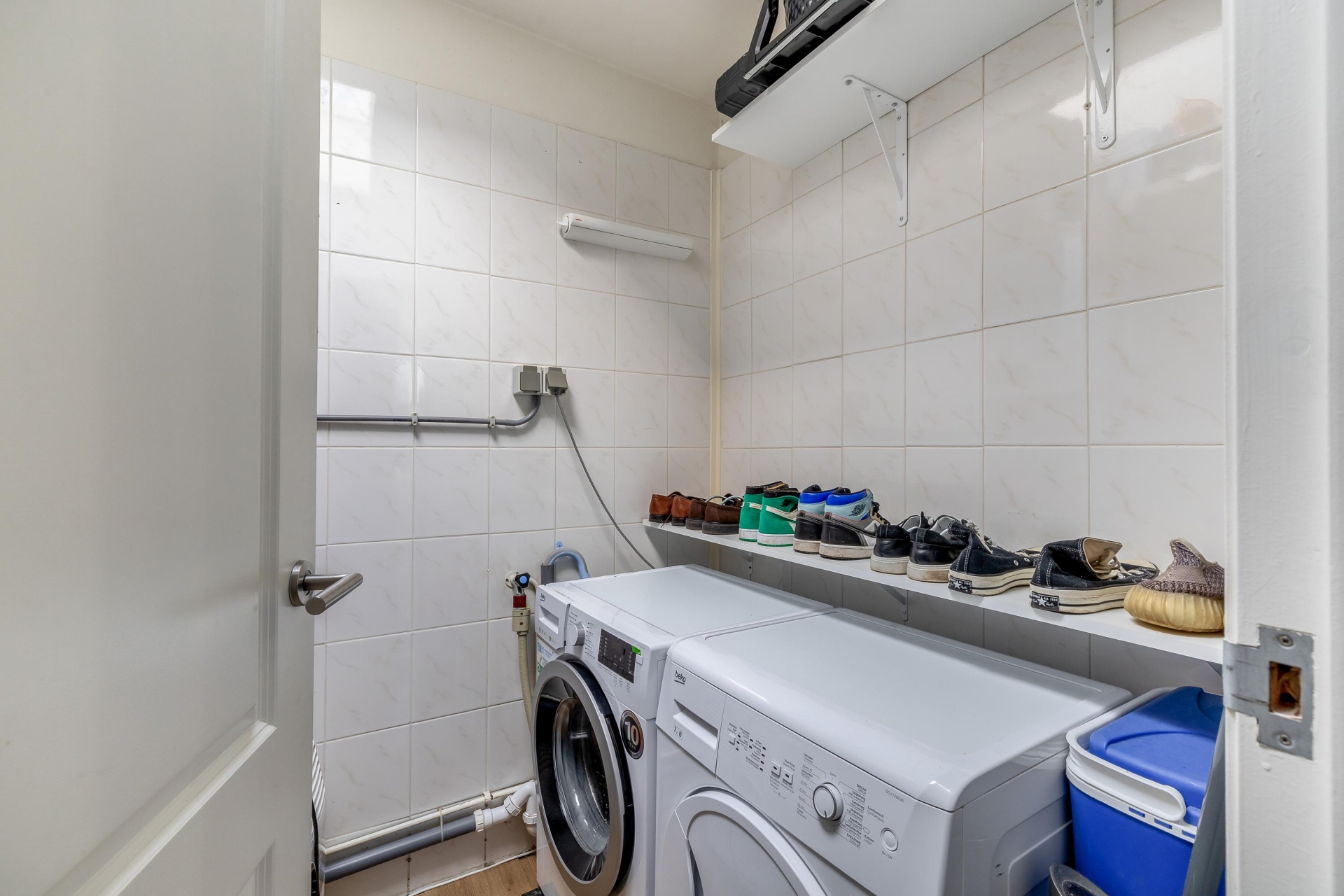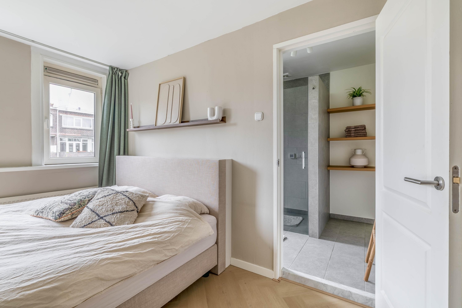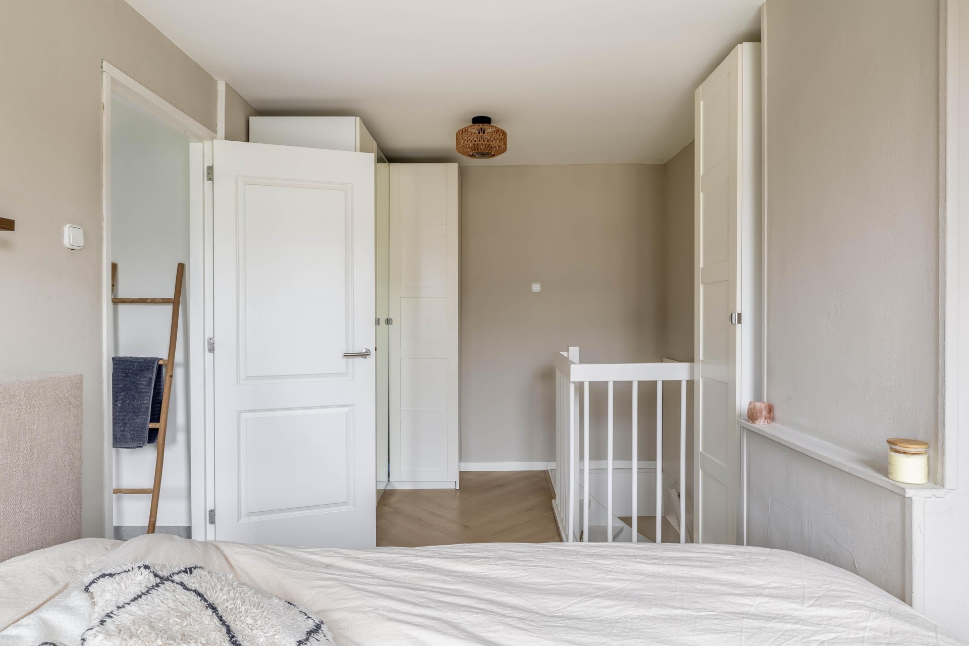 De indeling van dit huis is efficiënt en prettig. Op de woonverdieping vind je een eerste slaapkamer, die zich goed leent als werk-, logeer- of kinderkamer. Via de trap bereik je de bovenverdieping. Hier bevindt zich de ruime hoofdslaapkamer. Dit is echt een volwaardige kamer waar je met gemak een groot bed en een kledingkast kwijt kunt. Dankzij de opzet voelt deze verdieping rustig en privé aan. Daarnaast vind je hier de badkamer, voorzien van een douche, wastafel en toilet. Ook is er een aparte wasruimte aanwezig, wat het wooncomfort extra vergroot. Alles is praktisch ingericht en goed onderhouden.
