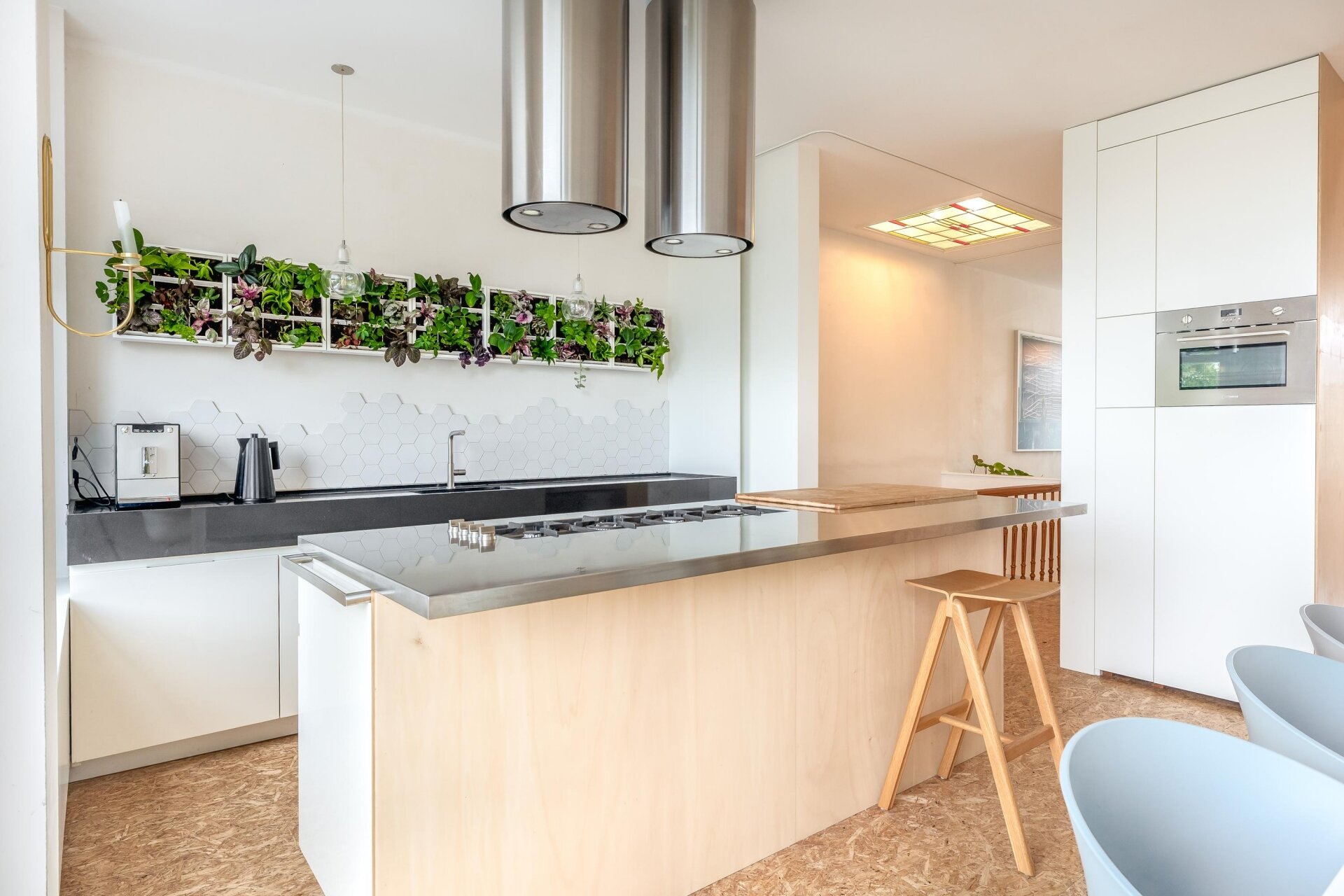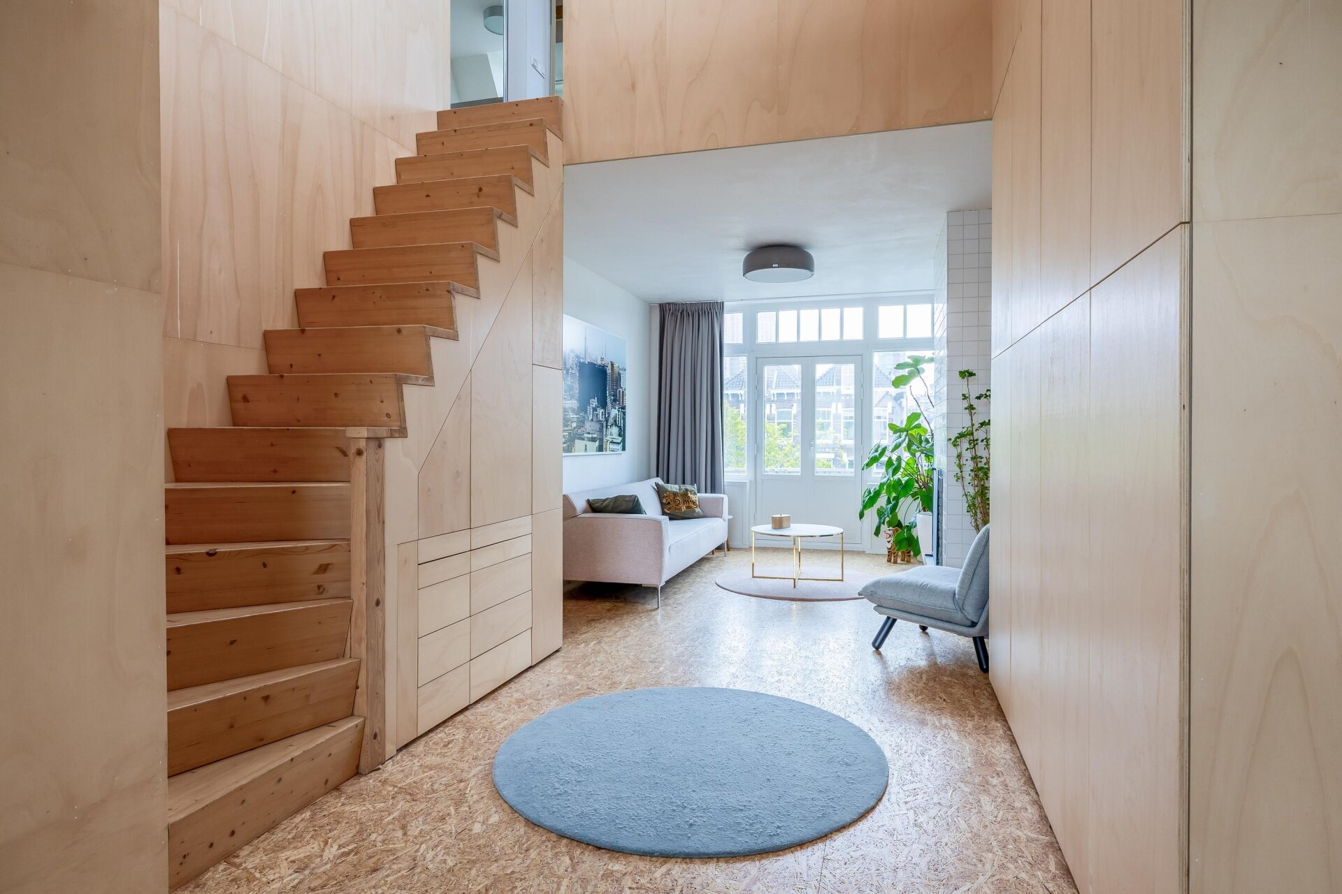 De derde verdieping is één grote open leefruimte met een moderne keuken aan de voorzijde en een sfeervolle woonkamer aan de achterzijde, waar de schuifpui je leidt naar het terras. De houten trap en vide zorgen voor een indrukwekkend ruimtelijk effect. Dankzij de open verbinding met de vierde verdieping valt het daglicht vanuit meerdere kanten binnen en ontstaat er een fijn gevoel van contact tussen de verdiepingen.