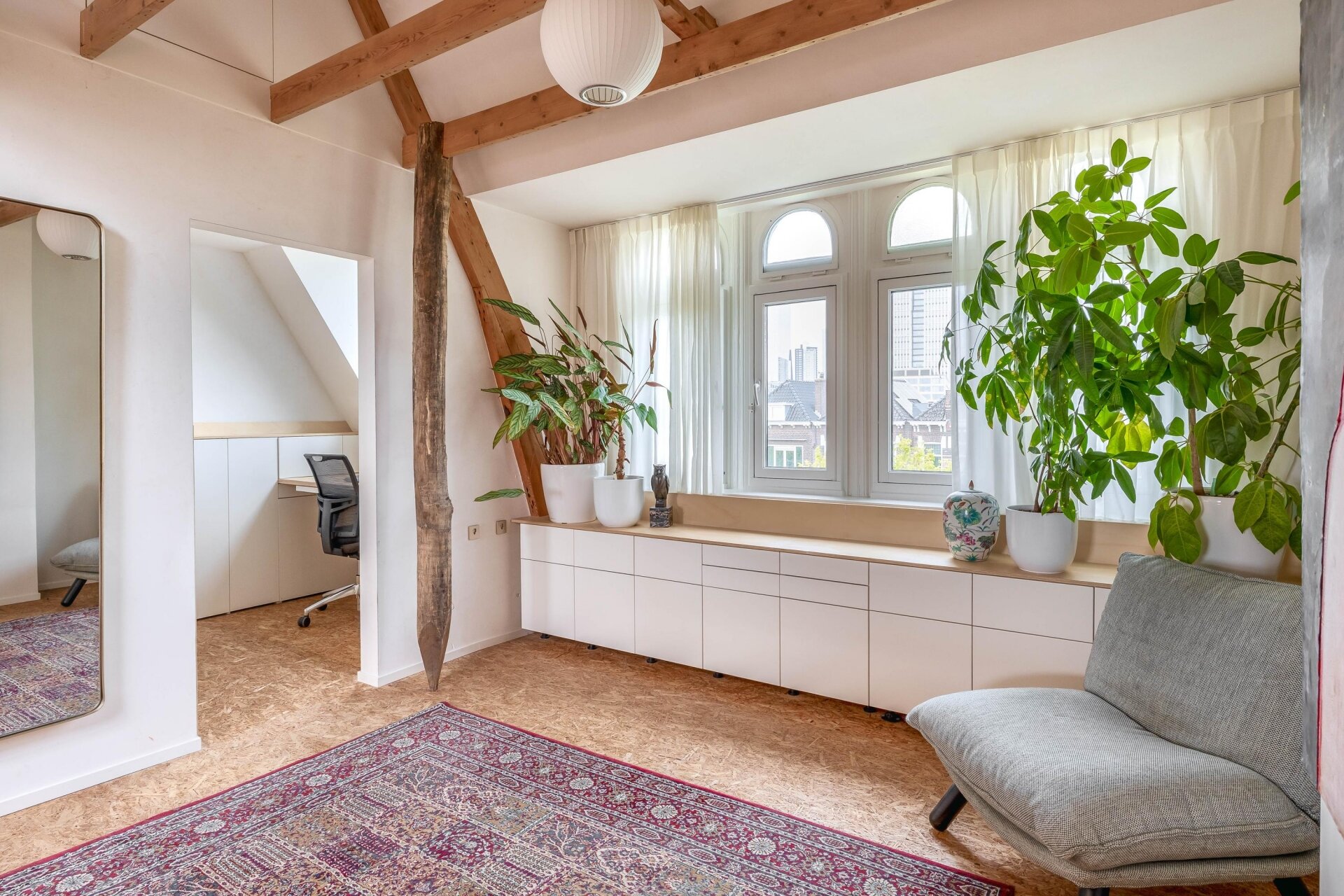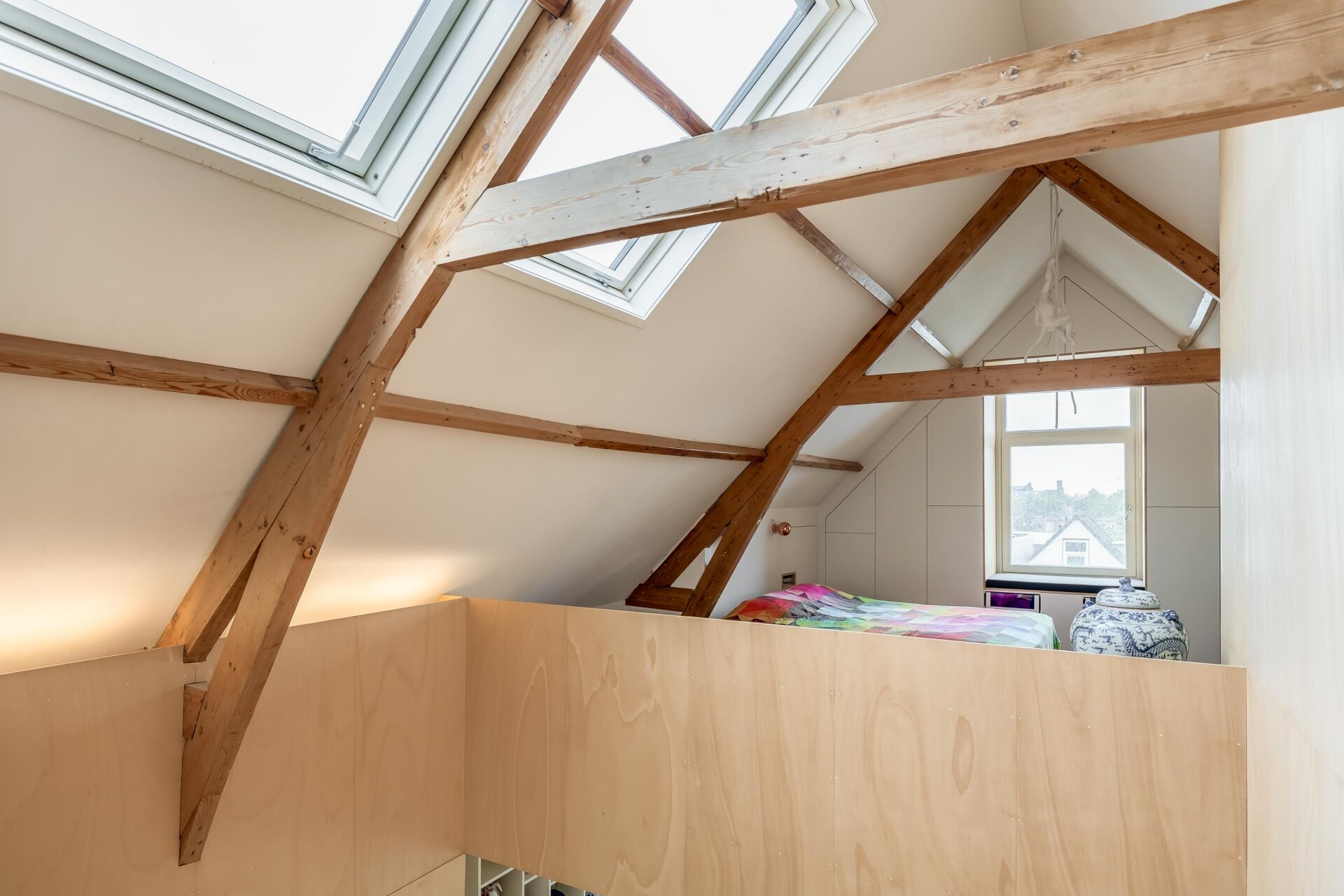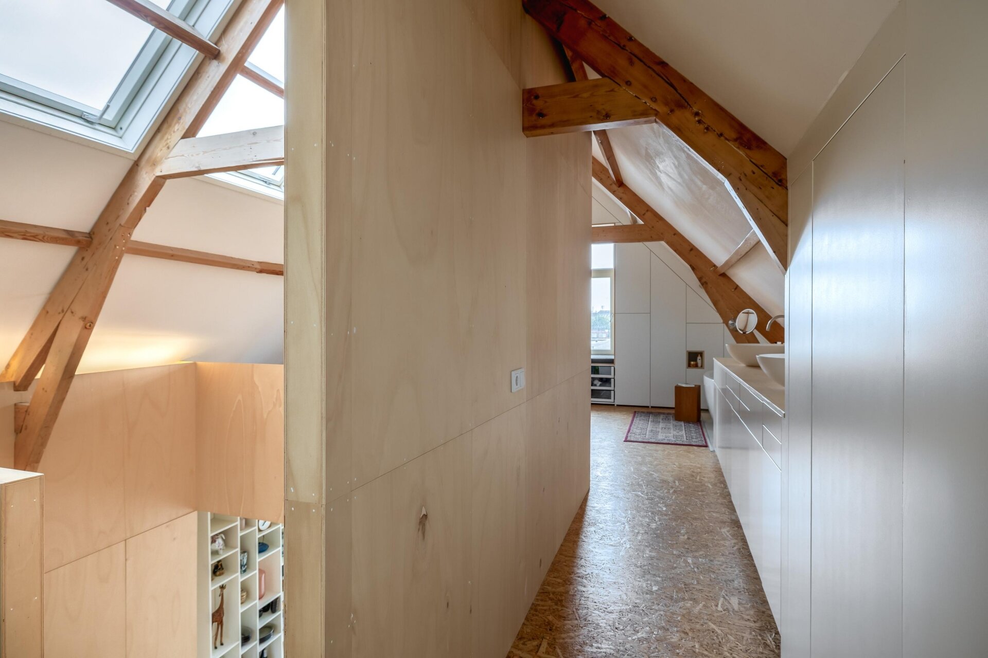 De vierde verdieping is nu ingericht als open slaap- en badruimte, met zichtbare houten balken, dubbele wastafels, veel opbergruimte en een vrijstaand ligbad. Een heerlijke plek waar je kunt ontspannen en wegkruipen van de drukte van de dag. Dankzij het slimme ontwerp is er overal balans tussen karakter, openheid en privacy.