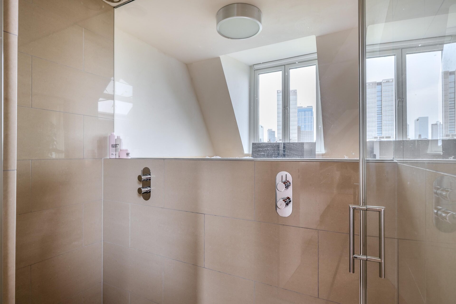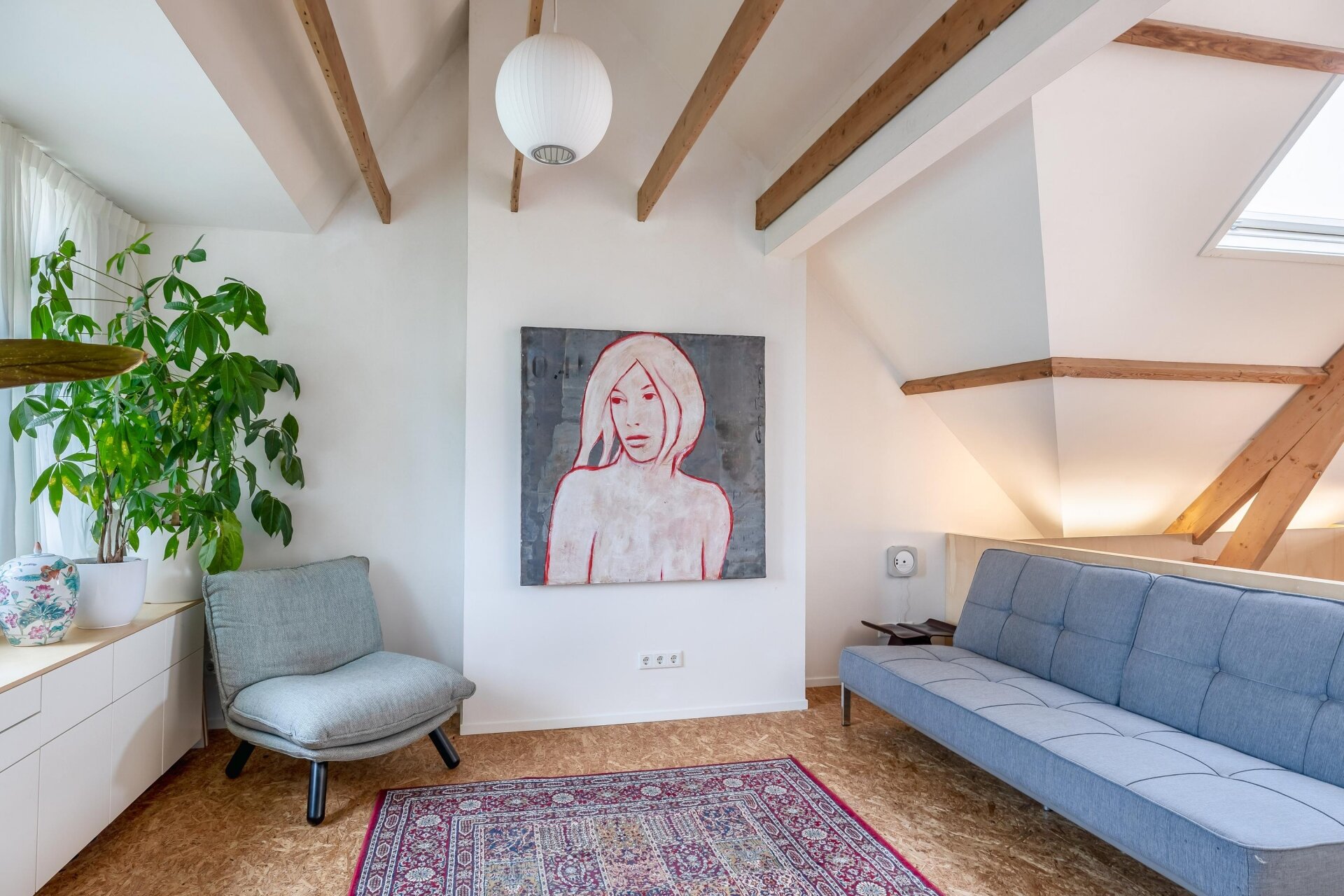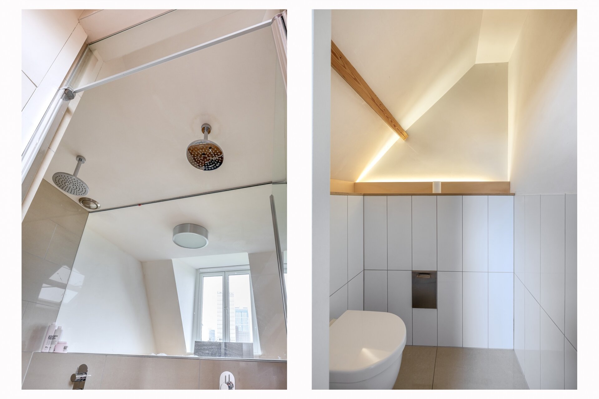 De vierde verdieping is nu ingericht als open slaap- en badruimte, met zichtbare houten balken, dubbele wastafels, veel opbergruimte en een vrijstaand ligbad. Een heerlijke plek waar je kunt ontspannen en wegkruipen van de drukte van de dag. Dankzij het slimme ontwerp is er overal balans tussen karakter, openheid en privacy.