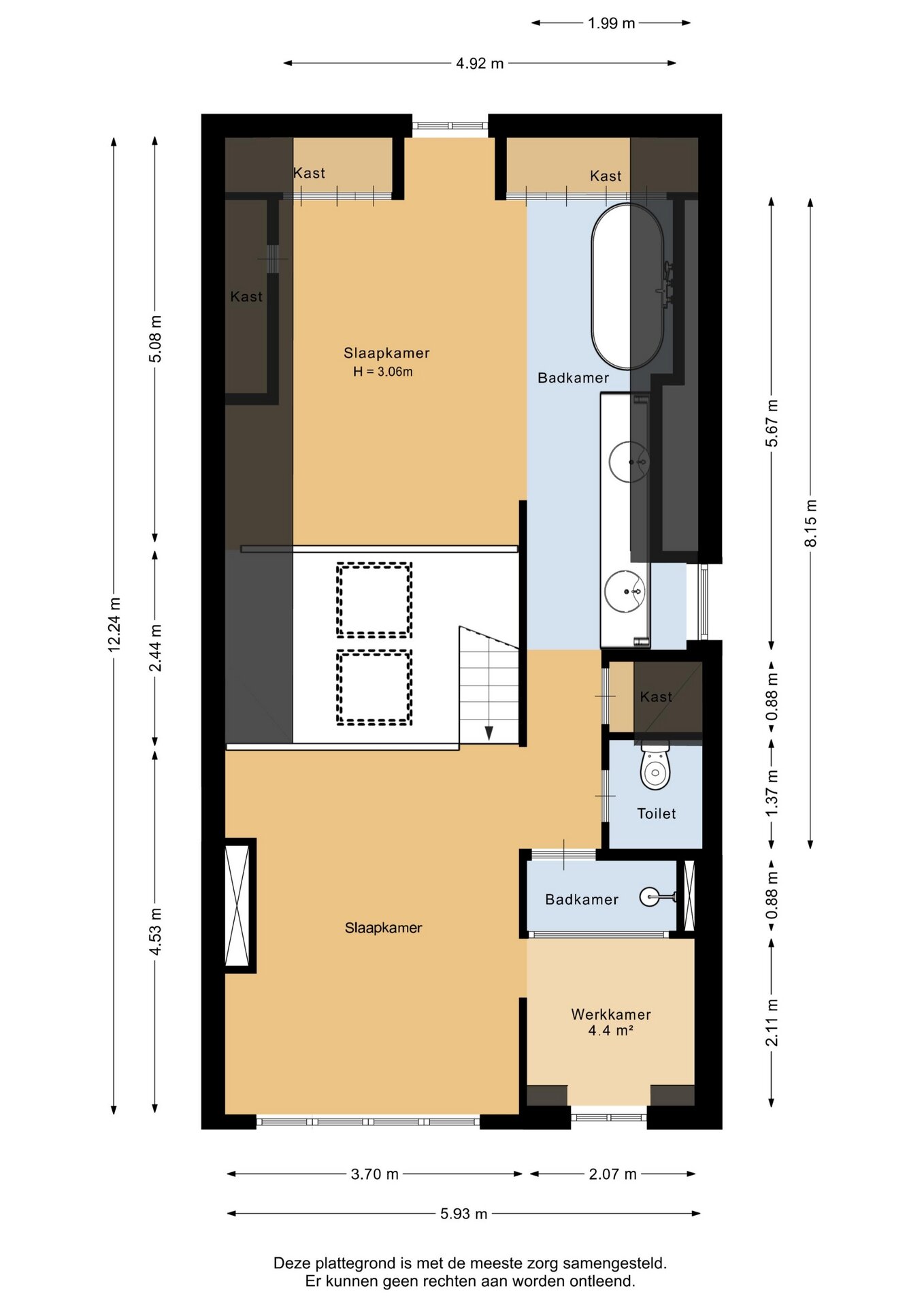 “Deze informatie is door ons met de nodige zorgvuldigheid samengesteld. Onzerzijds wordt echter geen enkele aansprakelijkheid aanvaard voor enige onvolledigheid, onjuistheid of anderszins, dan wel de gevolgen daarvan. Alle opgegeven maten en oppervlakten zijn indicatief.”