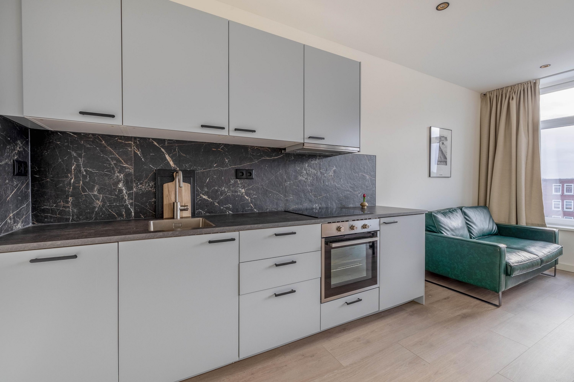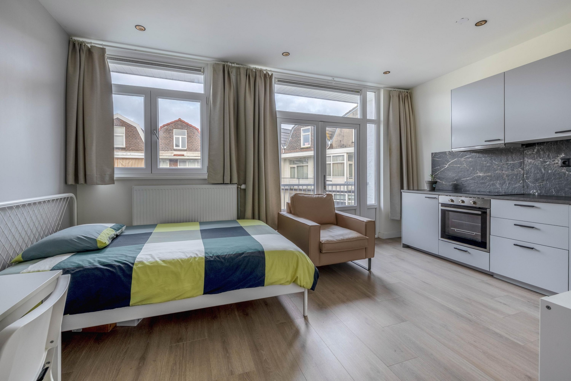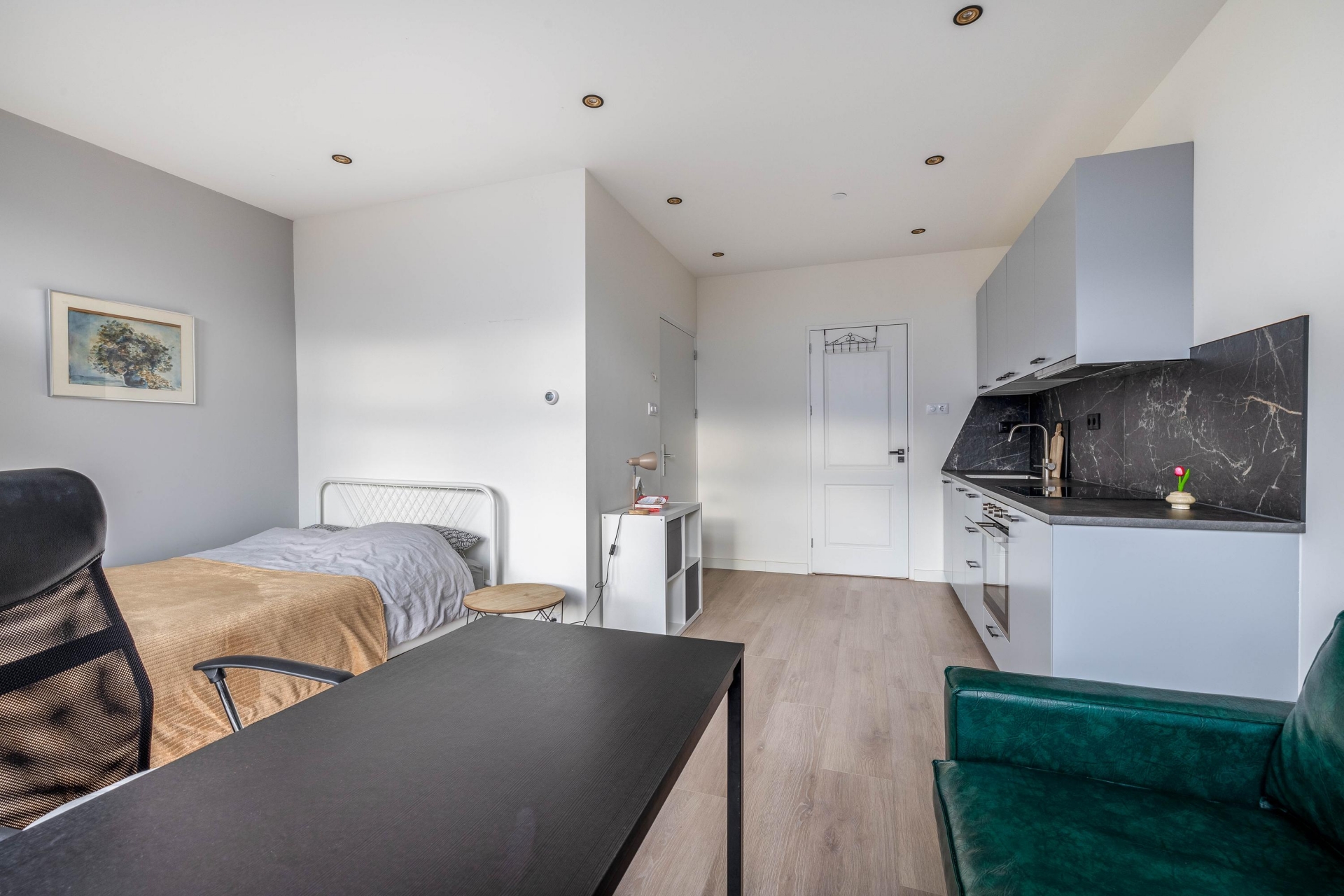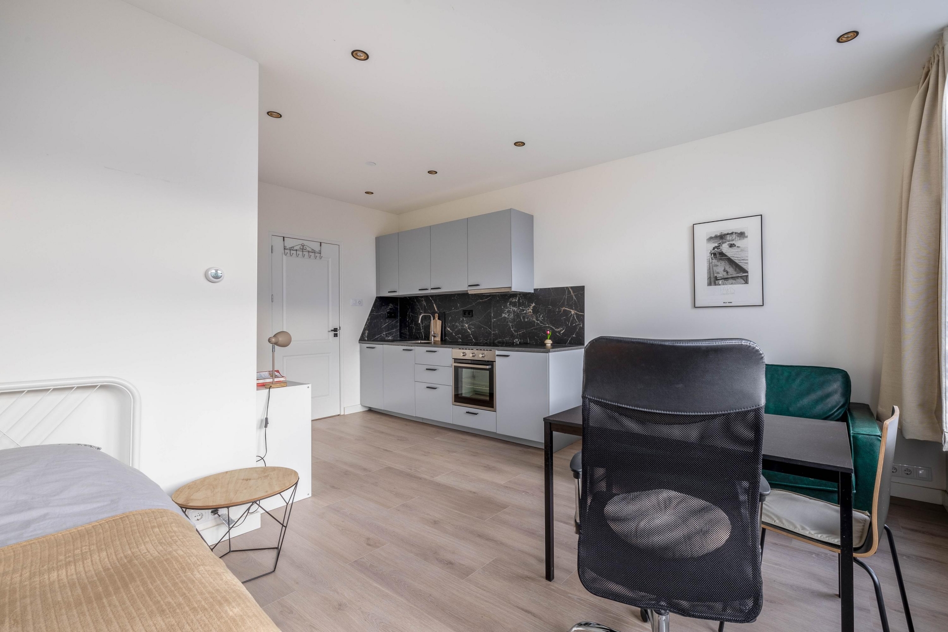 Slaapkamer/Studio 2 ligt aan de zuidwestzijde, waardoor er veel licht naar binnen valt. Ook hier is de afwerking hoogwaardig met een moderne keuken en een frisse badkamer.