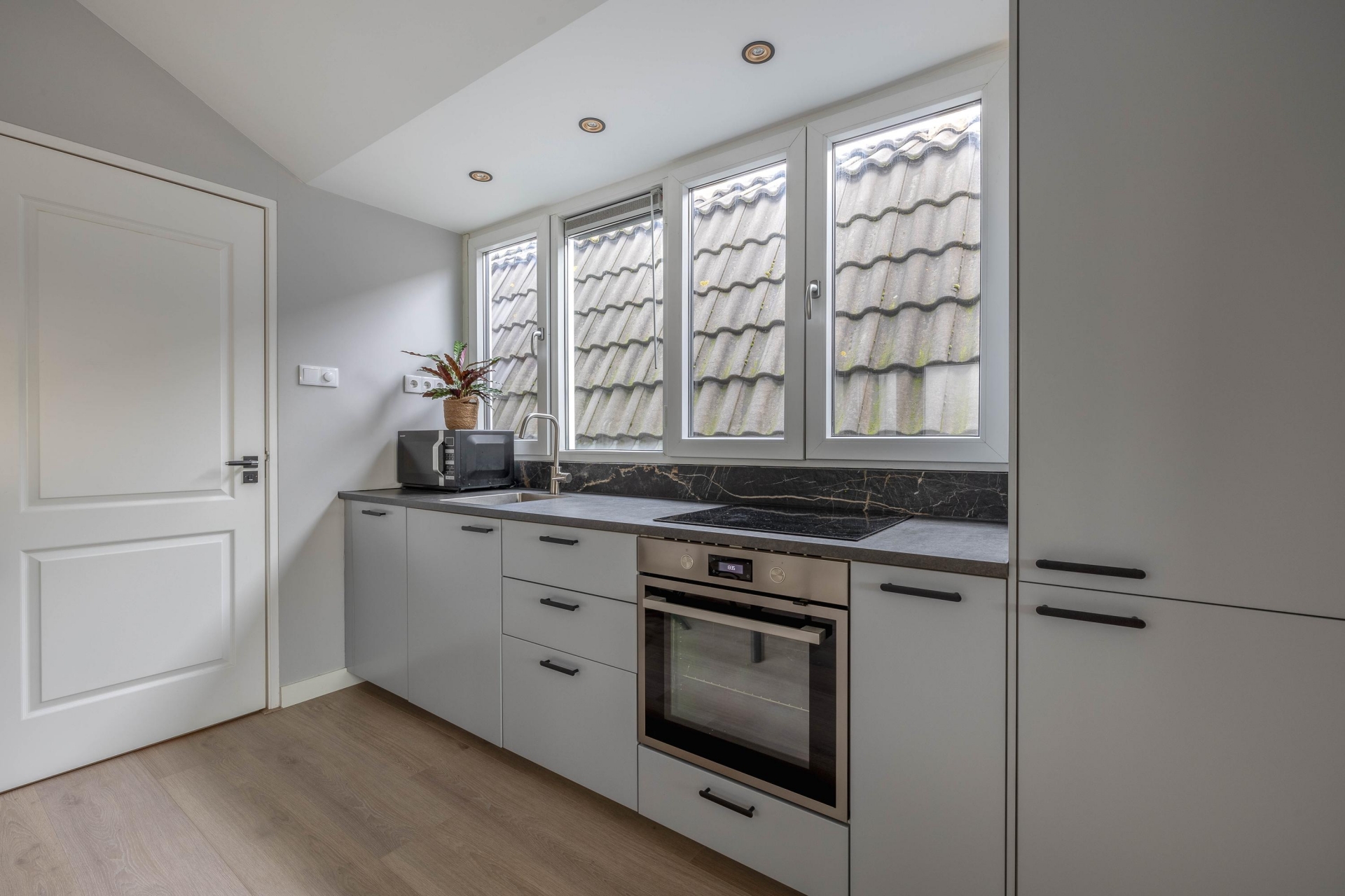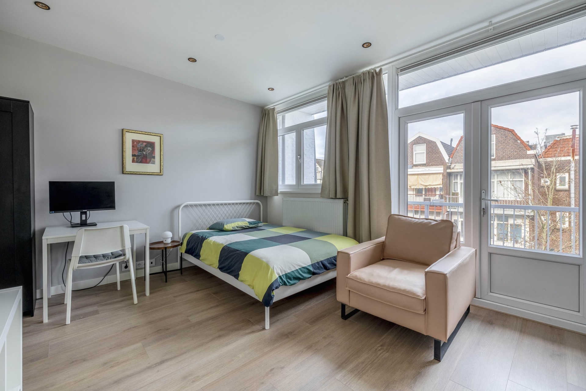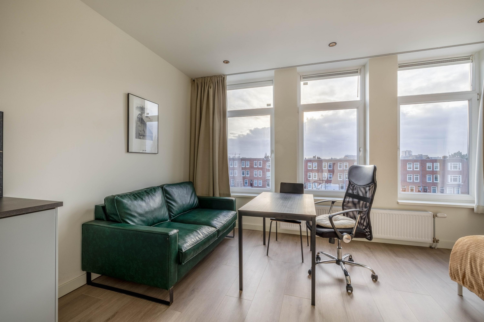 Slaapkamer/Studio 2 ligt aan de zuidwestzijde, waardoor er veel licht naar binnen valt. Ook hier is de afwerking hoogwaardig met een moderne keuken en een frisse badkamer.