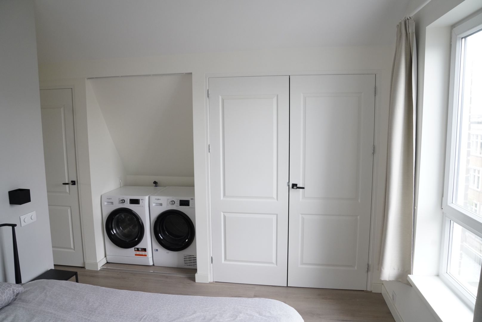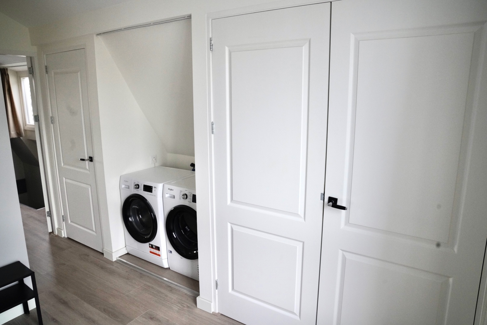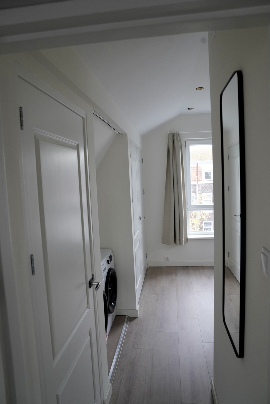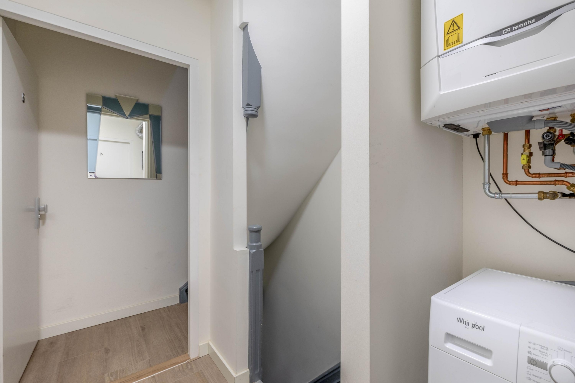 Op de overloop vind je de technische ruimte met cv-ketel en een was/droog combinatie machine voor het gebruik van de onderste verdieping.