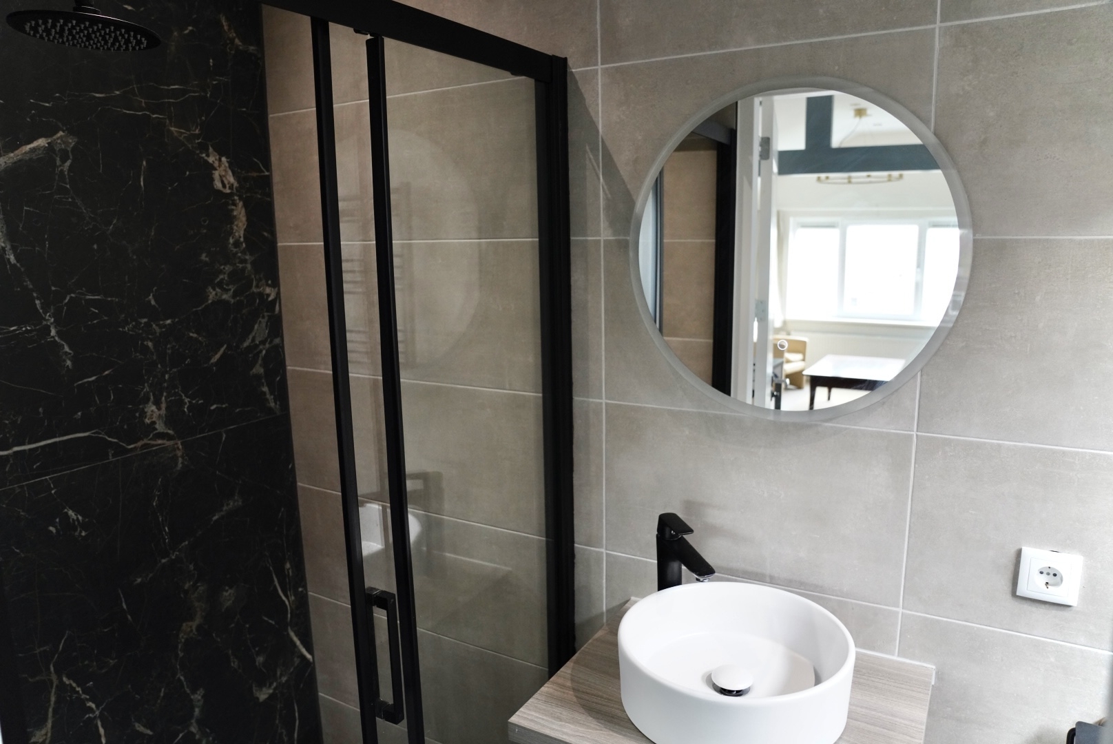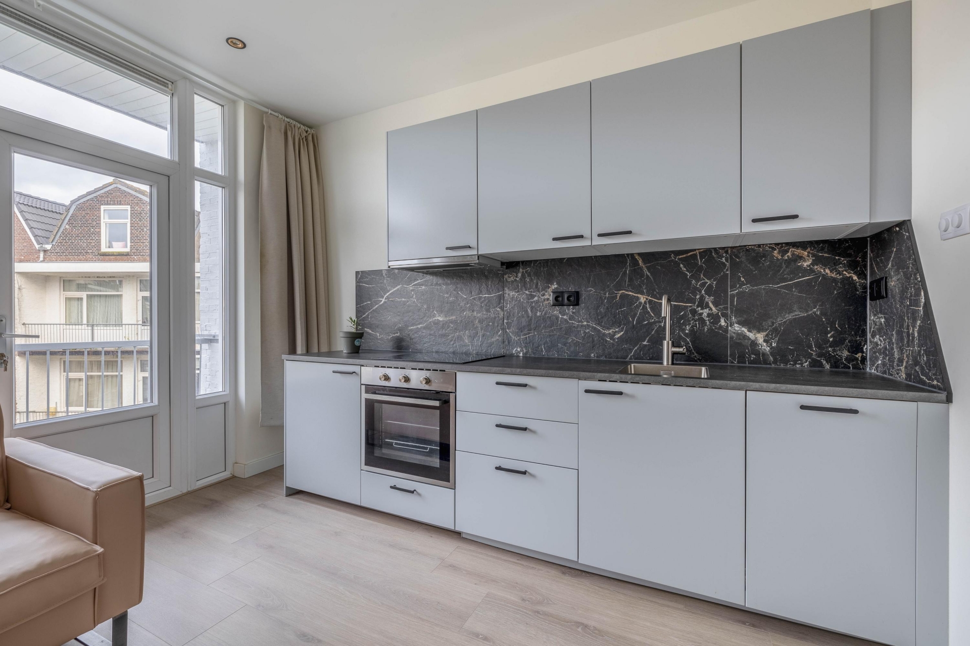Slaapkamer/Studio 1 ligt aan de noordoostzijde en beschikt over een balkon. De leefruimte is praktisch ingedeeld met een gezellige zithoek en slaapgedeelte. De open keuken is uitgerust met moderne inbouwapparatuur en een inductiekookplaat. De badkamer is stijlvol en voorzien van een inloopdouche, toilet en wastafelmeubel.