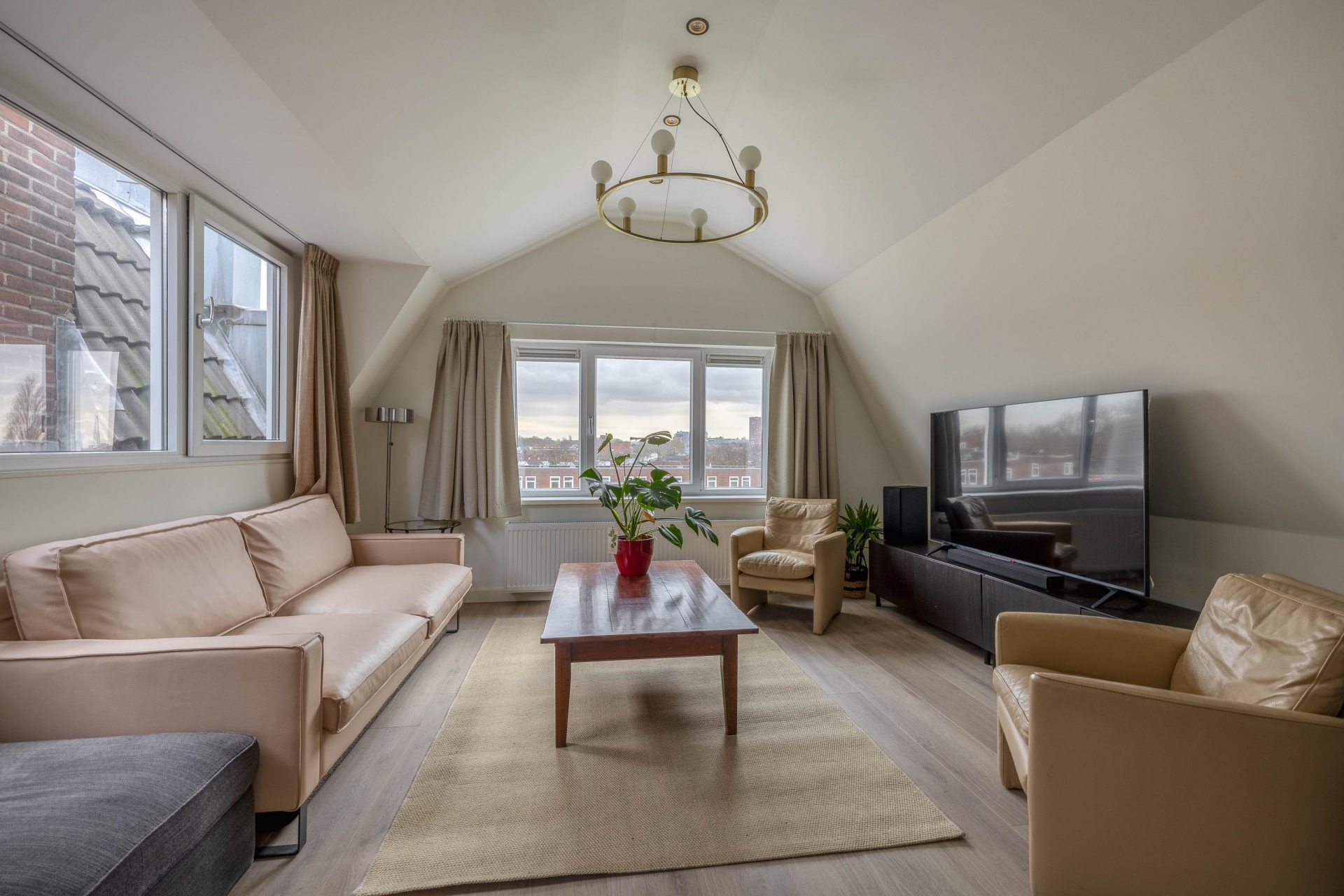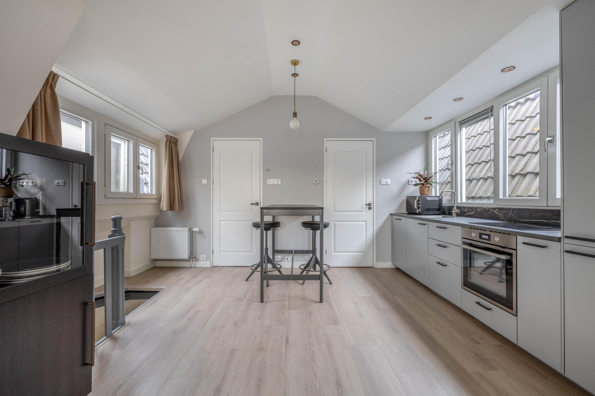 Dankzij de slimme indeling van nu kun je ervoor kiezen de woning als 3 losse eenheden te gebruiken, of als geheel appartement met 3 slaapkamers. Voor wie 1 hele woonlaag als woonkamer wil: de zolderetage is met een kleine verbouwing ook te veranderen tot 1 hele woonverdieping met open keuken en de onderste etage als slaapgedeelte te gebruiken. Onder de huidige keukens is het laminaat al netjes doorgelegd, waardoor deze eenvoudig weggehaald kunnen worden. Wat je ook voor ogen hebt, je ervaart het gemakt van een modern appartement met twee volwaardige woonlagen en een woonoppervlakte van circa 102 m². De mogelijkheden zijn ruim!