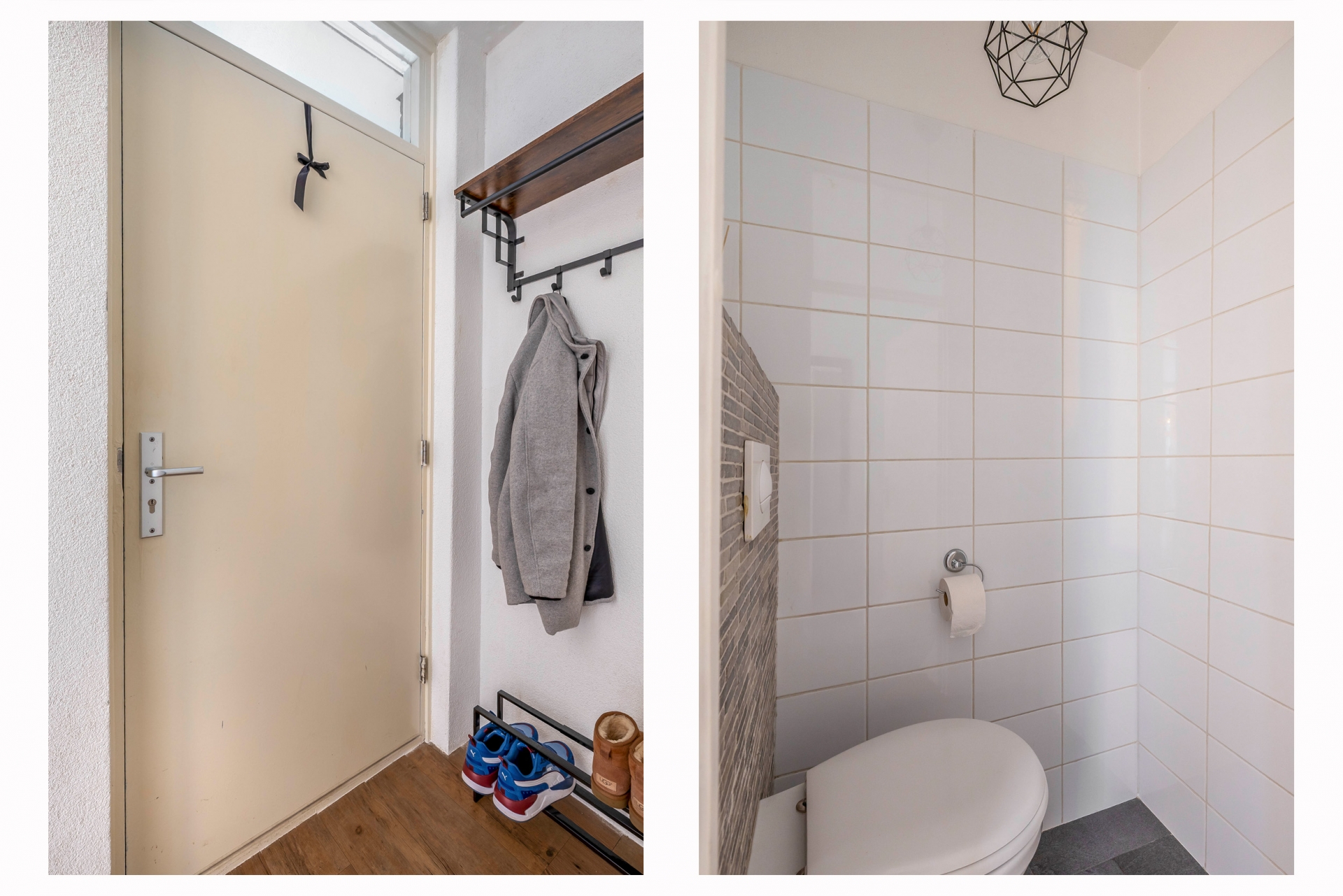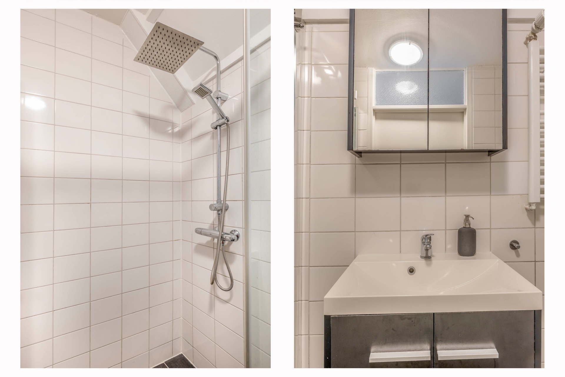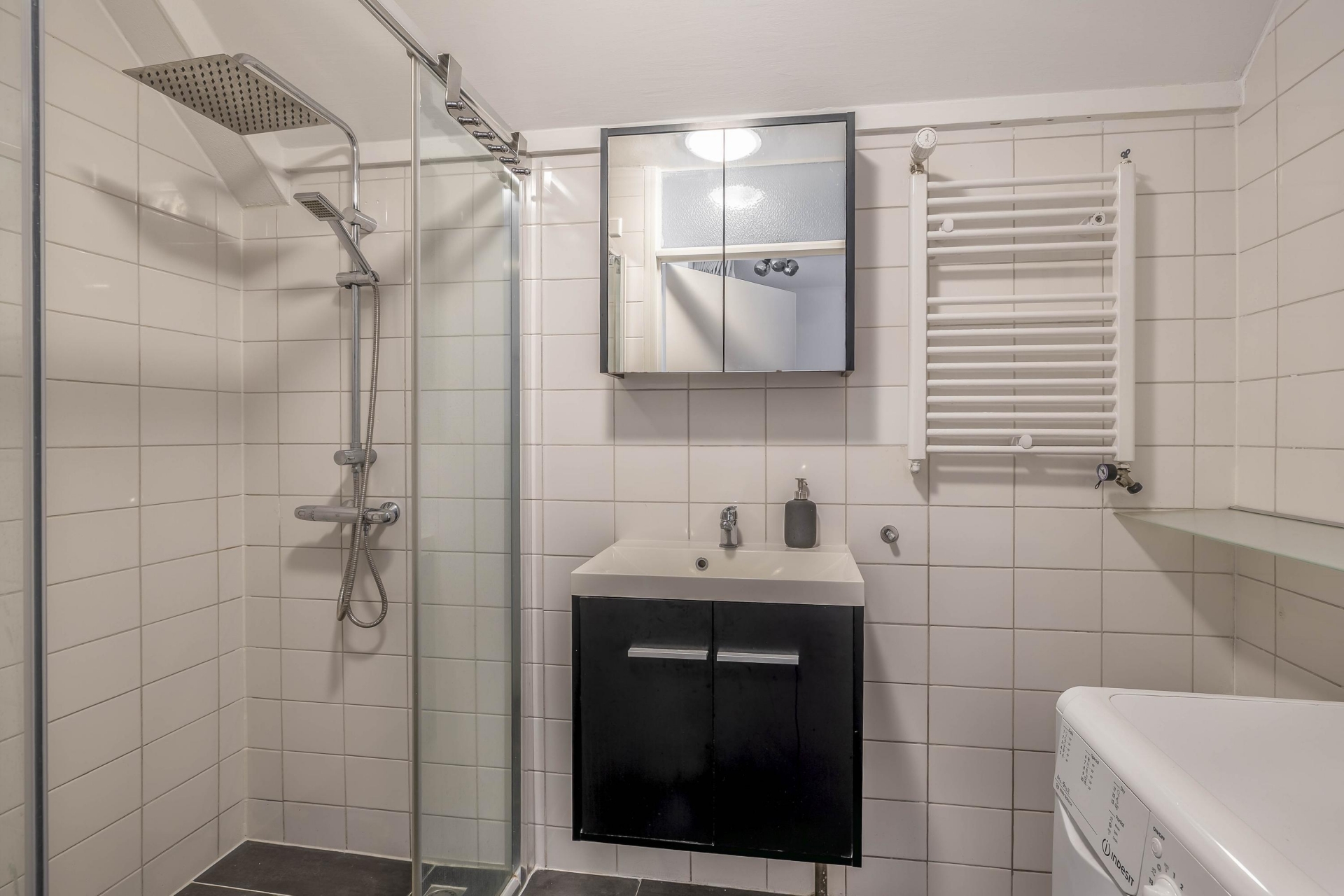 De badkamer is netjes en functioneel, met een ruime inloopdouche, wastafelmeubel, aansluiting voor de wasmachine en een handdoekradiator. Alles is strak betegeld in neutrale kleuren, waardoor je hier voorlopig niets aan hoeft te doen.