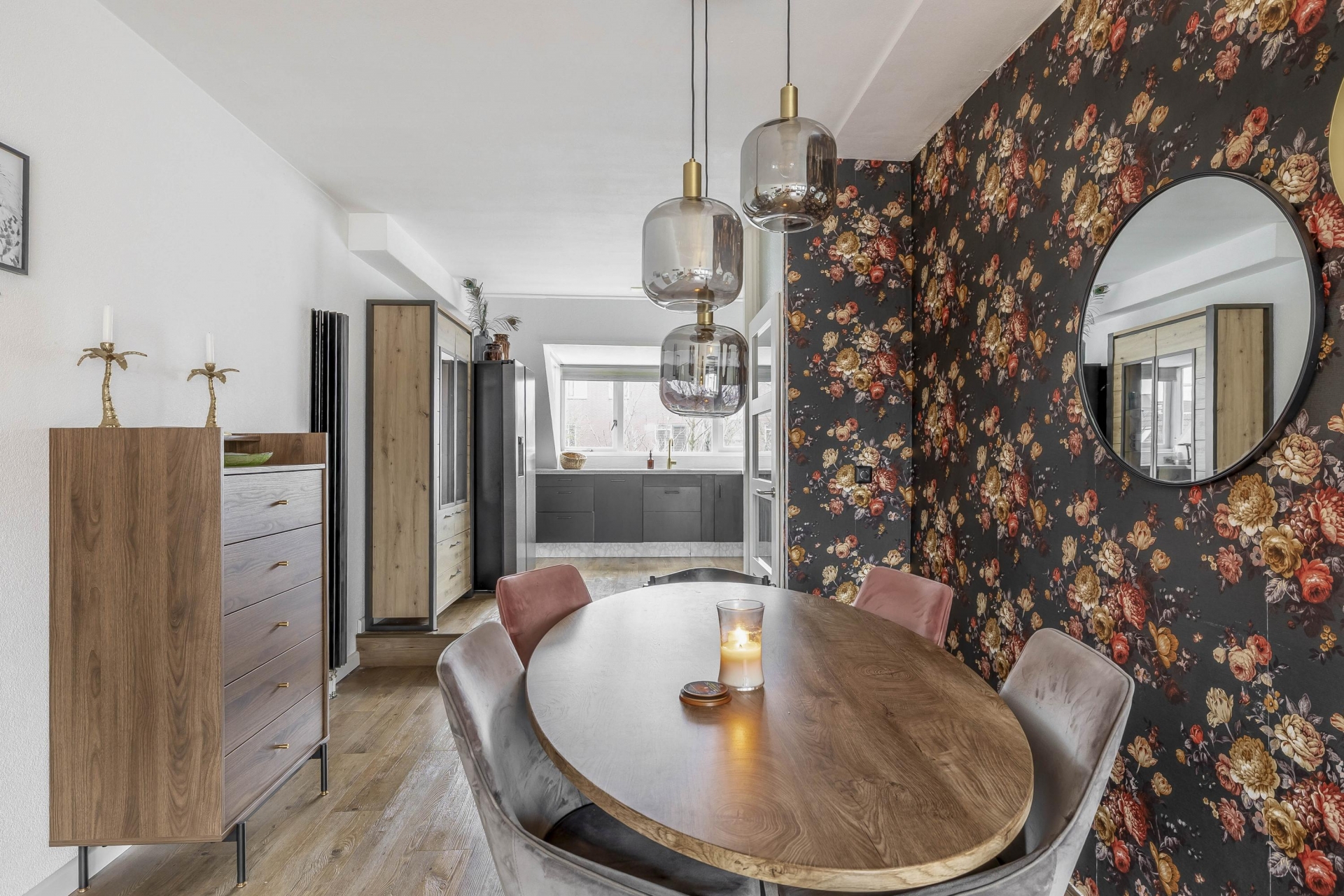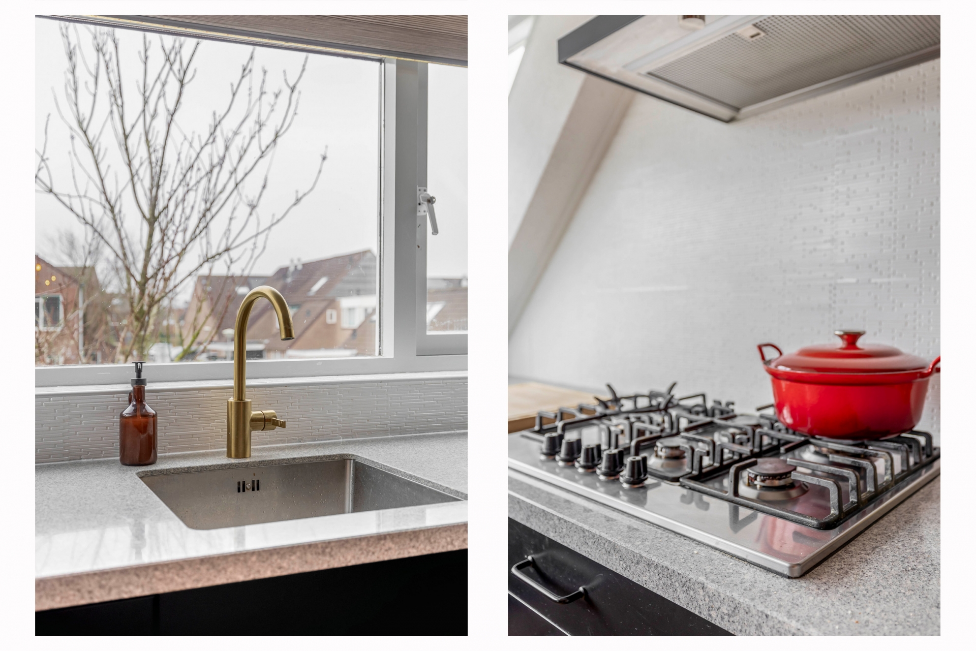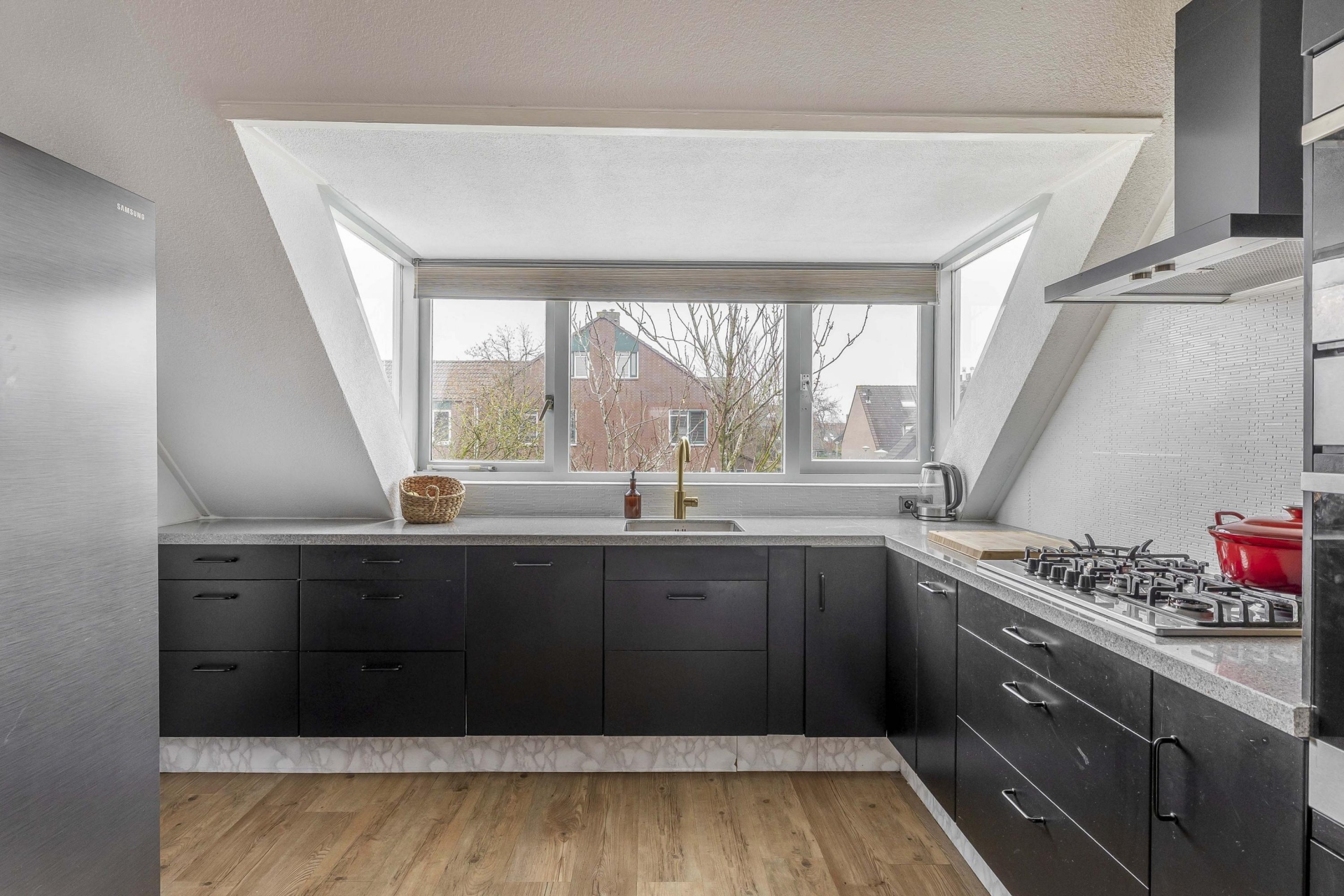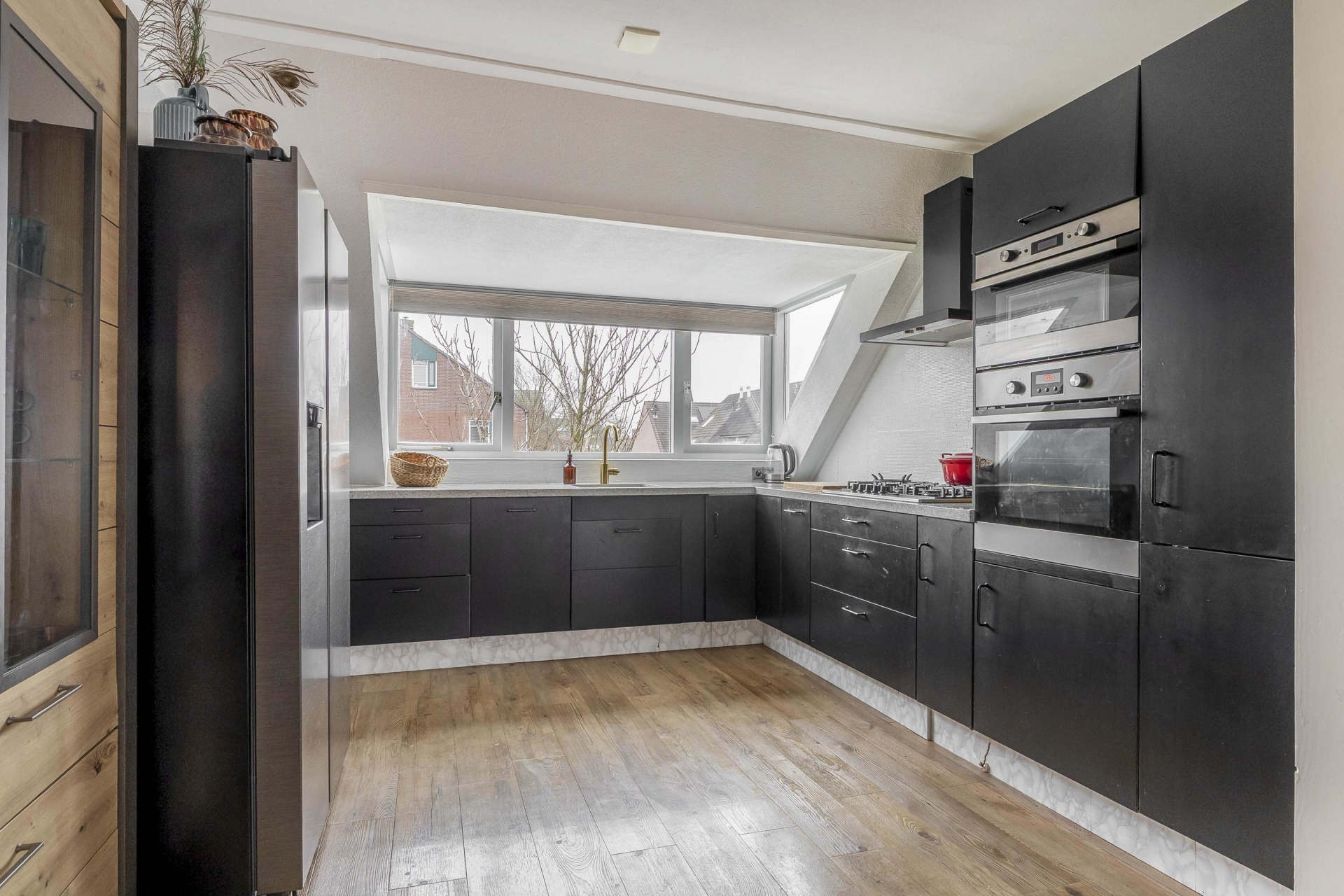 De keuken is een echte blikvanger. Deze is uitgevoerd in een moderne hoekopstelling en voorzien van diverse inbouwapparatuur. Denk aan een 5-pits gaskookplaat, vaatwasser, afzuigkap en voldoende kastruimte voor al je keukenspullen. De grote raampartij bij het aanrecht geeft je vrij uitzicht over de buurt én veel natuurlijke lichtinval tijdens het koken. Of je nu uitgebreid kookt voor vrienden of gewoon snel een maaltijd bereidt na je werk, dit is een keuken waar je blij van wordt.