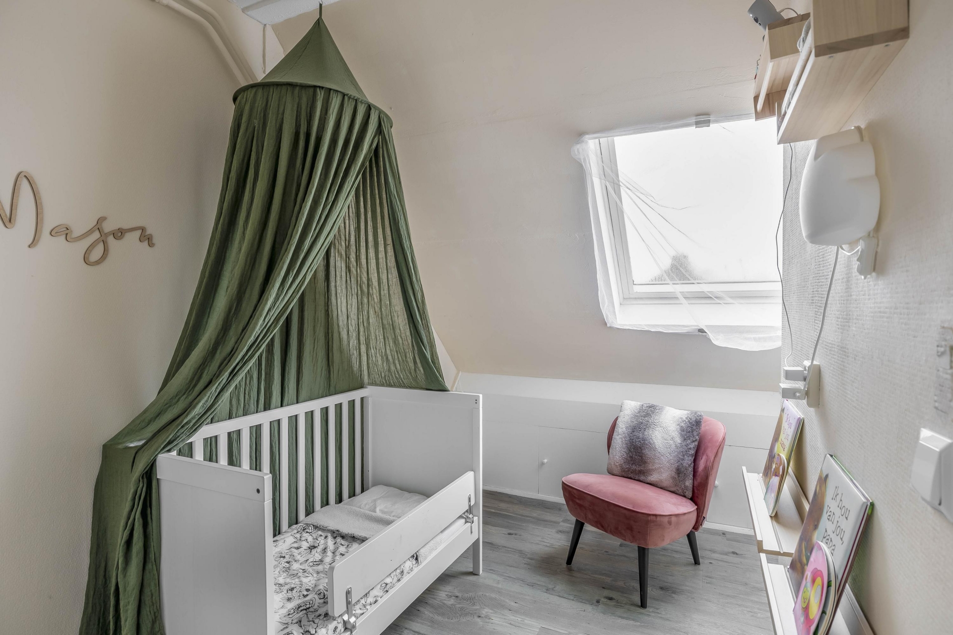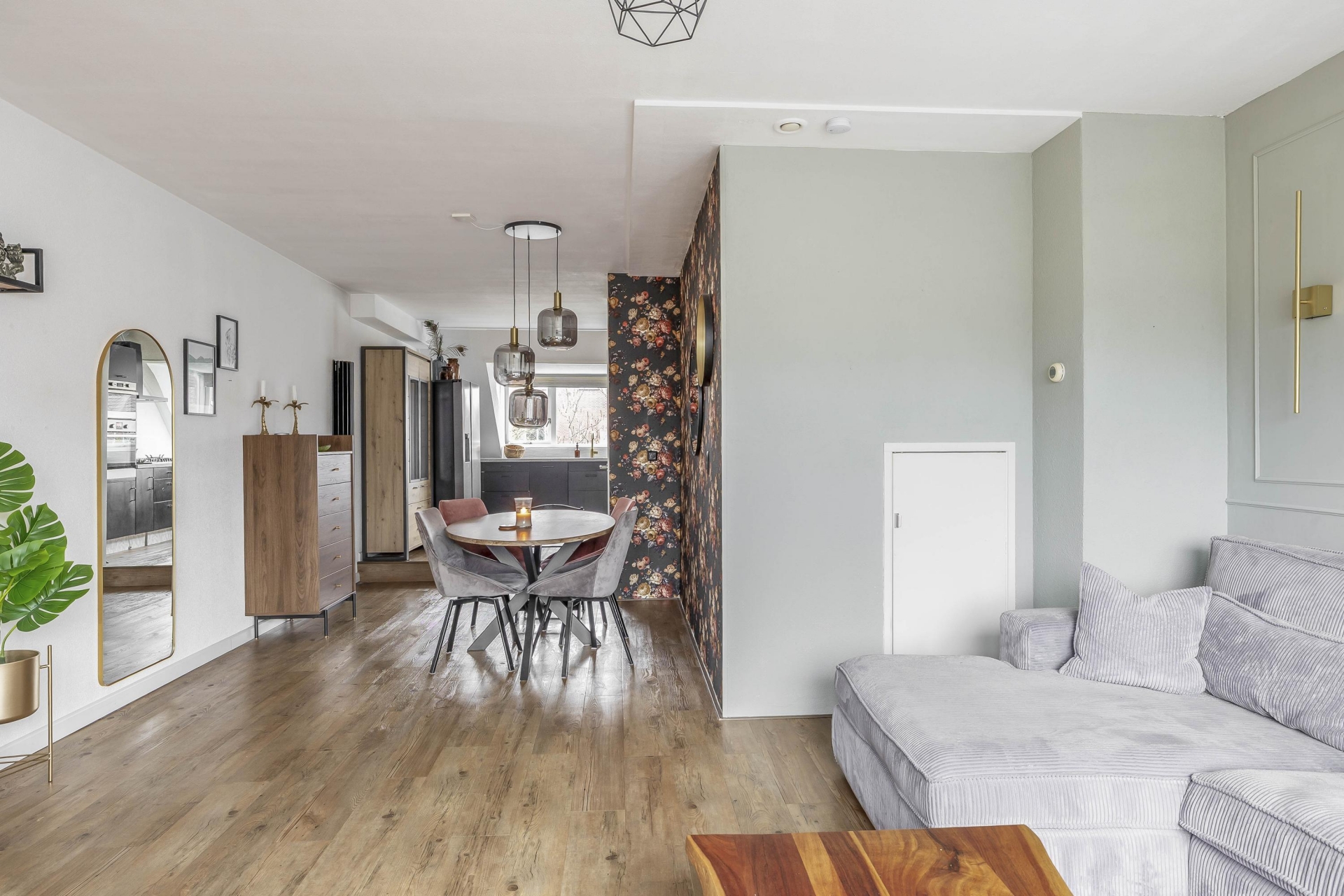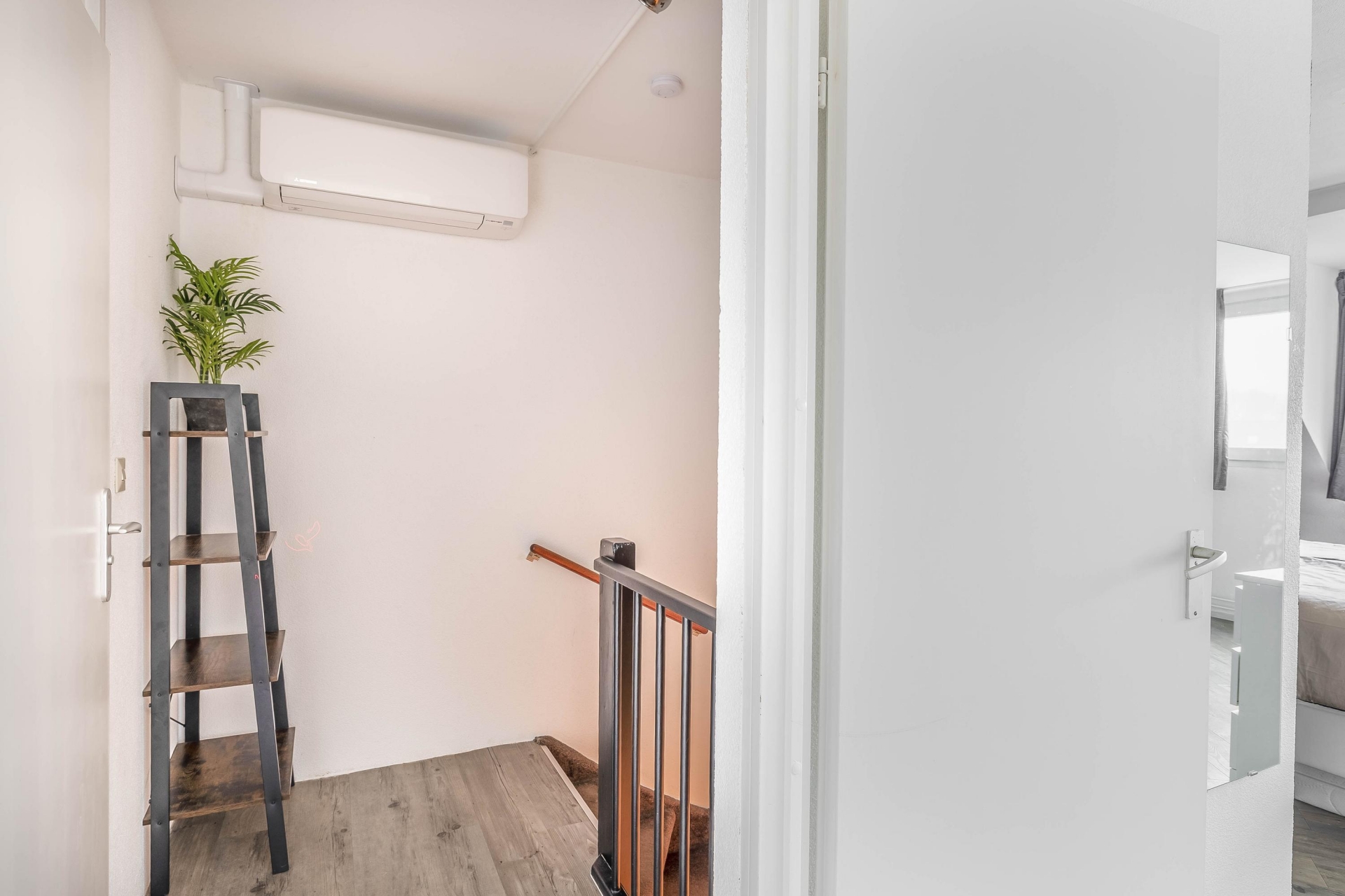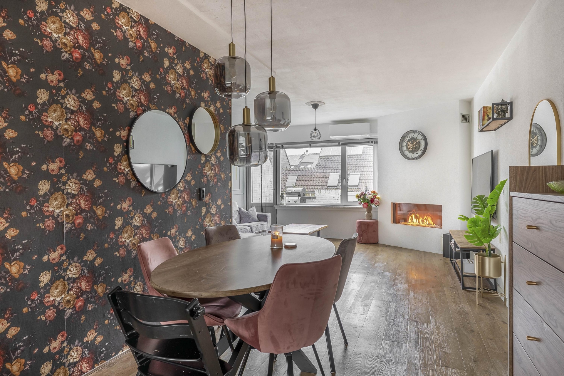 De eerste woonlaag is verrassend ruim en strak afgewerkt, met een warme houten vloer en lichte wanden die zorgen voor een prettige sfeer. De woonkamer voelt open en uitnodigend aan, met genoeg plek voor een gezellige zithoek en een aparte eethoek. Blikvanger is de sfeervolle gashaard, perfect voor koude avonden of gewoon voor wat extra gezelligheid. En ook in de zomer zit je hier en boven comfortabel, want in 2025 zijn er airco's geplaatst waarmee je het hele jaar door een aangenaam binnenklimaat hebt.