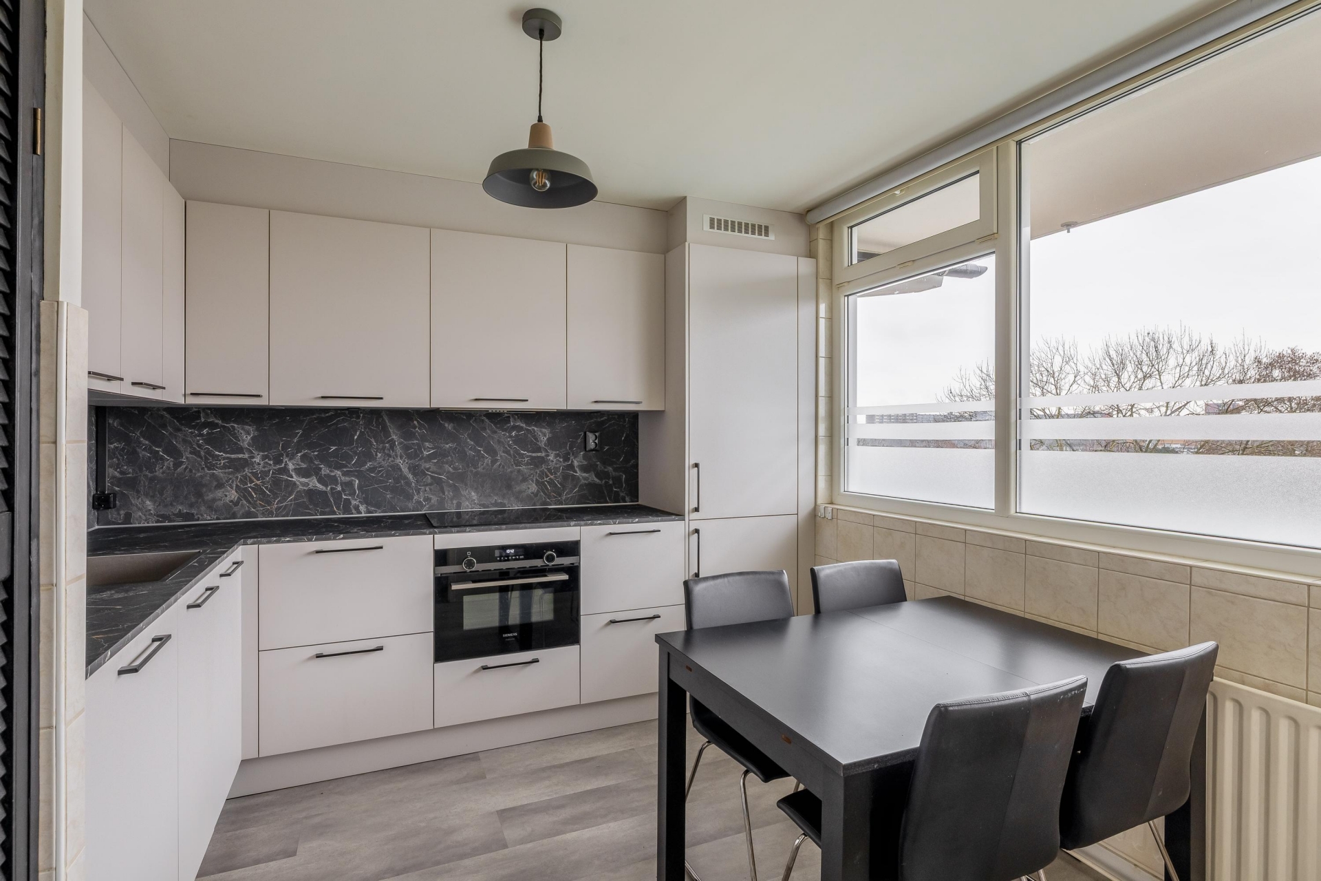 Aan de voorzijde bevindt zich de moderne keuken, uitgevoerd in een lichte kleurstelling en voorzien van diverse inbouwapparatuur. Door de royale opzet is er bovendien voldoende ruimte voor een eettafel, waardoor dit echt een prettige plek is om samen te koken en te eten.