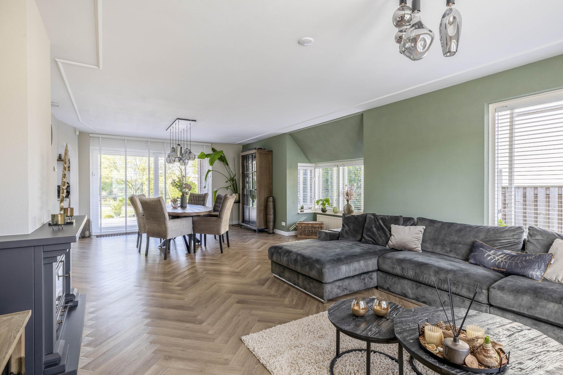 - Royale living met visgraat vloer en haard;