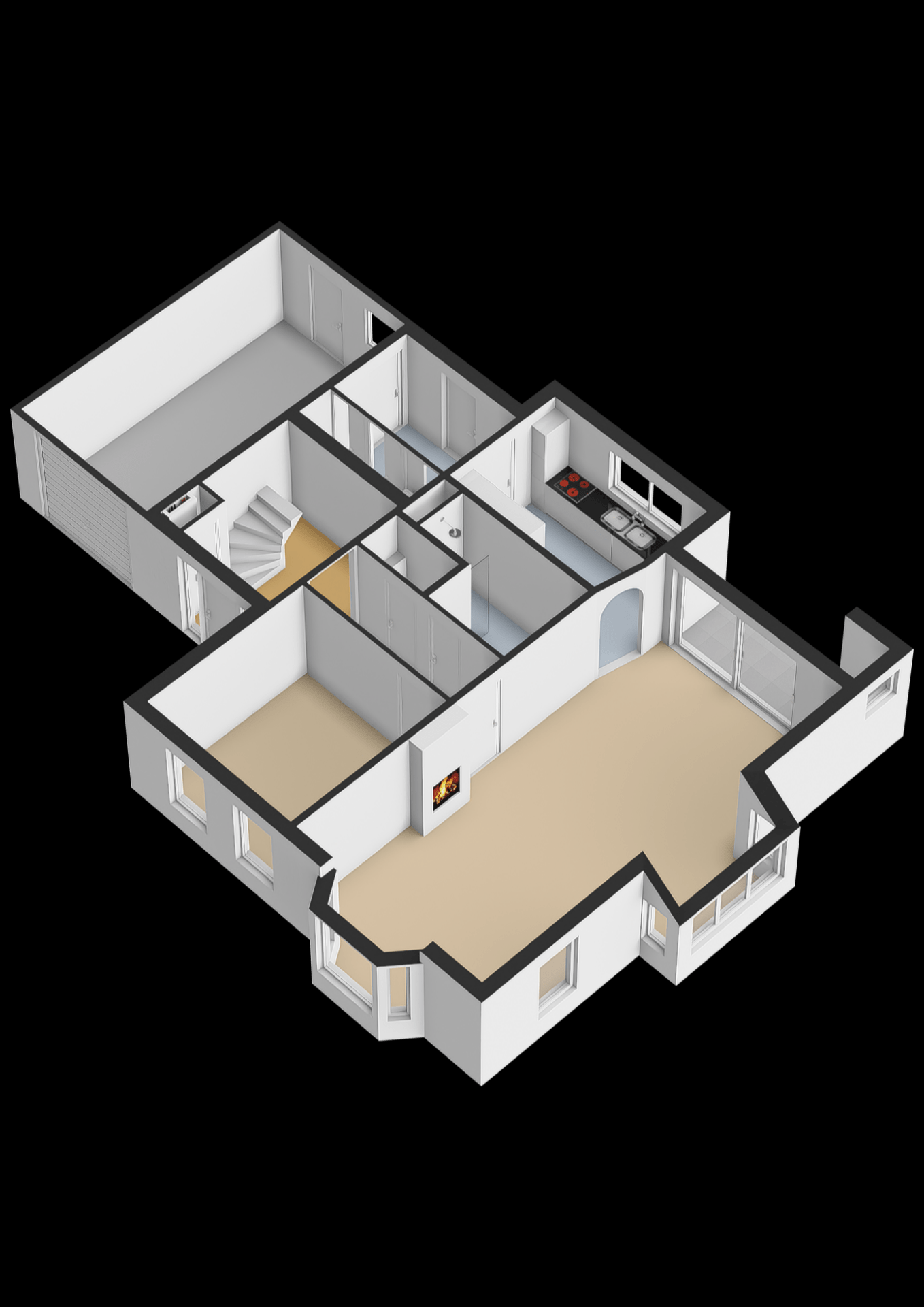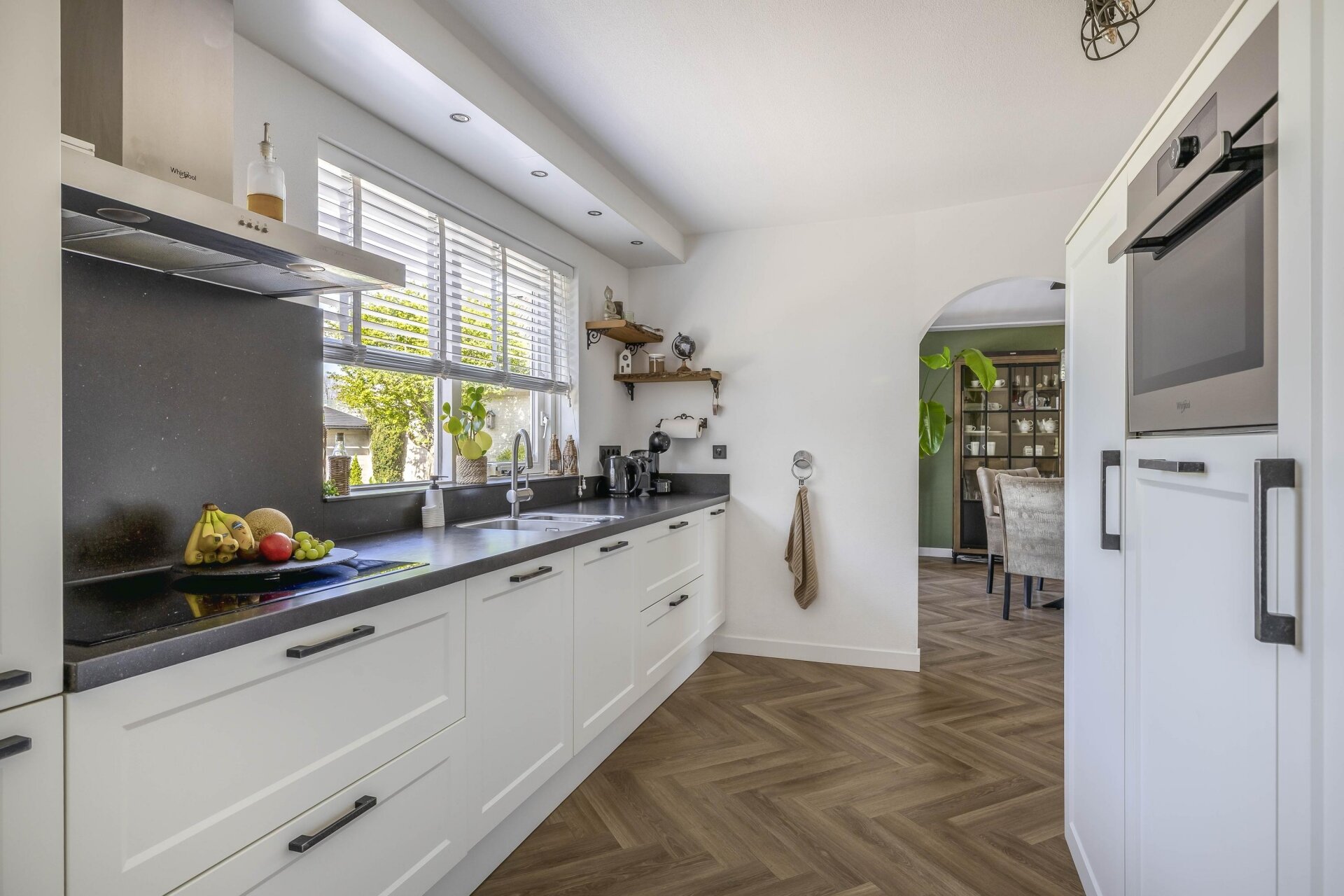 Vanaf het eerste moment voelt dit huis ruim en verzorgd aan. De woonkamer is sfeervol en afgewerkt met een moderne visgraatvloer en een gezellige haard. Grote raampartijen en een speelse erker zorgen voor een fijne lichtinval. Aan de achterzijde opent een grote glazen schuifpui naar het terras en de tuin, perfect voor binnen-buiten leven. De keuken is modern uitgevoerd en voorzien van diverse inbouwapparatuur, zoals een 5-pits inductiekookplaat met afzuigkap, koelkast, vriezer, combi-oven en vaatwasser. Vanuit de keuken kijk je uit over het groene achtererf. Aansluitend is er een praktische bijkeuken met wasmachineaansluiting, extra opbergruimte en toegang tot zowel de inpandige garage als de tuin. De garage, ca. 22 m², is volledig geïsoleerd, verwarmd en voorzien van een loopdeur naar buiten, ideaal als hobbyruimte of thuiskantoor.