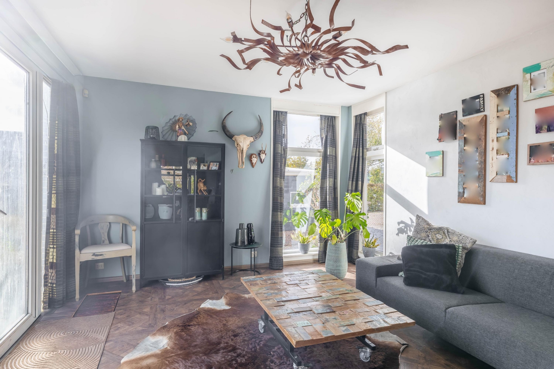 Een brede 3 trede trap vanuit de keuken leidt naar de woonkamer, wat zorgt voor een speelse en open indeling. De woonkamer is onderverdeeld in een eetgedeelte en een zitgedeelte, die samen een riant oppervlak van circa 38 m² beslaan. Dankzij de royale afmetingen is er volop ruimte voor een grote eettafel en een comfortabele zithoek. De grote ramen op het zuiden zorgen bovendien voor veel natuurlijk licht, wat de ruimte een warme en uitnodigende sfeer geeft. In deze ruimte zit een luik die toegang verschaft via een wenteltrap aan de kelderkamer (12 m2) met een groot raam naar de achtertuin.
